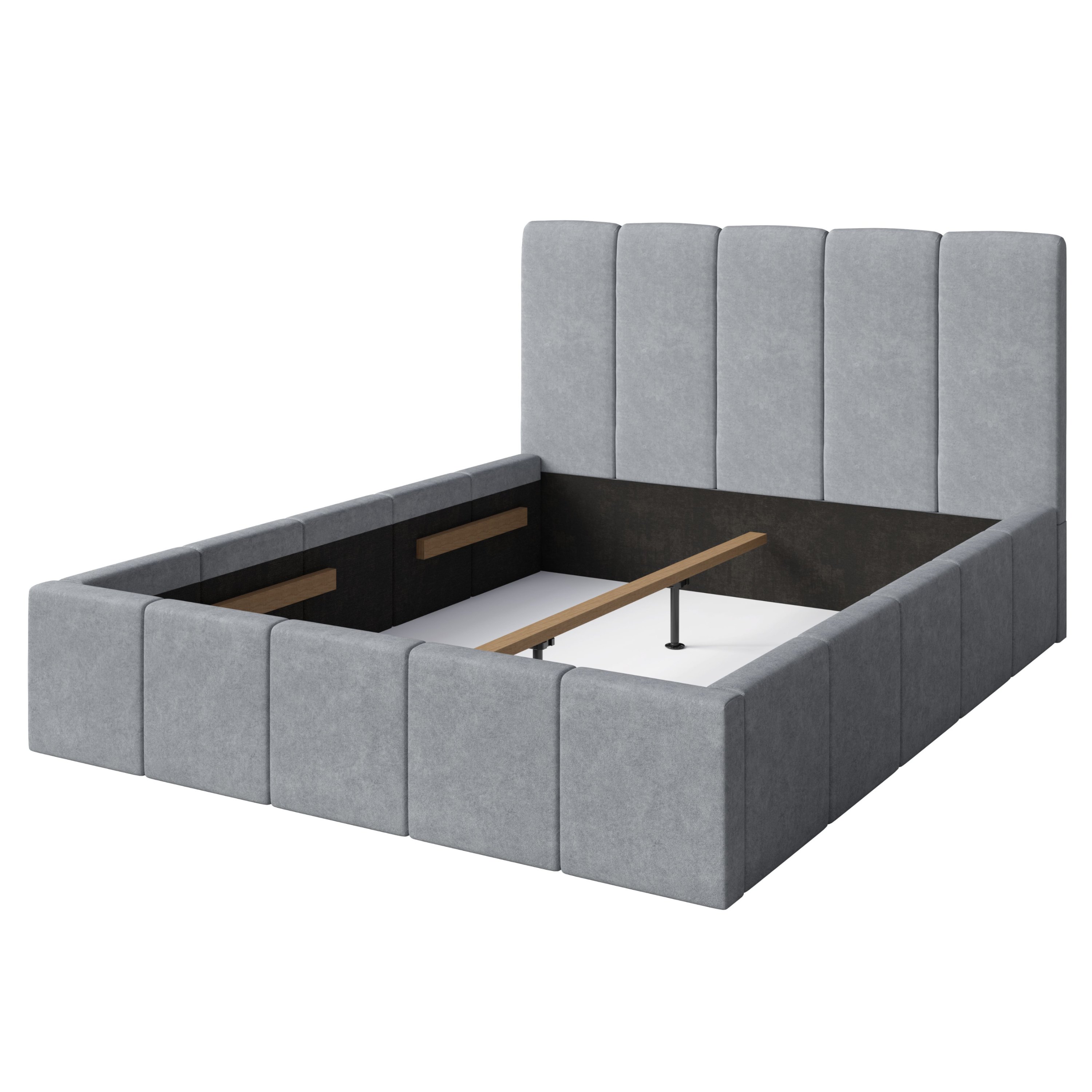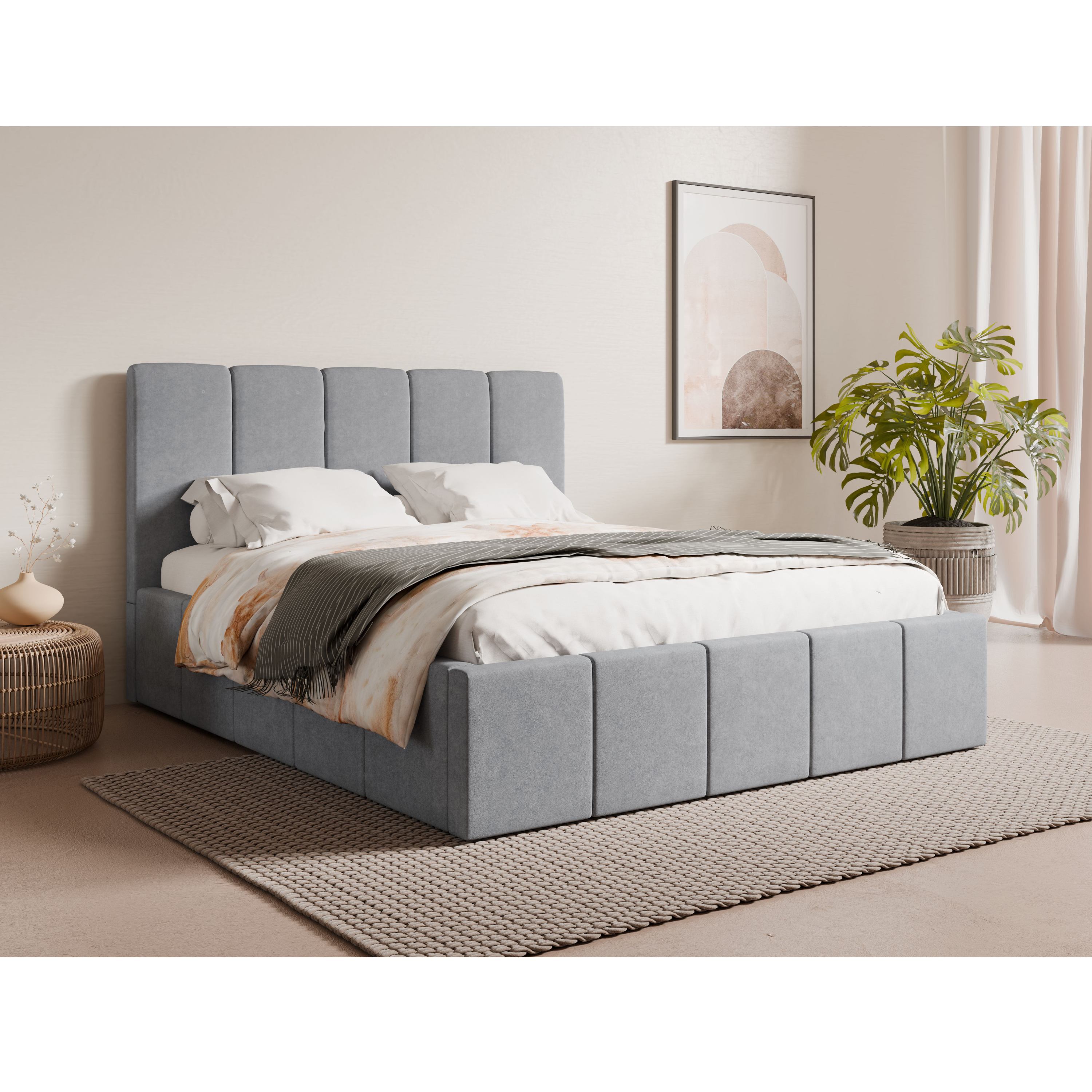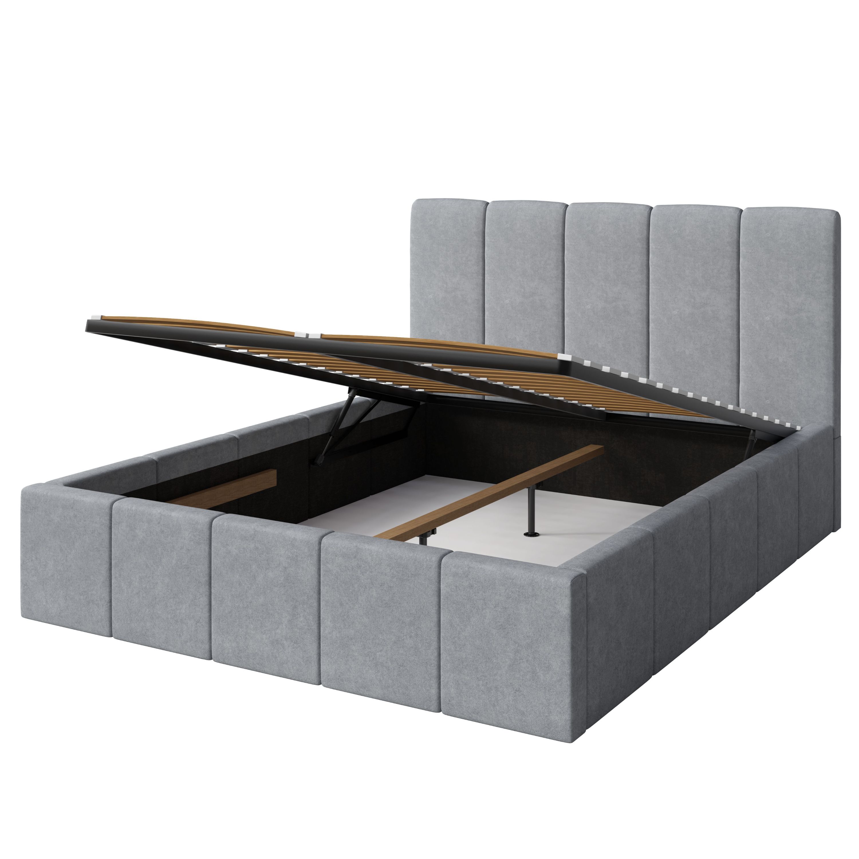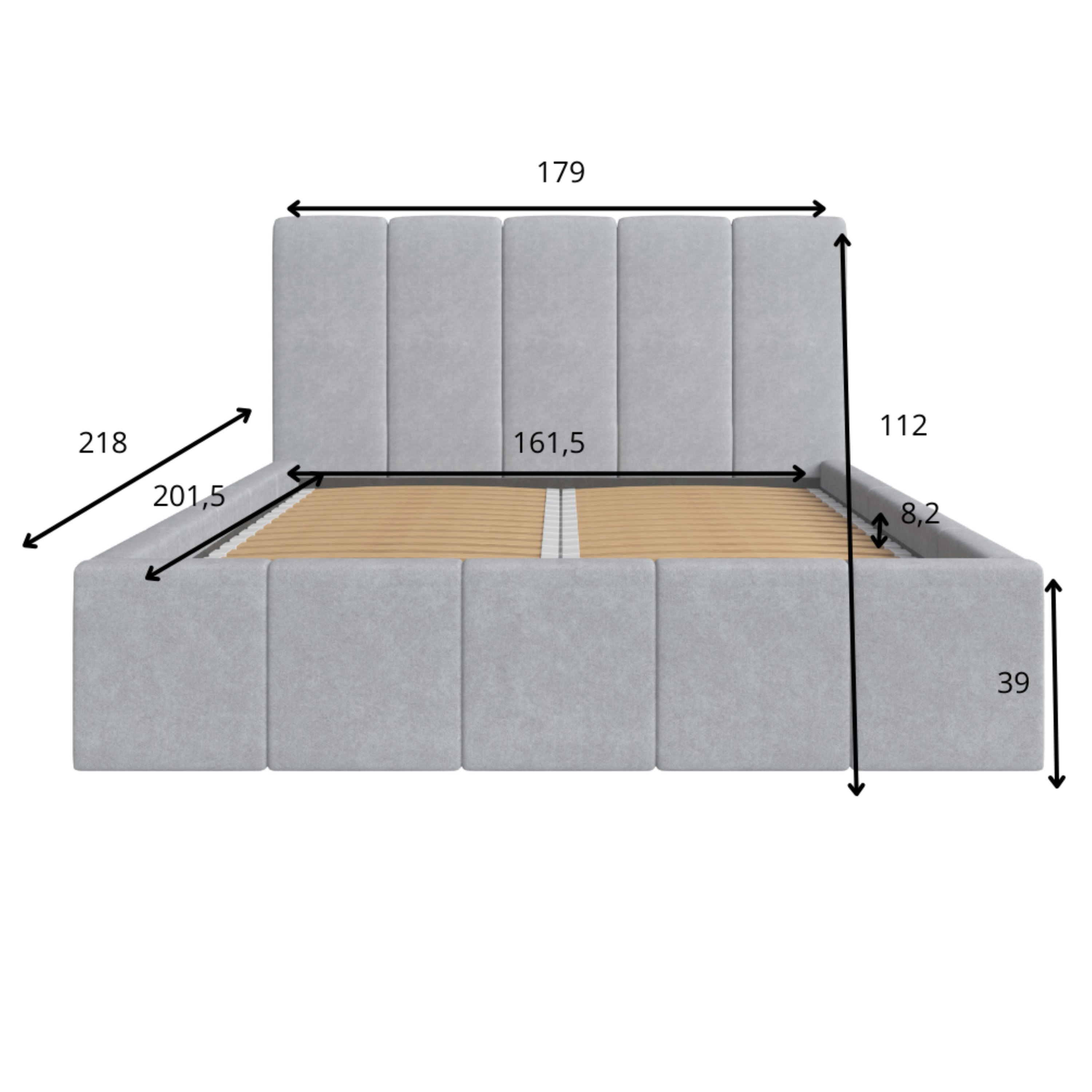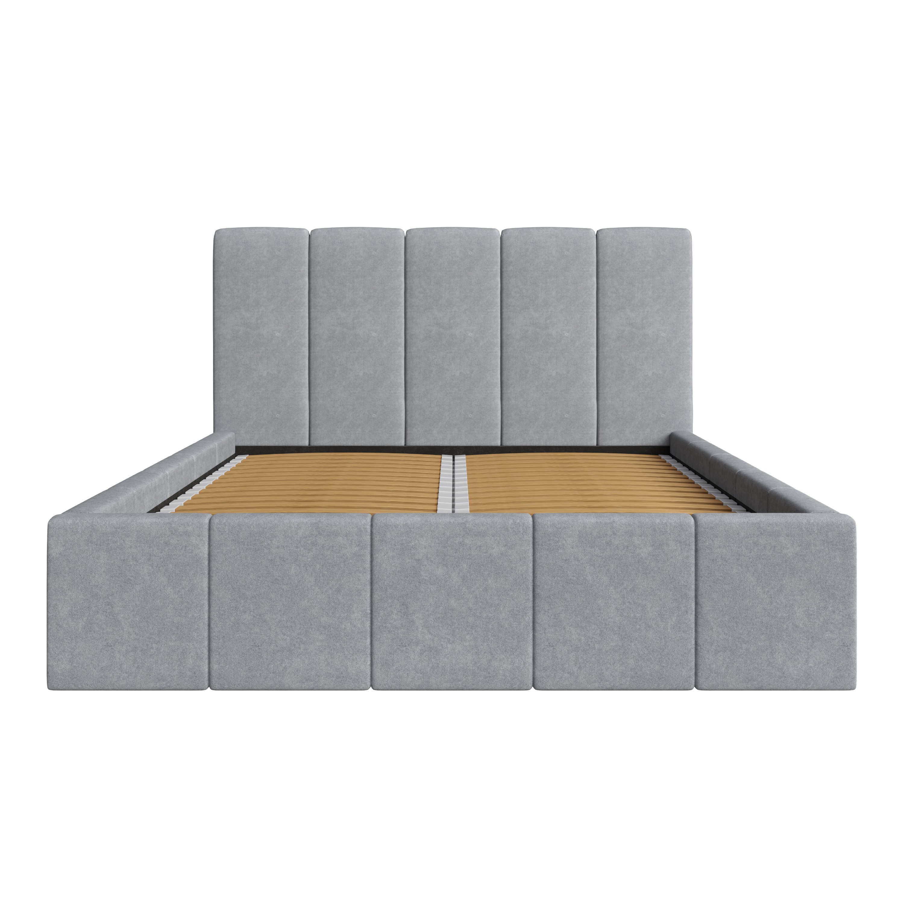 Její konstrukce je čalouněna na dotek příjemnou, měkkou tkaninou v neutrálním šedém provedení, které snadno sladíte s dalším vybavením místnosti. Dominantním prvkem postele je prostorné vysoké čelo, které kromě dekorativní funkce umožňuje také komfortní opření hlavy během relaxace. Postel je dodávána včetně lamelového roštu s čelním výklopem, který zajišťuje snadný přístup do úložného prostoru v rámu postele. Pro zajištění potřebné opory ložné plochy je navíc postel vybavena středovým nosníkem.