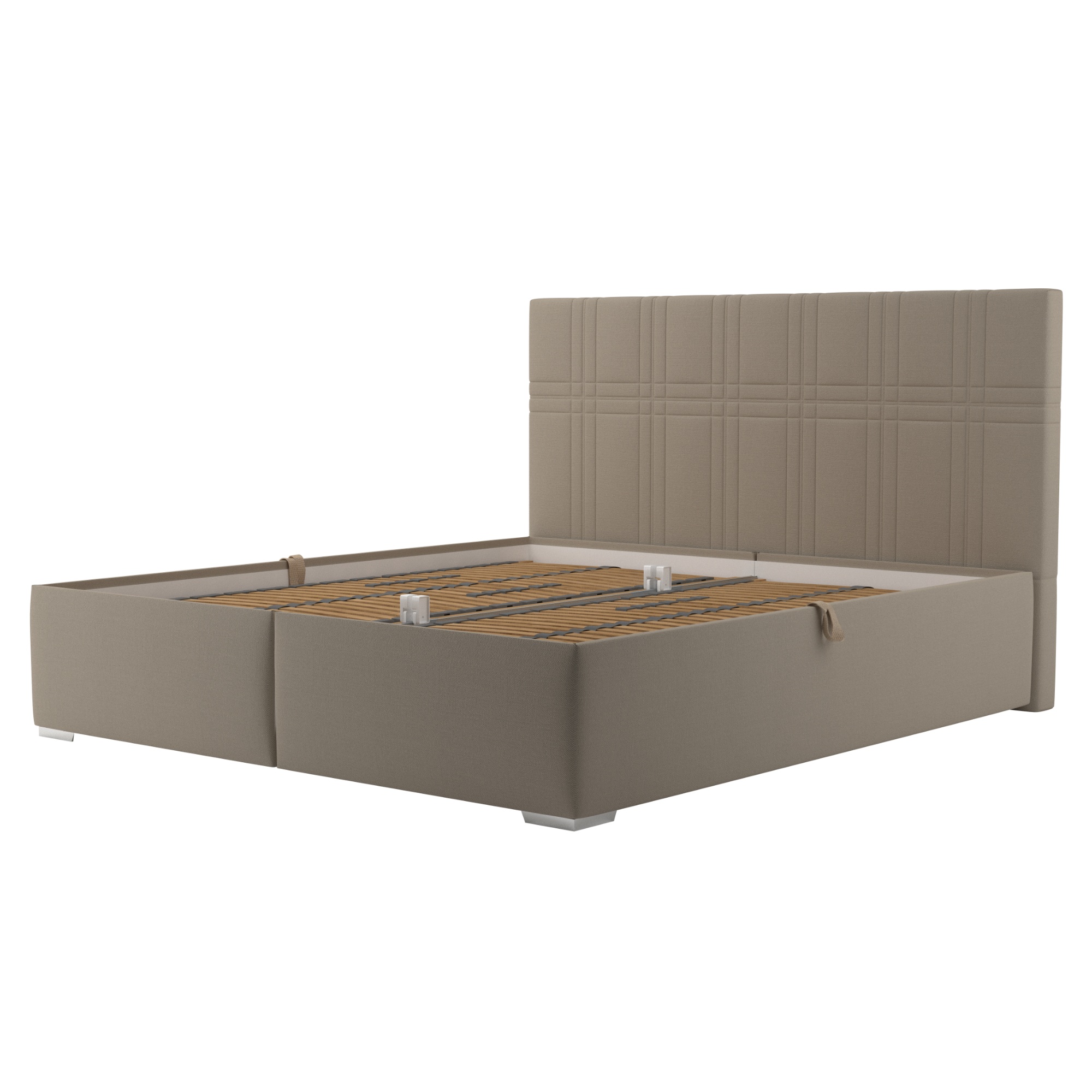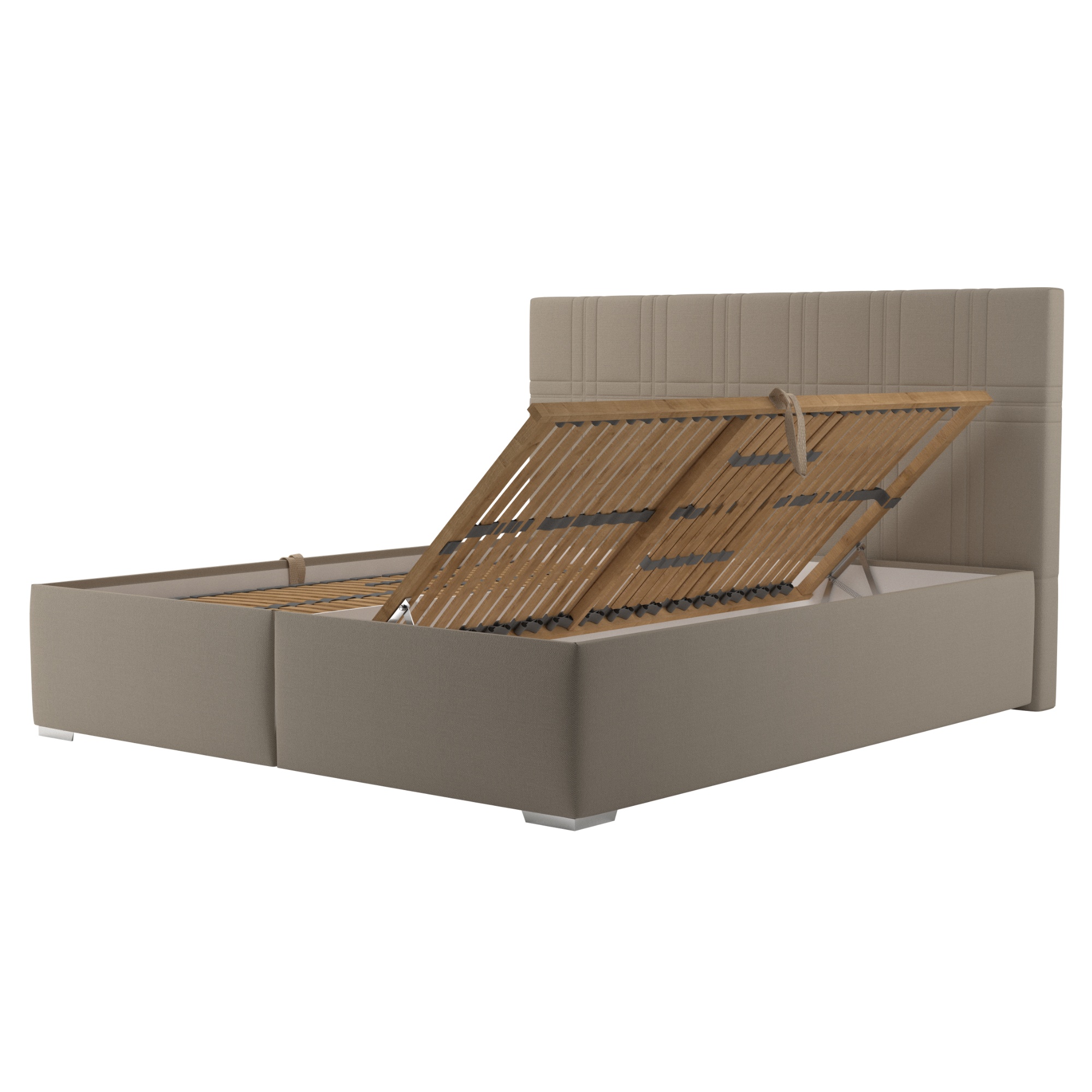 Konstrukce je potažena hladkou, měkkou a na dotek příjemnou tkaninou z mikrovlákna. Vysoké čelo s decentním prošíváním je ideální pro komfortní opření během večerního odpočinku. Ložná plocha o velikosti 180x200 cm je na každé straně vybavena lamelovým roštem s praktickým bočním výklopem. Oba rošty snadno vyklopíte a otevřete tak úložný prostor ukrytý v rámu postele. Celou konstrukci doplňují nižší nožky, které posteli dodávají potřebnou stabilitu.