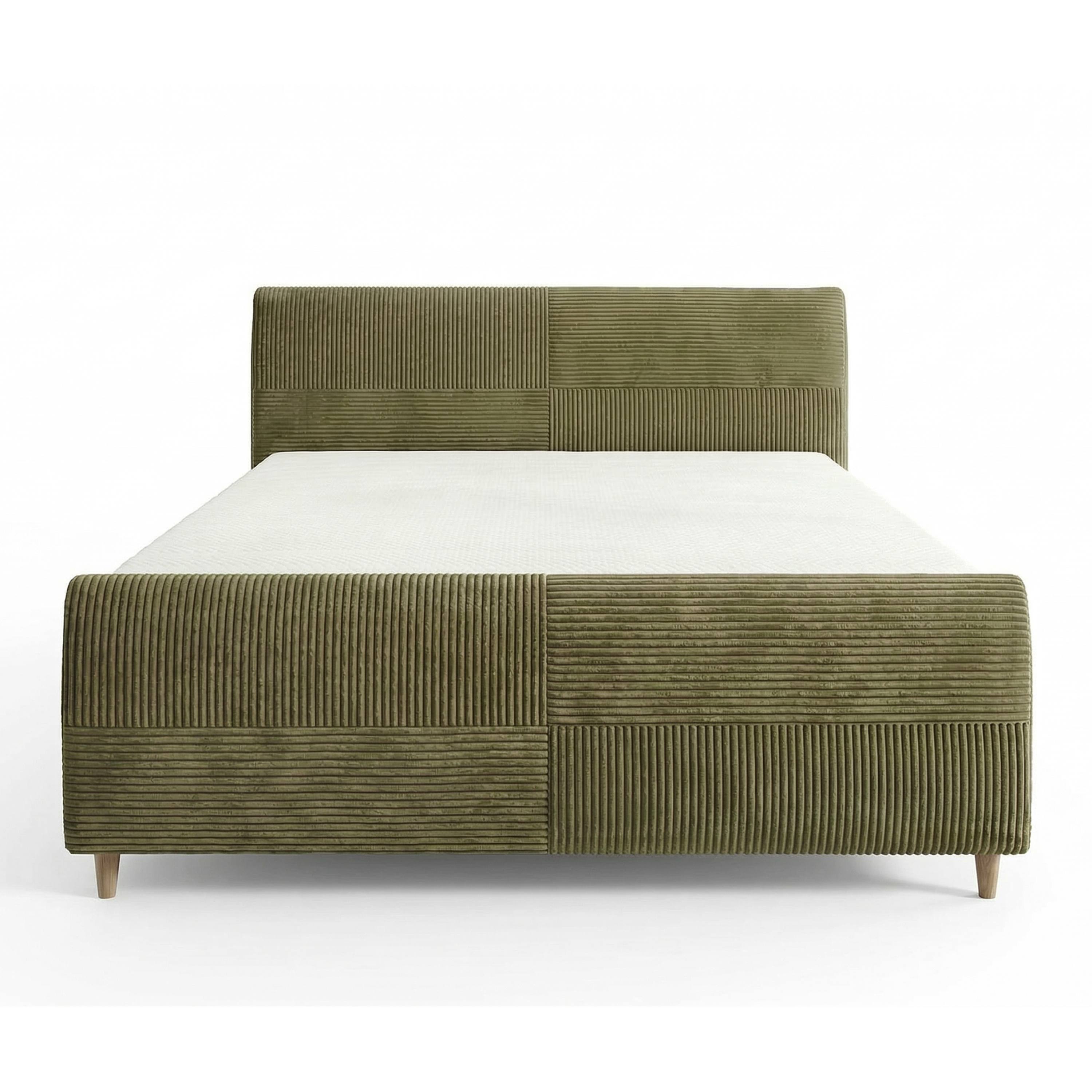 Její konstrukce je čalouněna na dotek příjemnou tkaninou s žebrováním v jednobarevném provedení. Vysoké čelo postele umožňuje dopřát si komfortní opření během relaxace. Postel je dodávána včetně lamelového roštu zasazeného do kovového rámu. Čelní výklop potom umožňuje snadný přístup do úložného prostoru.