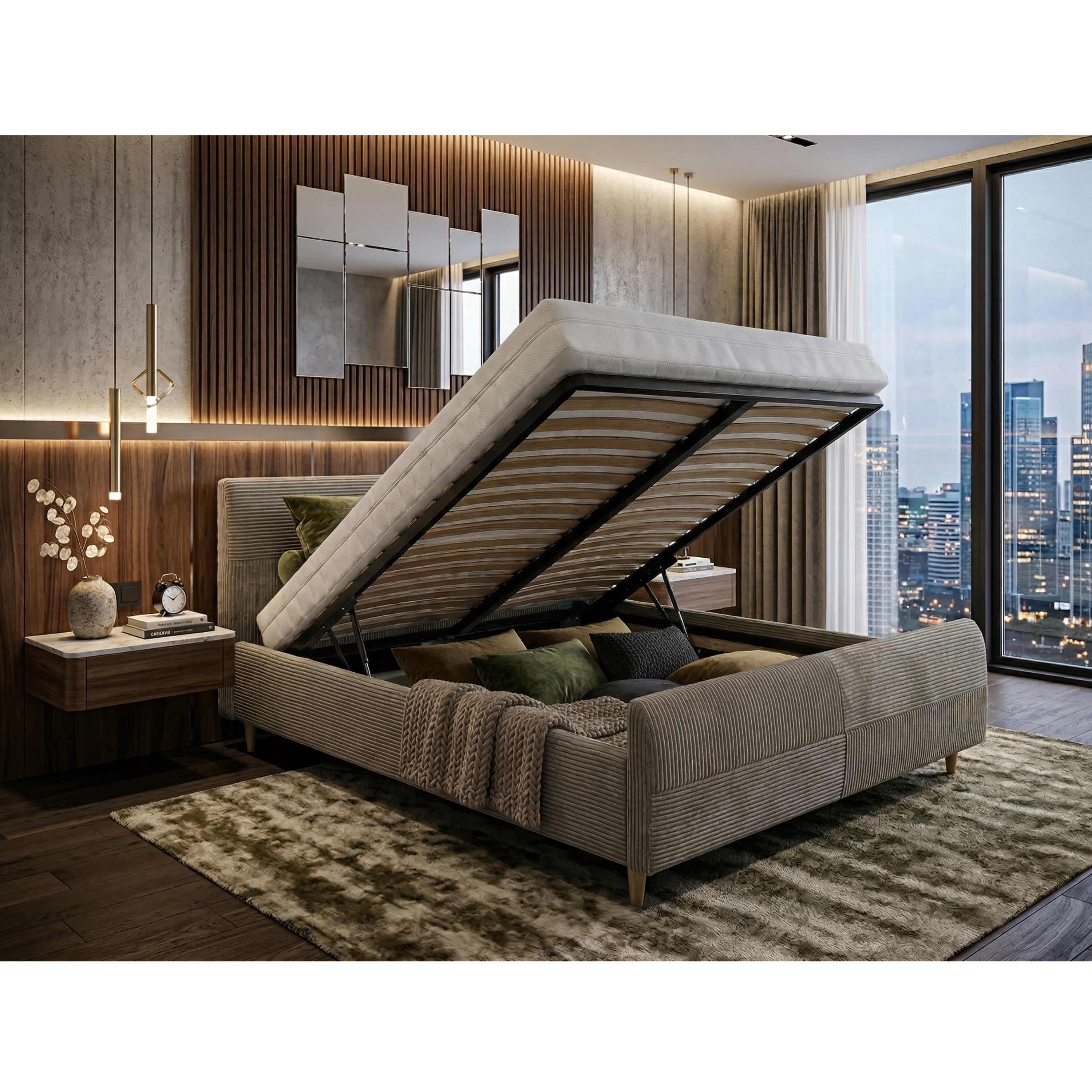 Její konstrukce je čalouněna na dotek příjemnou tkaninou s žebrováním v jednobarevném provedení. Vysoké čelo postele umožňuje dopřát si komfortní opření během relaxace. Postel je dodávána včetně lamelového roštu zasazeného do kovového rámu. Čelní výklop potom umožňuje snadný přístup do úložného prostoru.