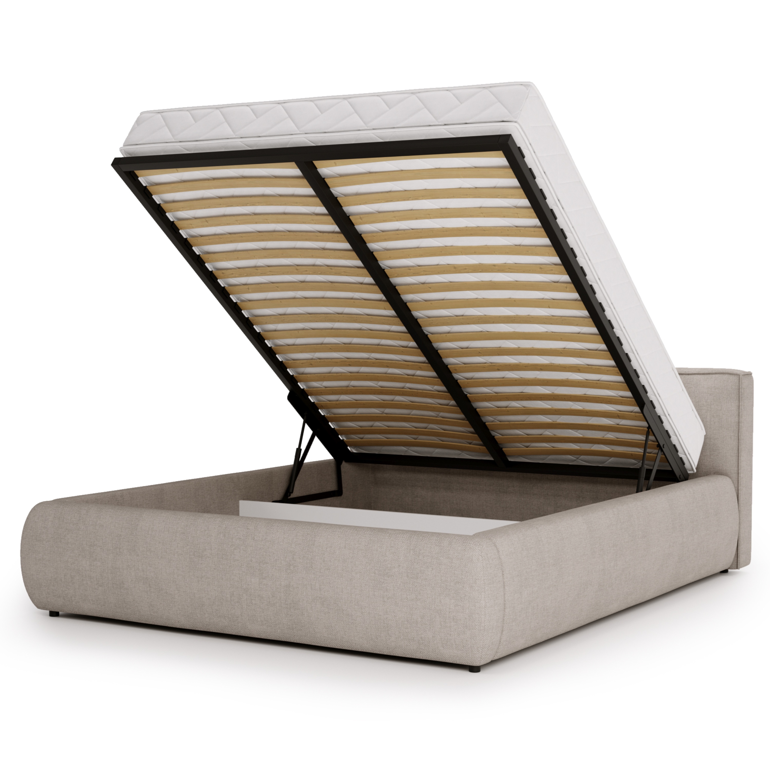 Pro skladování aktuálně nepoužívaných lůžkovin a dalších předmětů můžete využít úložný prostor v rámu postele, který je snadno přístupný díky čelnímu výklopu kovového rámu s lamelovým roštem. Matrace není součástí balení a je nutné ji dokoupit samostatně.