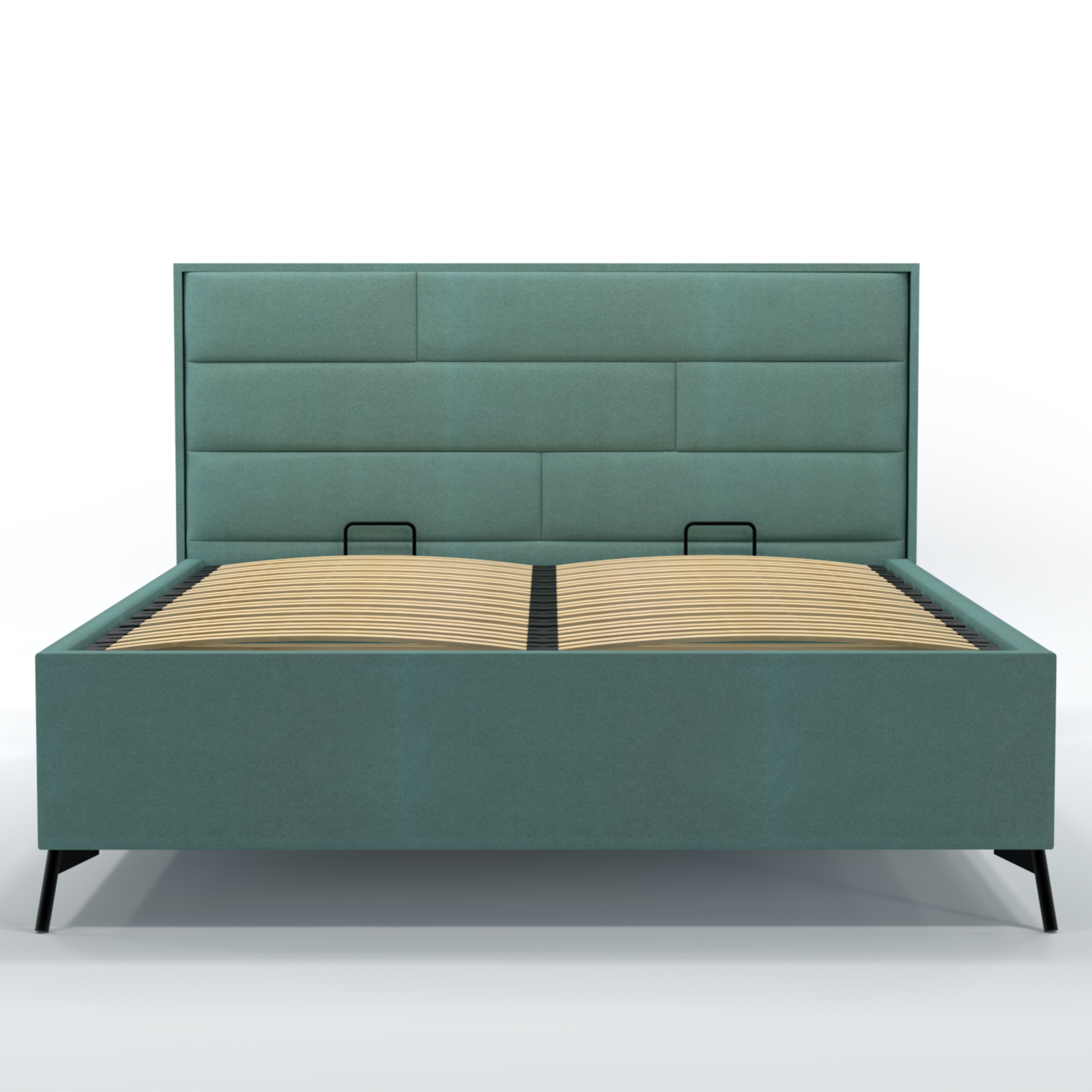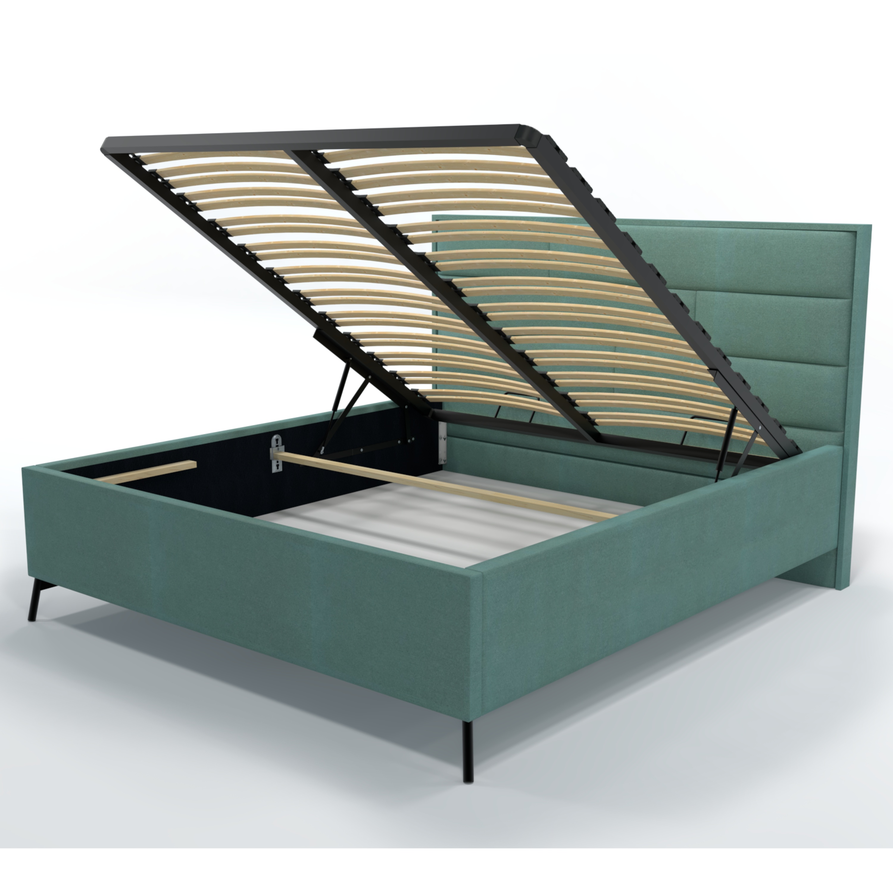 Dominantním prvkem postele je vysoké čelo, které mimo estetické funkce umožňuje dopřát si komfortní opření během relaxace. Postel je dodávána včetně lamelového roštu zasazeného do kovového rámu. Čelní výklop potom umožňuje snadný přístup do úložného prostoru pod ložnou plochou.