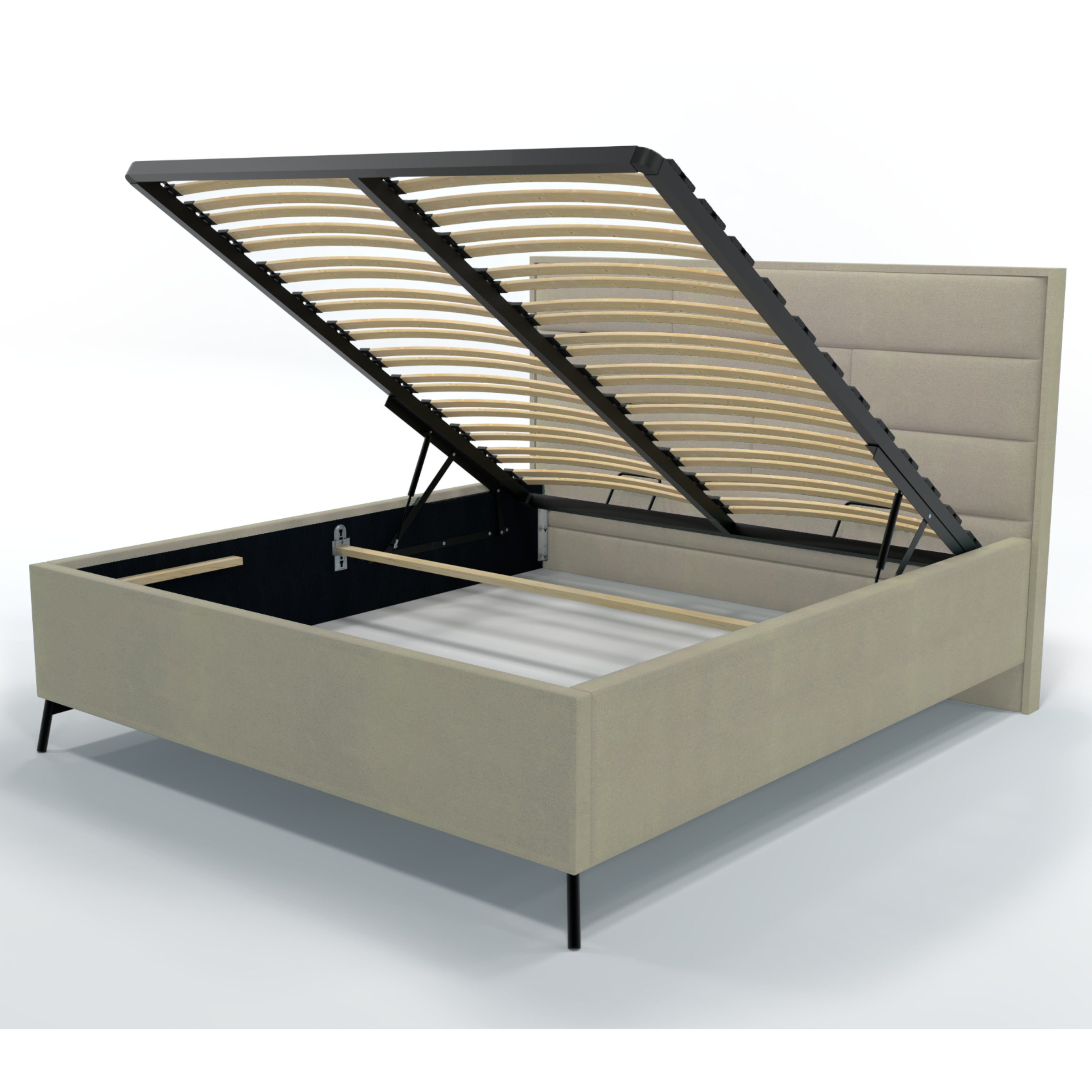Dominantním prvkem postele je vysoké čelo, které mimo estetické funkce umožňuje dopřát si komfortní opření během relaxace. Postel je dodávána včetně lamelového roštu zasazeného do kovového rámu. Čelní výklop potom umožňuje snadný přístup do úložného prostoru pod ložnou plochou.
