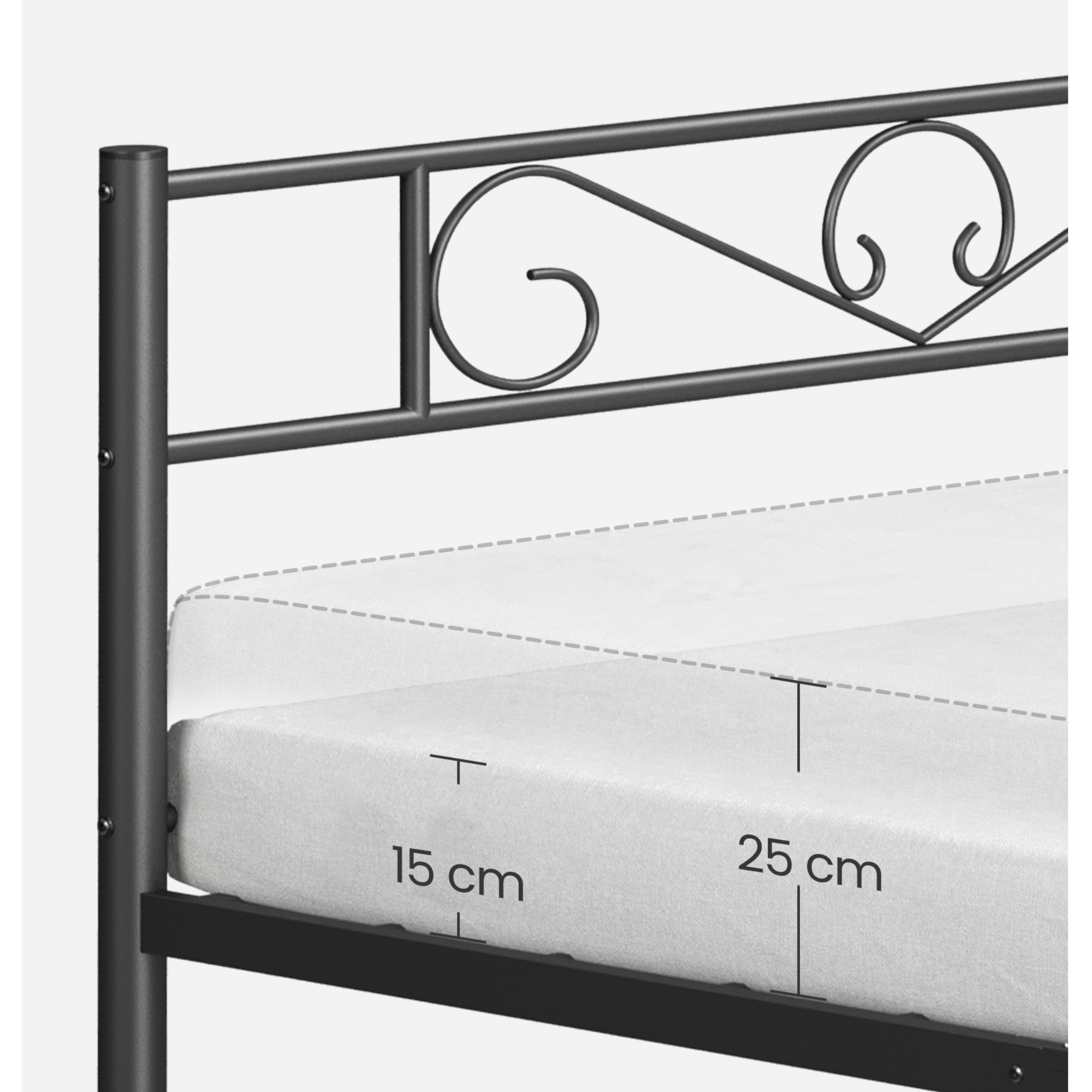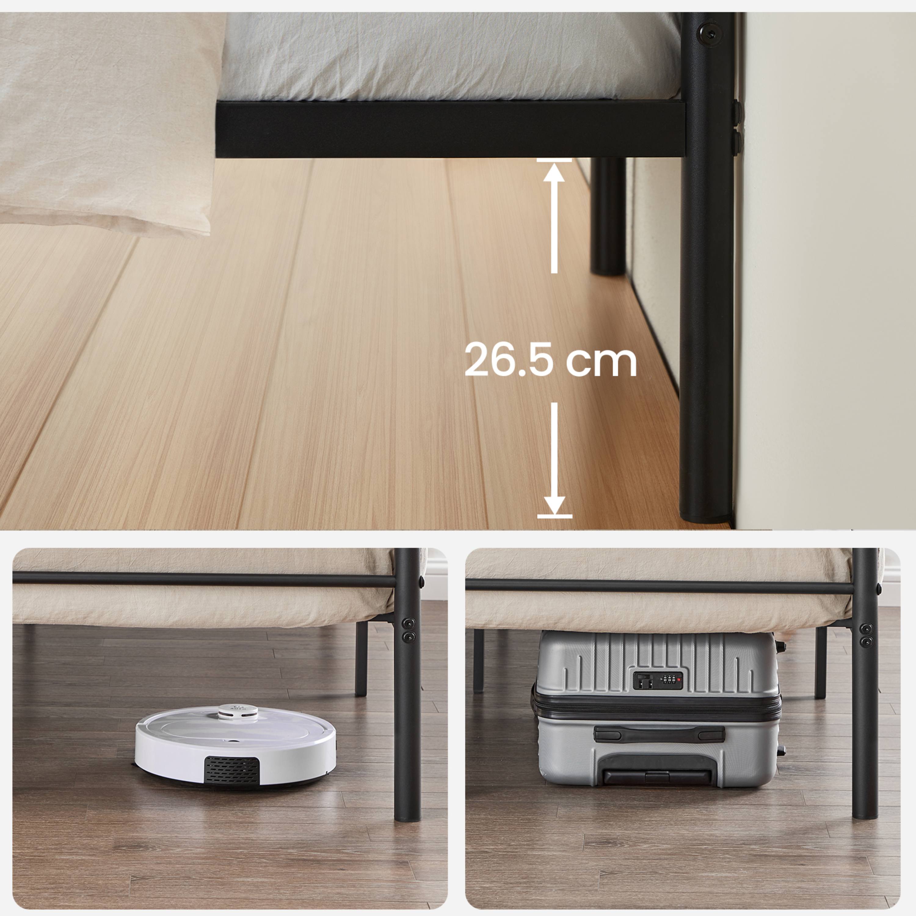 Konstrukce je vyrobena z práškově lakovaného kovu, který zajišťuje pevnost, odolnost a snadnou údržbu. Stabilitu podporuje 6 nohou, které rovnoměrně rozkládají zátěž. Ty jsou navíc opatřeny protiskluzovými podložkami, které ochrání podlahu před poškrábáním. Výhodou je také dostatek prostoru pod postelí, který umožňuje skladování úložných boxů a také snadný úklid. Postel je dodávána včetně integrovaného roštu, ale matraci je nutné dokoupit samostatně.