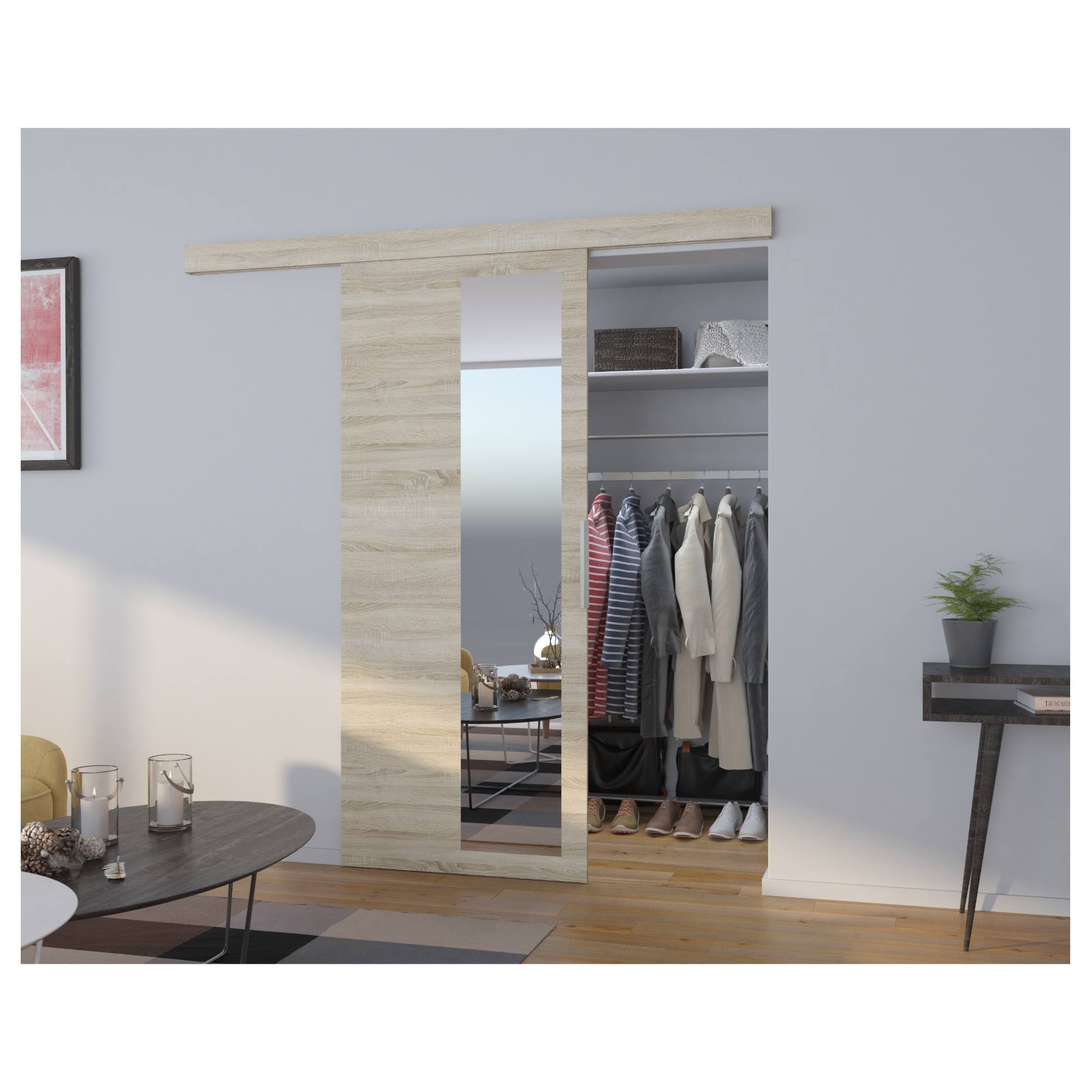 Vyrobeny jsou z laminované dřevotřískové desky, která se vyznačuje snadnou údržbou. Posuvný systém s kovovými ložisky zajišťuje hladké a tiché otevírání, zatímco praktická úchytka umožňuje pohodlnou manipulaci. Dveře lze podle potřeby namontovat na pravou i levou stranu. Díky posuvnému mechanismu navíc šetří místo a opticky nezmenšují prostor.