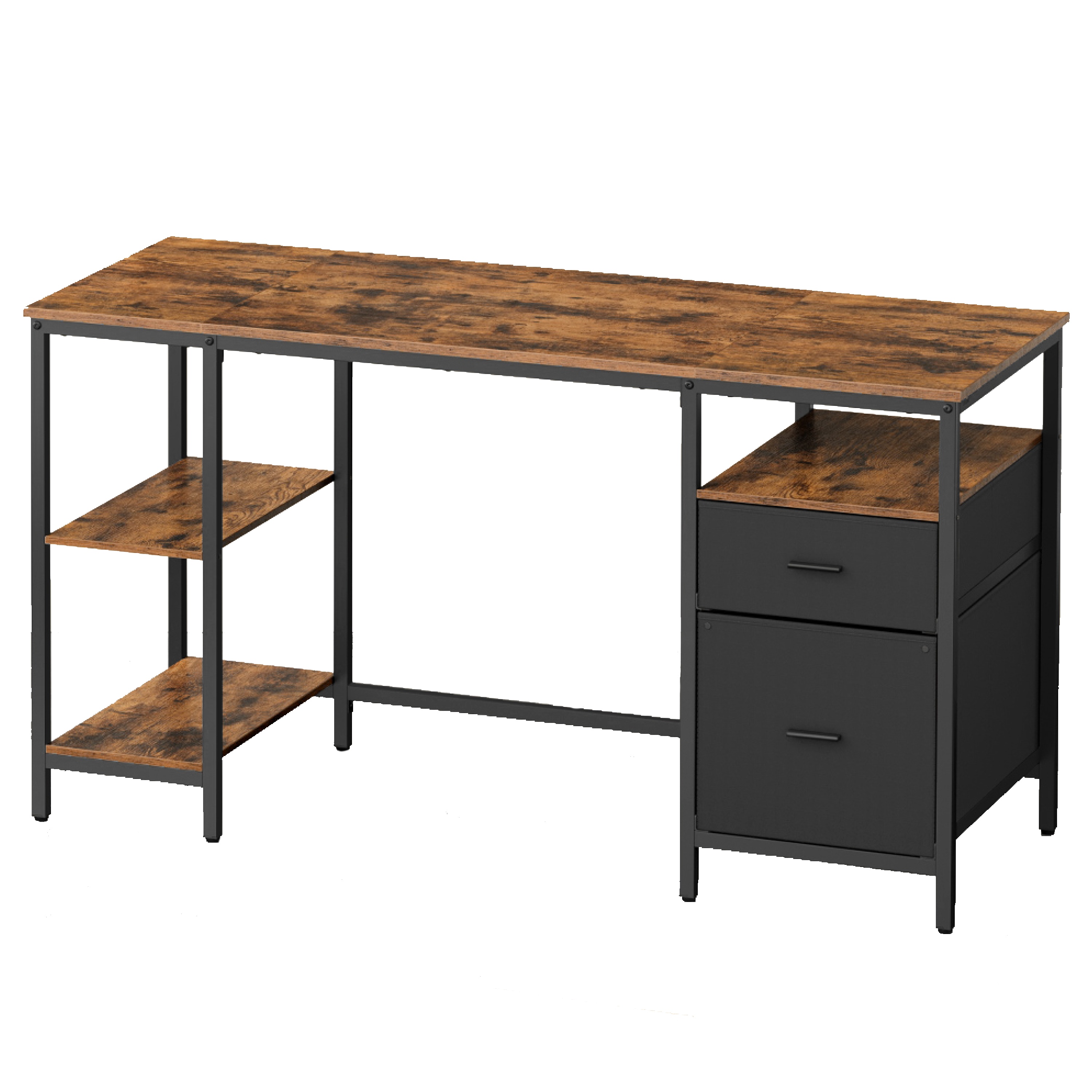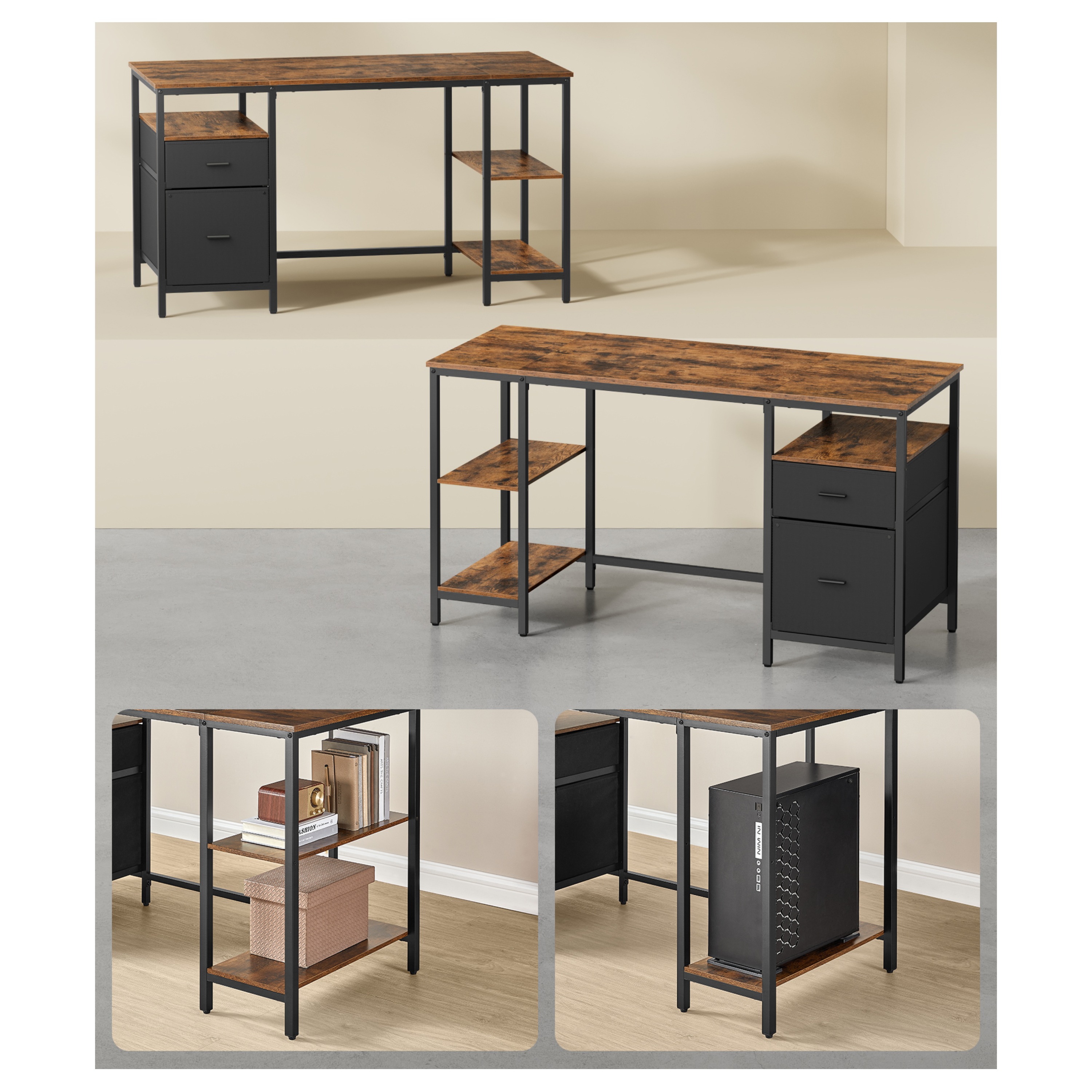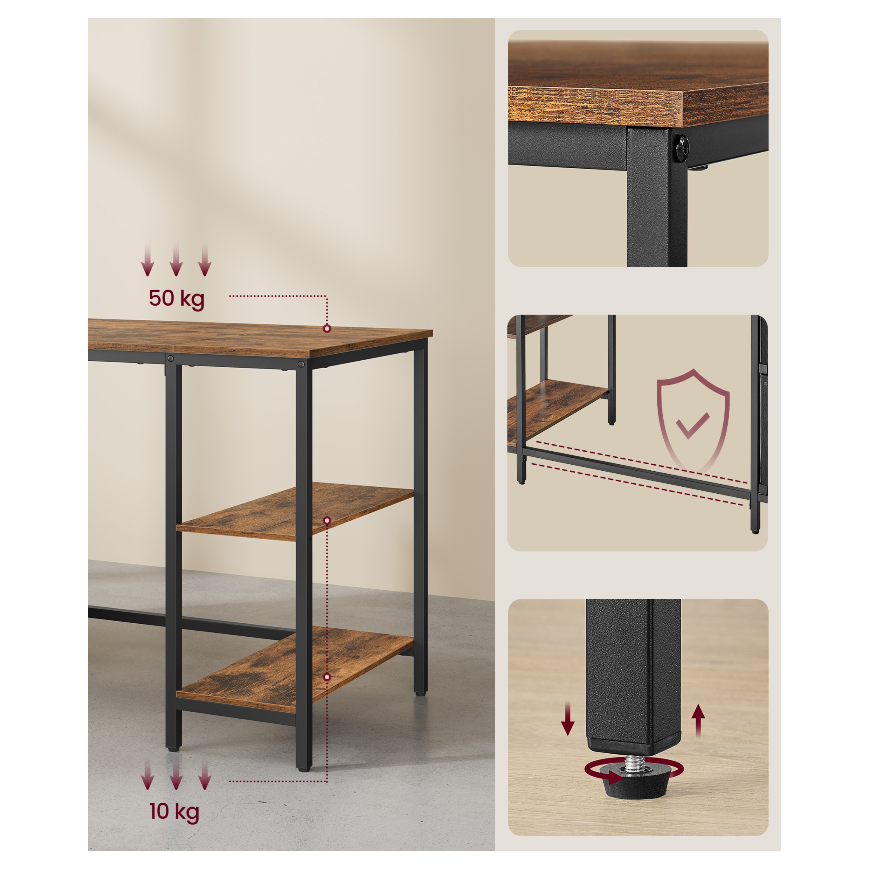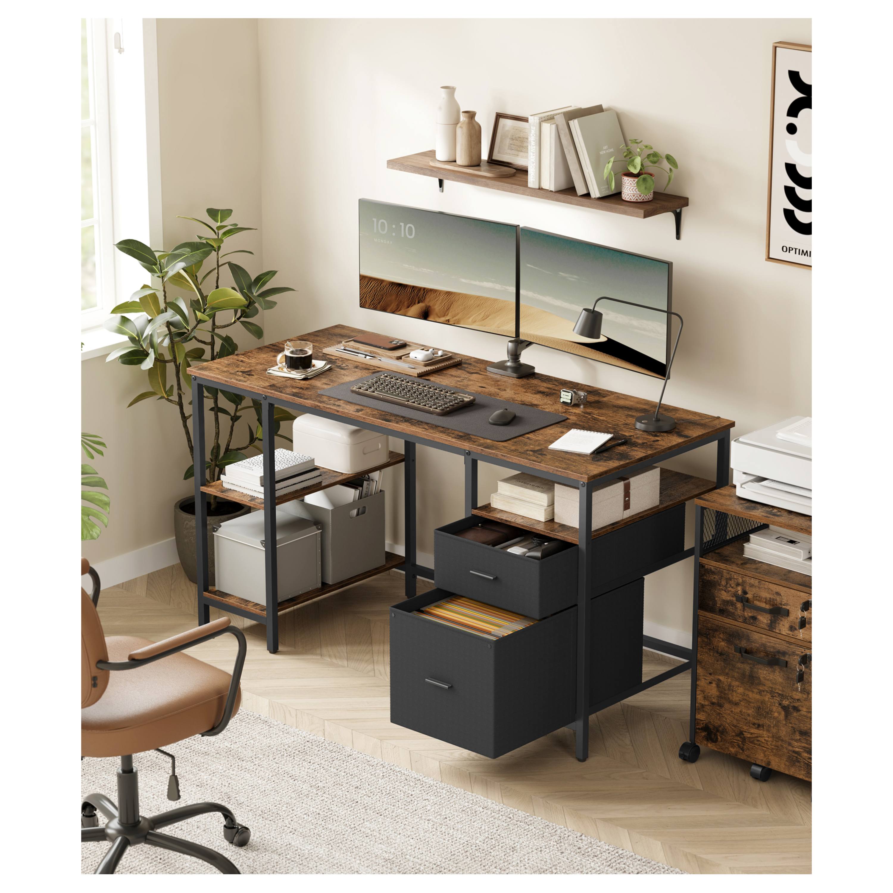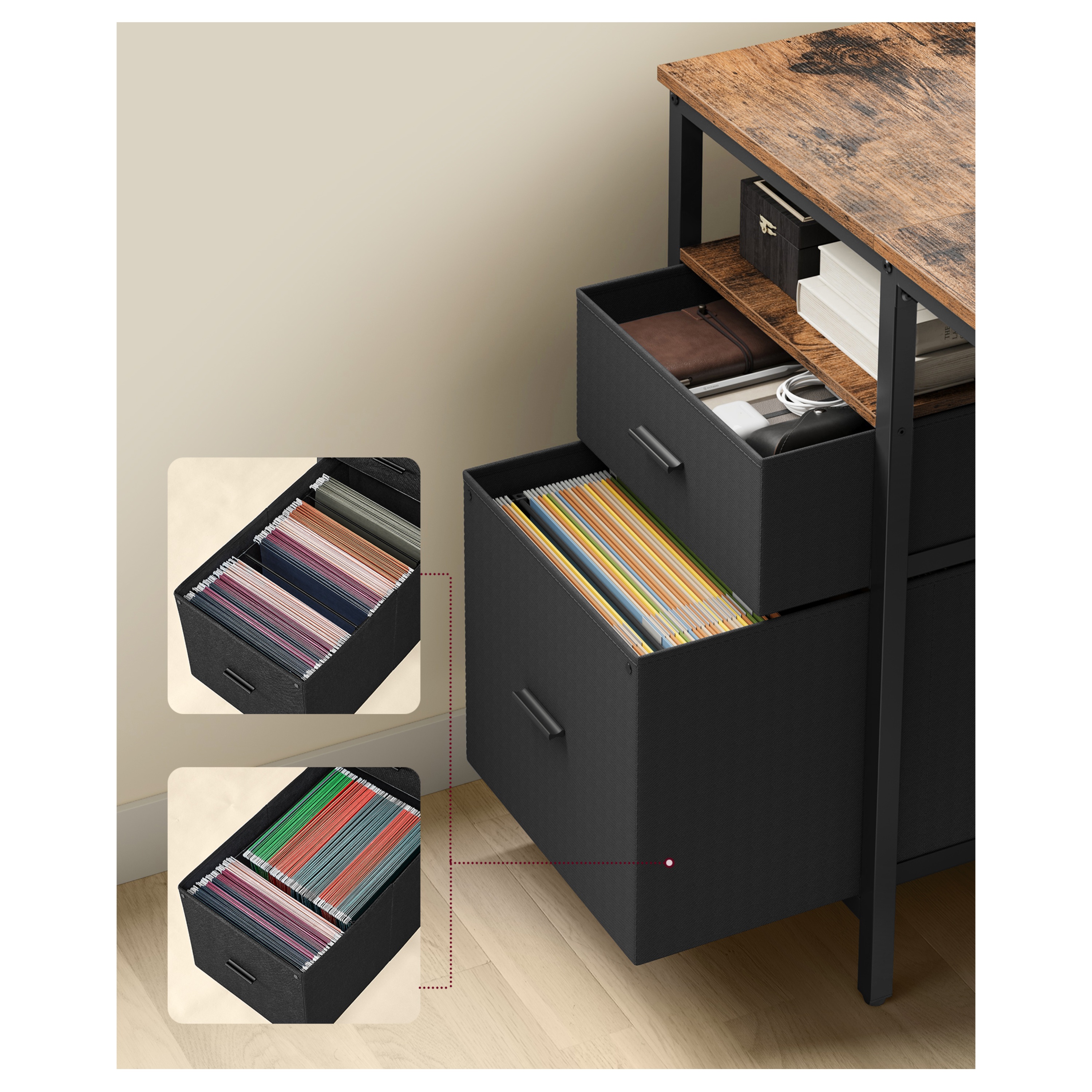 Disponuje 3 policemi pro uložení všeho, co potřebujete mít po ruce. Dále je vybaven 2 zásuvkami z textilu pro uložení kancelářských potřeb a závěsných zakládacích desek. Kovová konstrukce nohou zajišťuje stabilitu a pevnost. Pracovní deska s nosností 50 kg je vyrobena z laminované dřevotřískové desky, která se vyznačuje snadnou údržbou a svým dekorem dřeva dodává teplý přírodní prvek do místnosti. Nastavitelné nožky zajišťují stabilitu a umožňují vyrovnání nerovností podlahy.