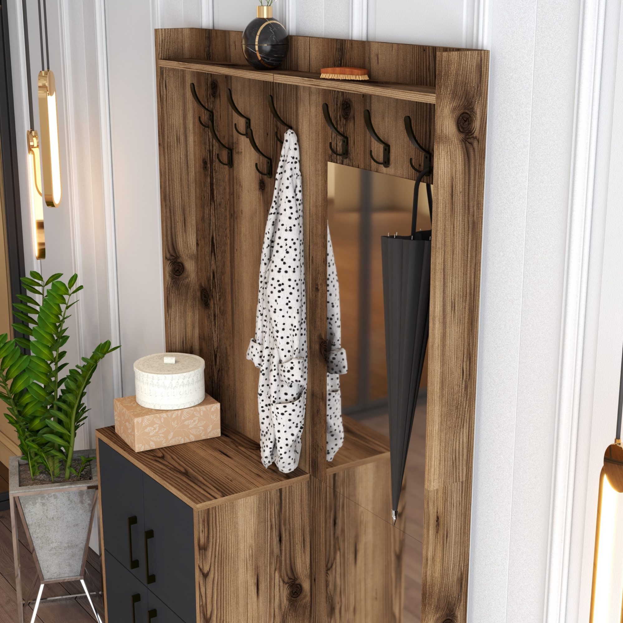Sestava nabízí dostatek úložného prostoru. Její součástí jsou 2 police, z nichž 1 se nachází za otočnými dvířky. Ta jsou pro lepší manipulaci vybavena kovovými úchyty. Nechybí ani 8 kovových dvojitých háčků, na něž si můžete pověsit oblíbené oděvy i módní doplňky, a zrcadlo, ve kterém si můžete vždy před odchodem z domova ověřit, že vypadáte bezchybně.