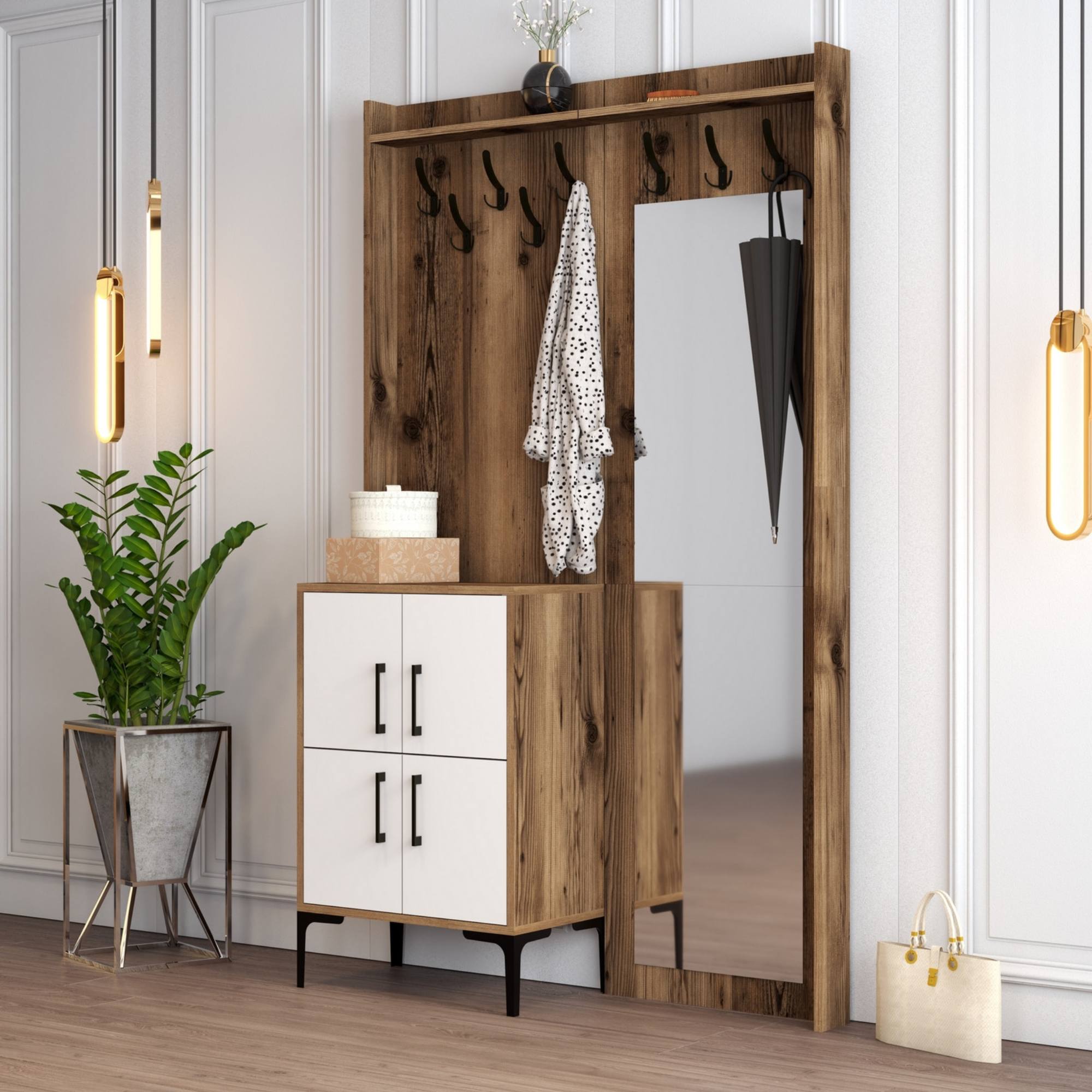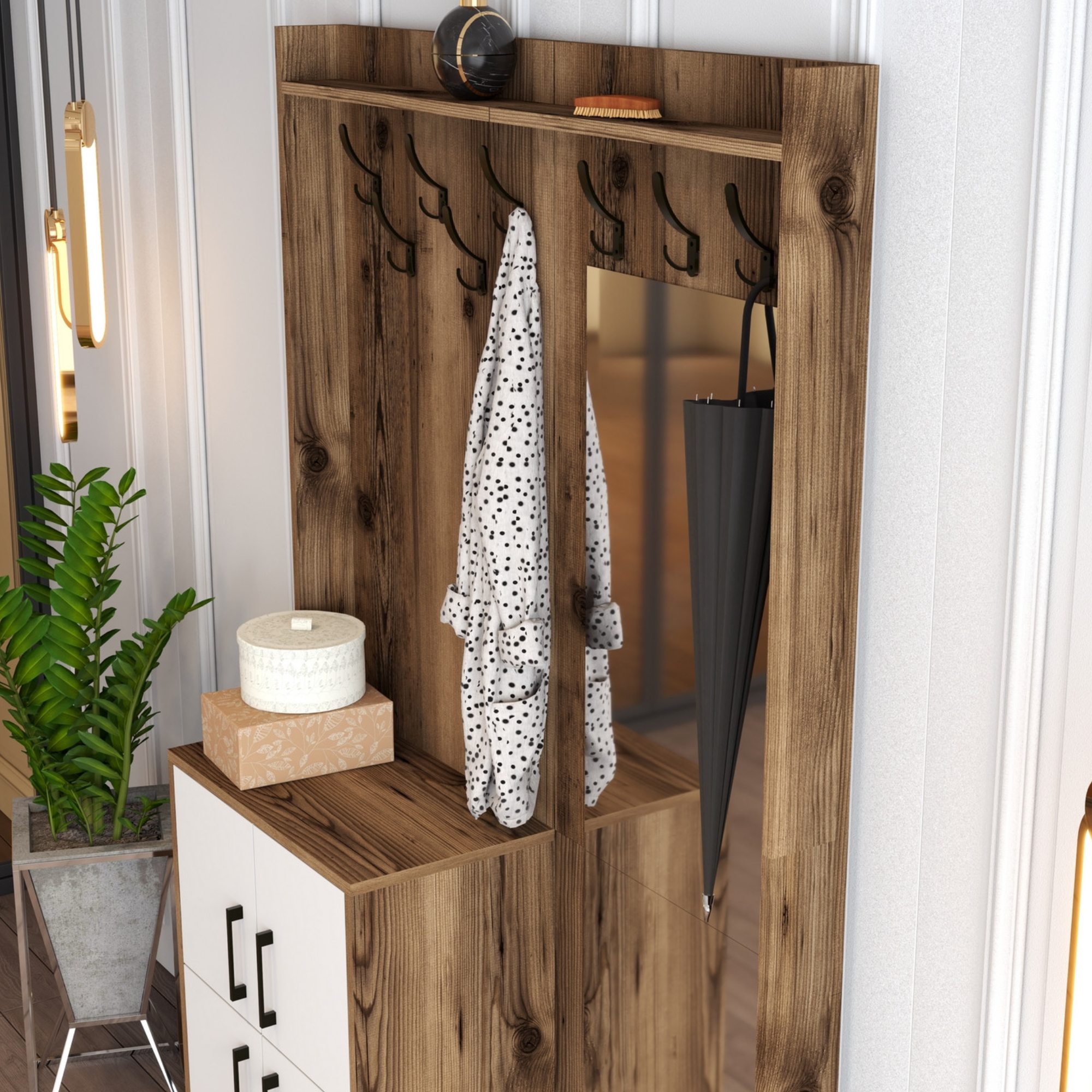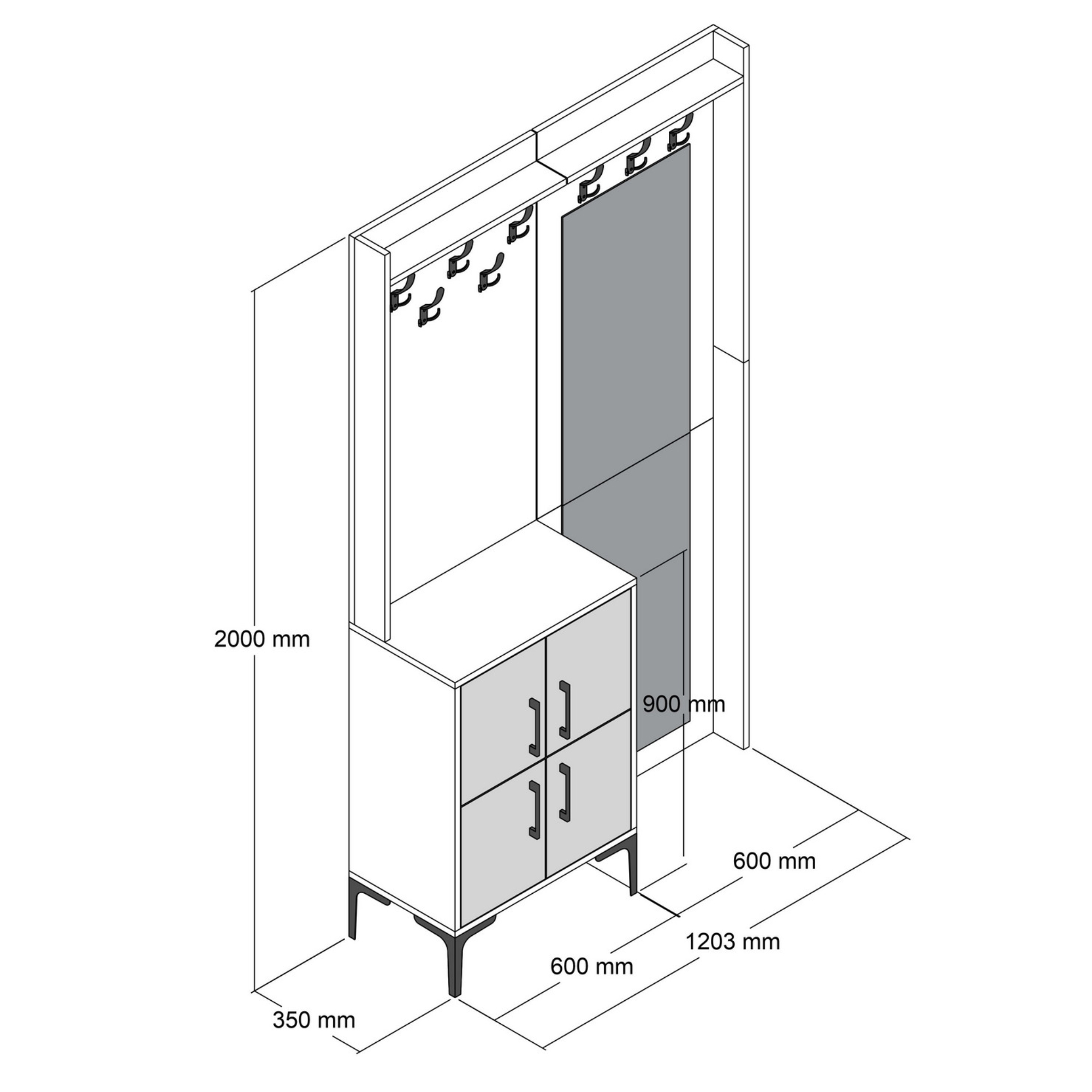 Sestava nabízí dostatek úložného prostoru. Její součástí jsou 2 police, z nichž 1 se nachází za otočnými dvířky. Ta jsou pro lepší manipulaci vybavena kovovými úchyty. Nechybí ani 8 kovových dvojitých háčků, na něž si můžete pověsit oblíbené oděvy i módní doplňky, a zrcadlo, ve kterém si můžete vždy před odchodem z domova ověřit, že vypadáte bezchybně.