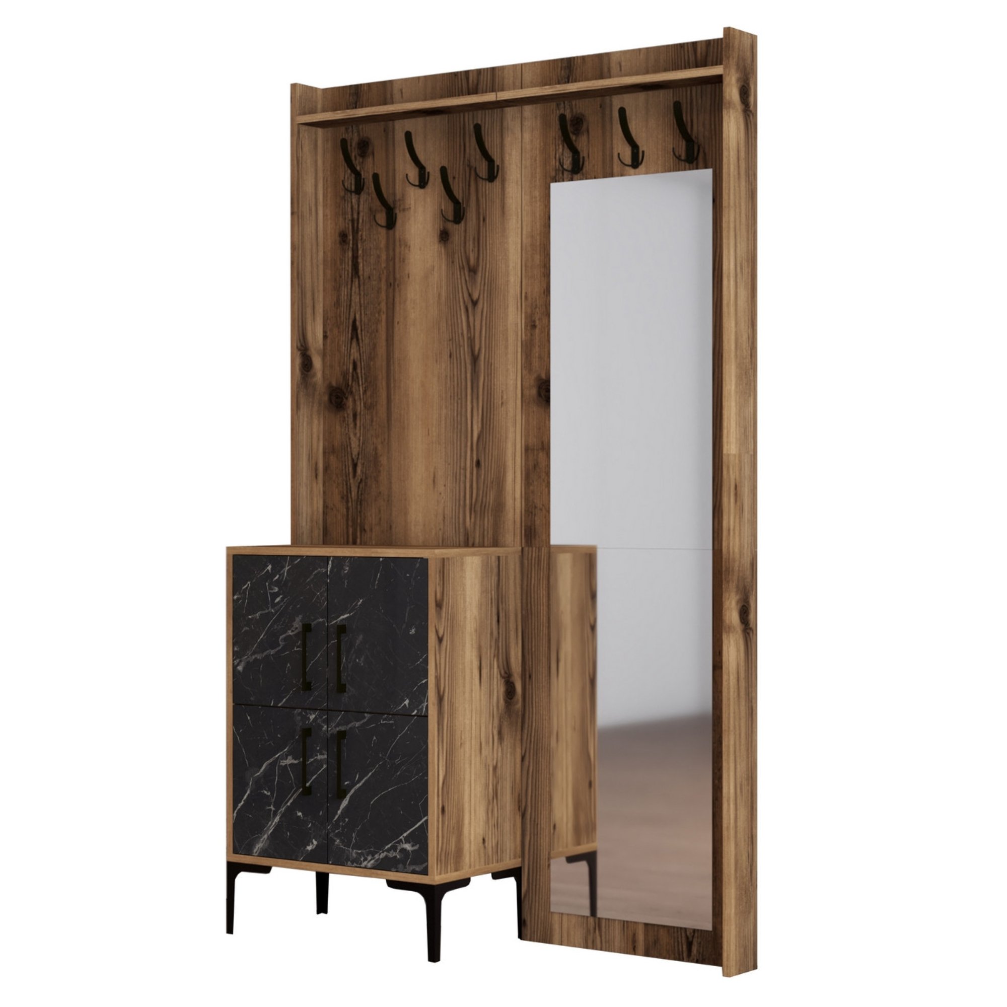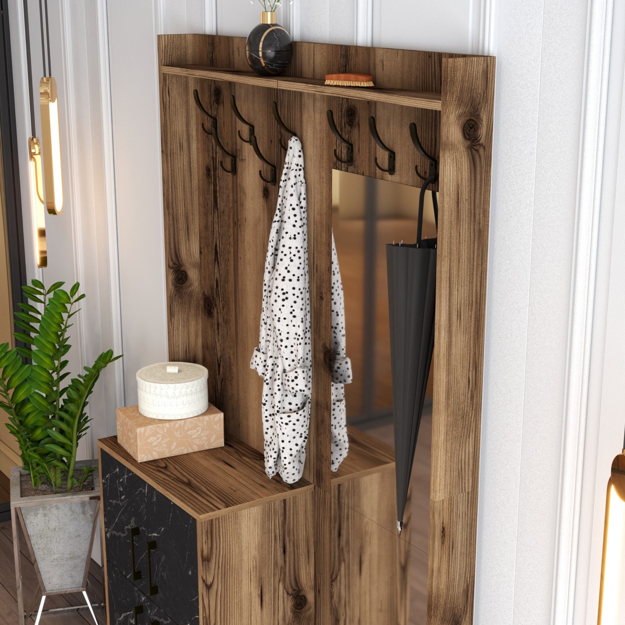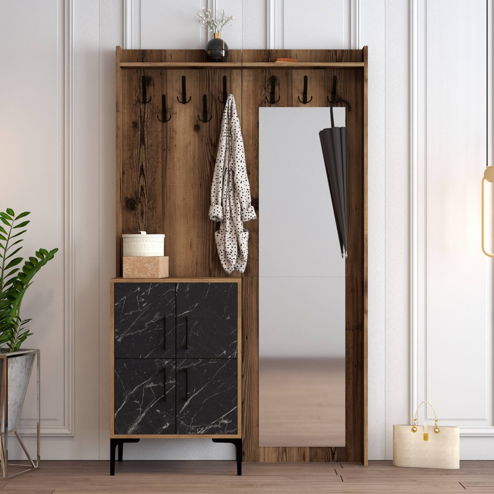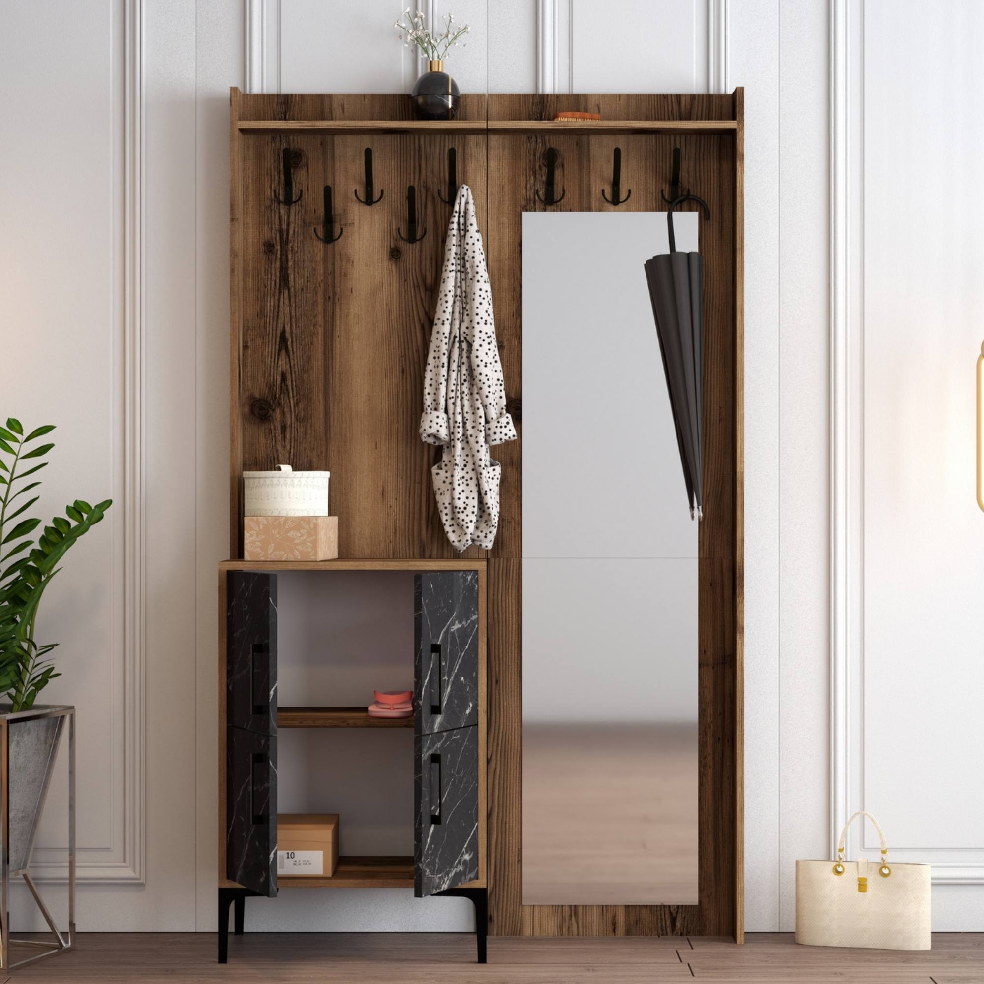 Sestava nabízí dostatek úložného prostoru. Její součástí jsou 2 police, z nichž 1 se nachází za otočnými dvířky. Ta jsou pro lepší manipulaci vybavena kovovými úchyty. Nechybí ani 8 kovových dvojitých háčků, na něž si můžete pověsit oblíbené oděvy i módní doplňky, a zrcadlo, ve kterém si můžete vždy před odchodem z domova ověřit, že vypadáte bezchybně.