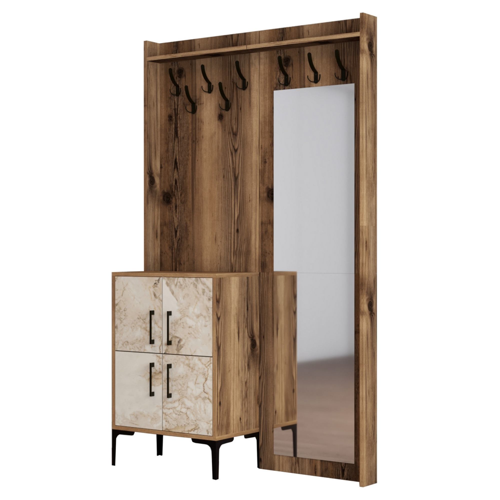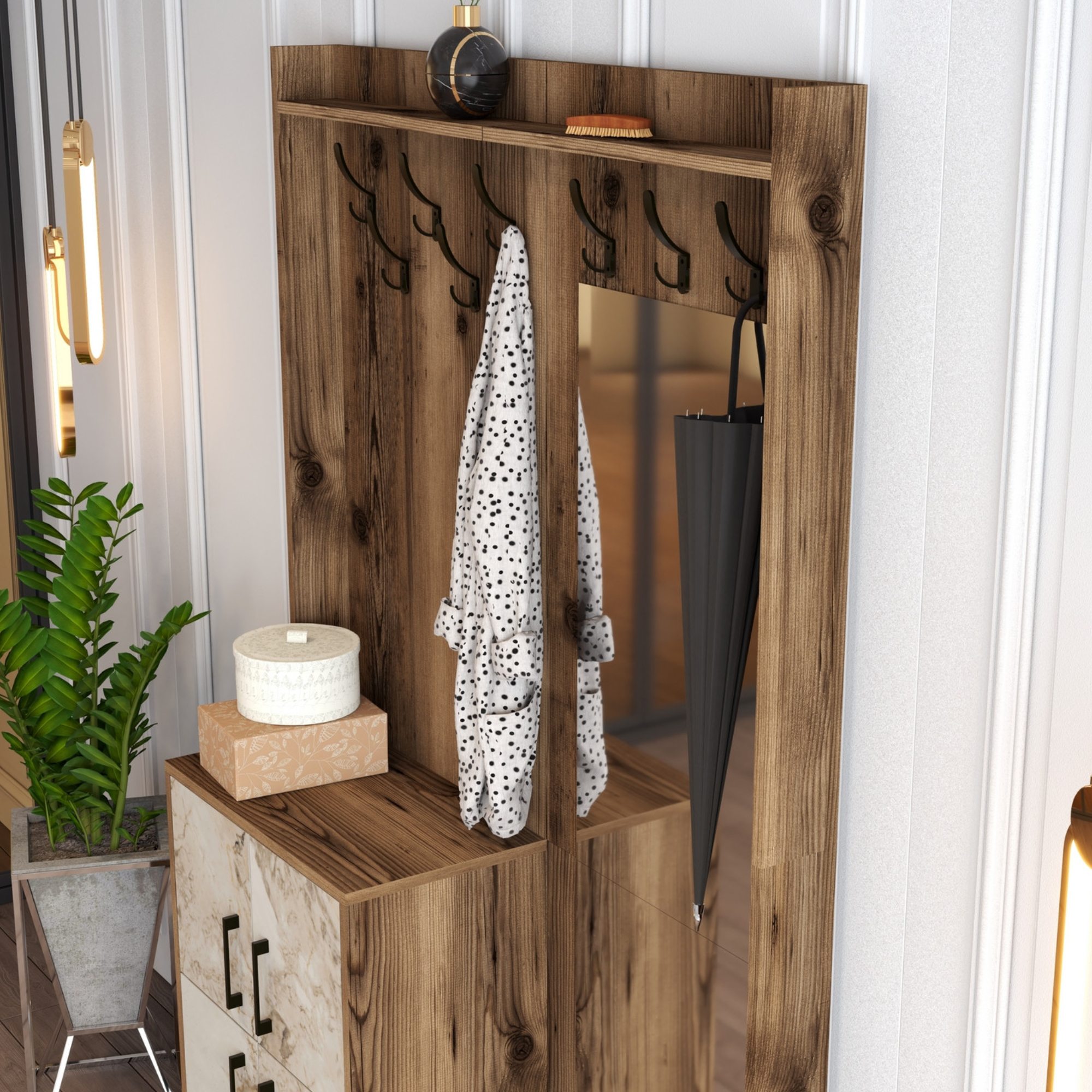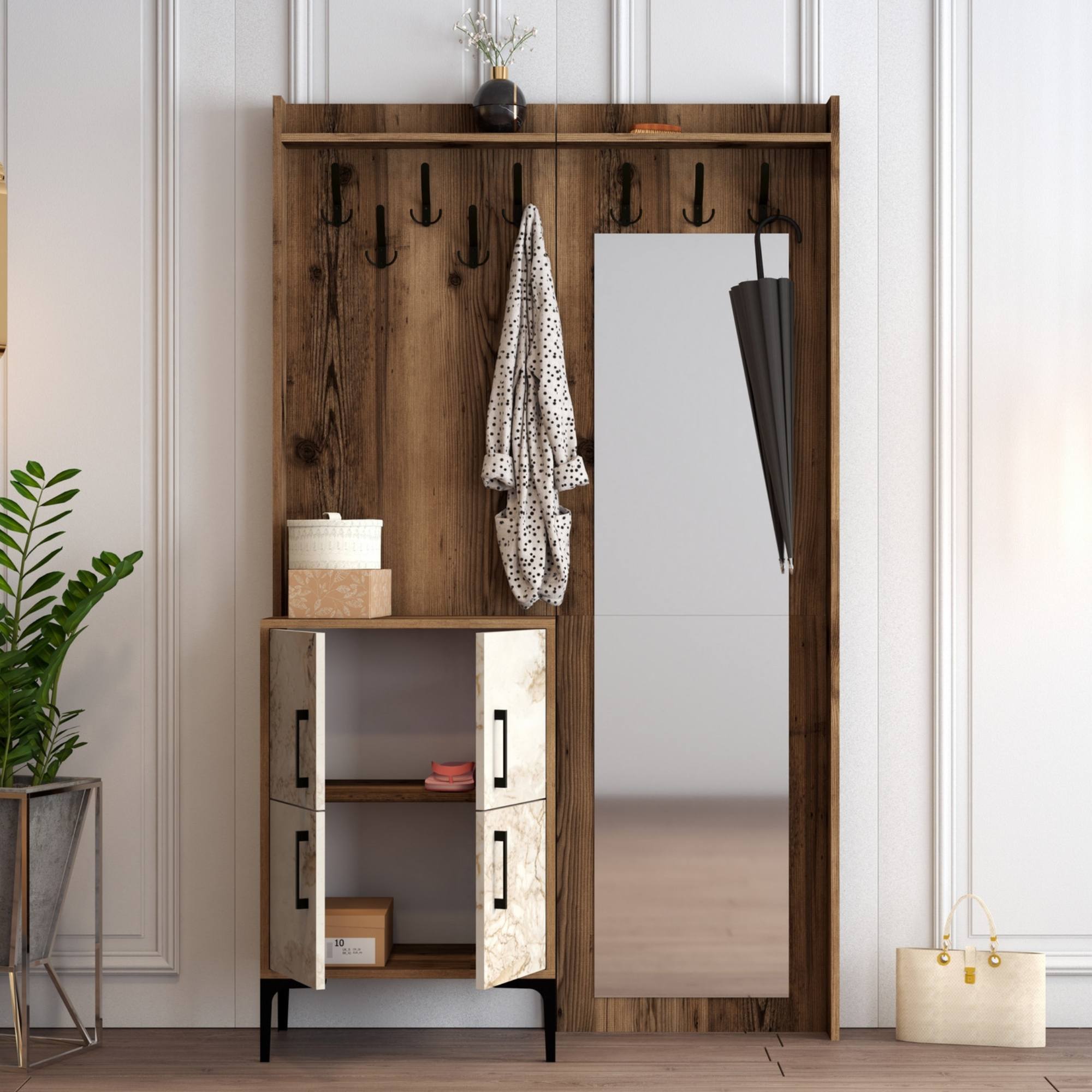 Sestava nabízí dostatek úložného prostoru. Její součástí jsou 2 police, z nichž 1 se nachází za otočnými dvířky. Ta jsou pro lepší manipulaci vybavena kovovými úchyty. Nechybí ani 8 kovových dvojitých háčků, na něž si můžete pověsit oblíbené oděvy i módní doplňky, a zrcadlo, ve kterém si můžete vždy před odchodem z domova ověřit, že vypadáte bezchybně.