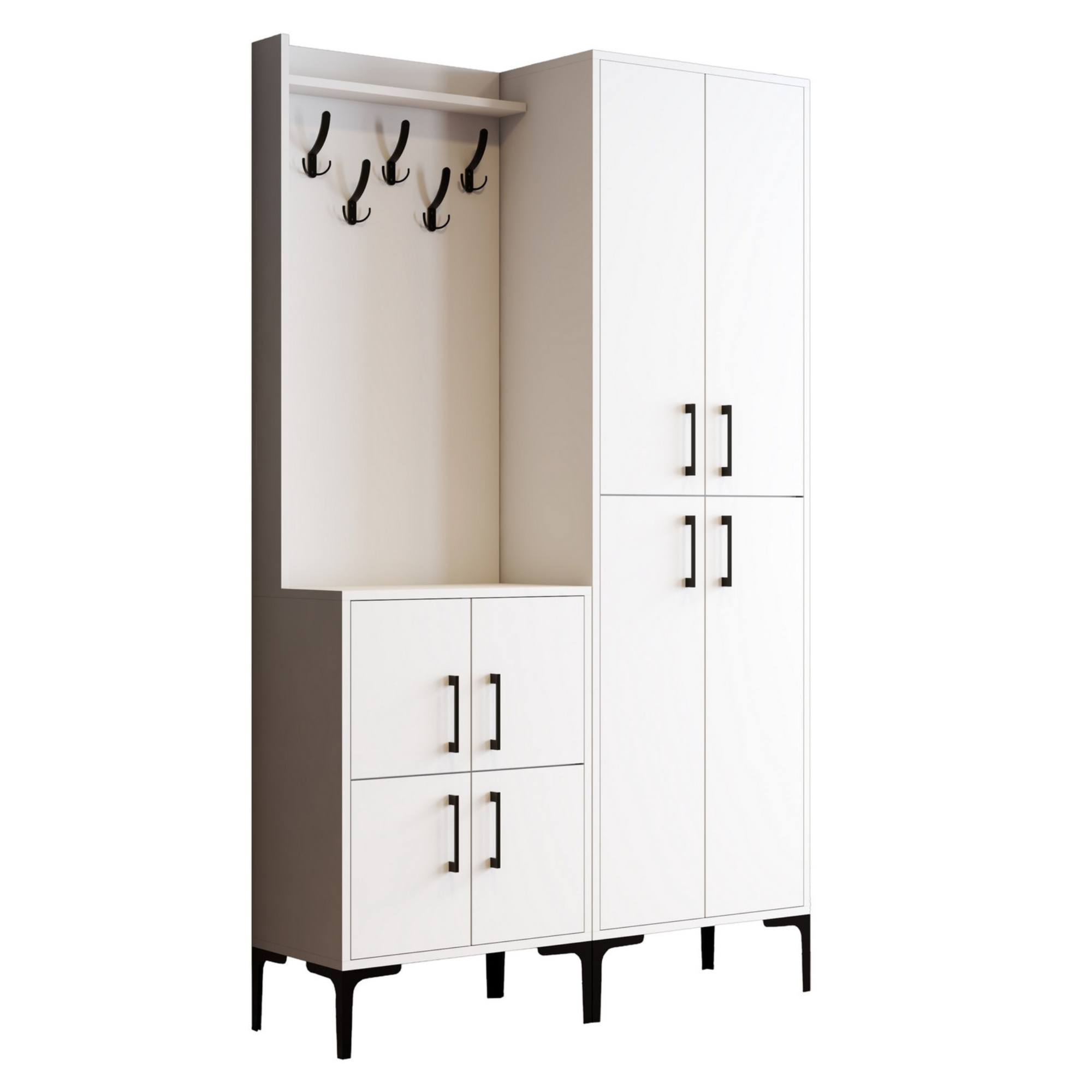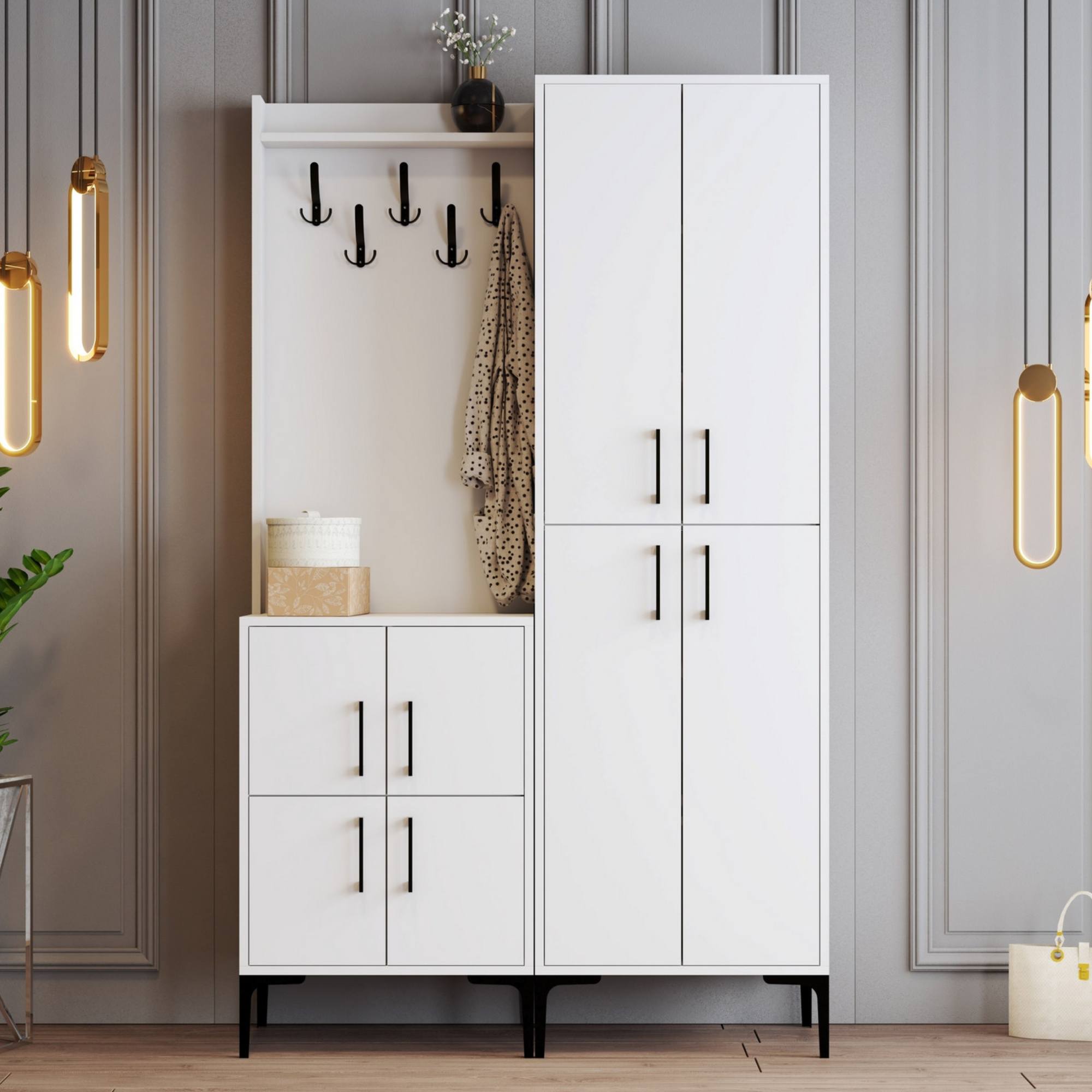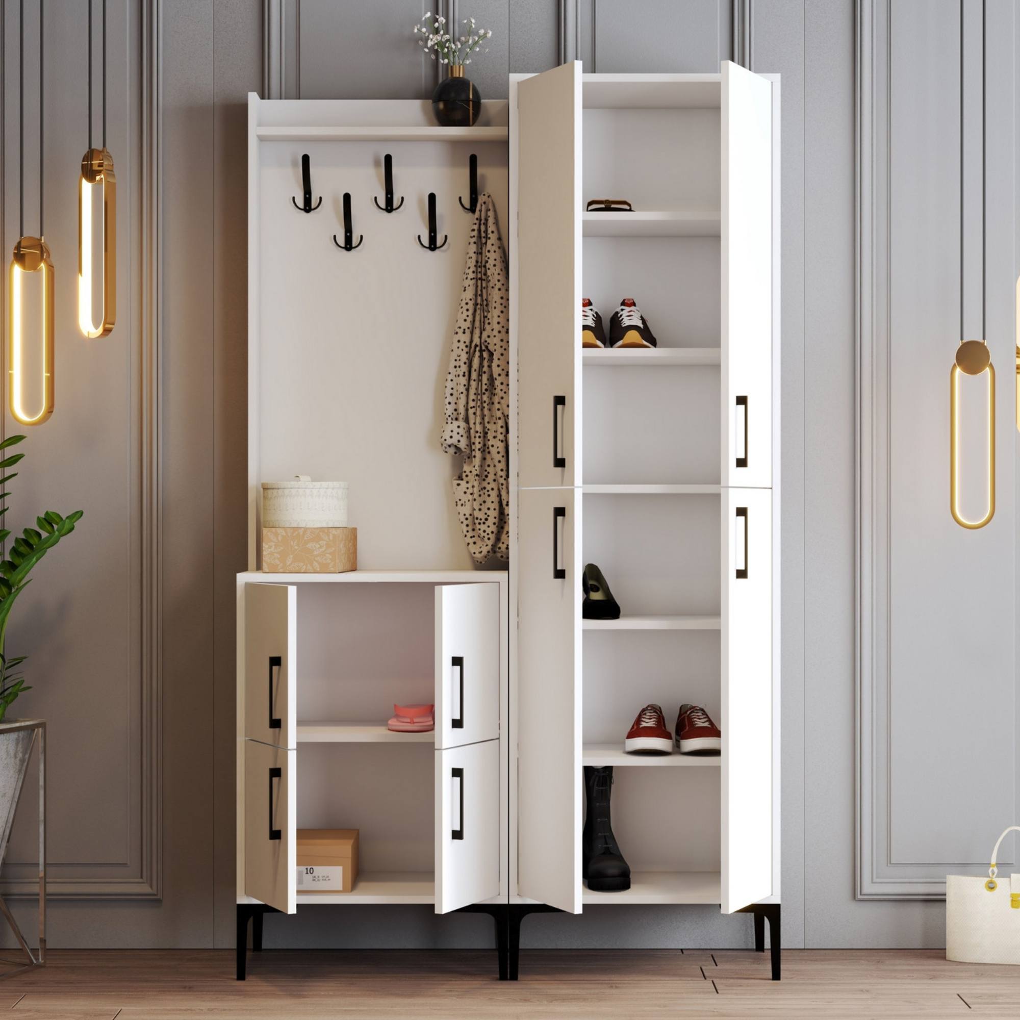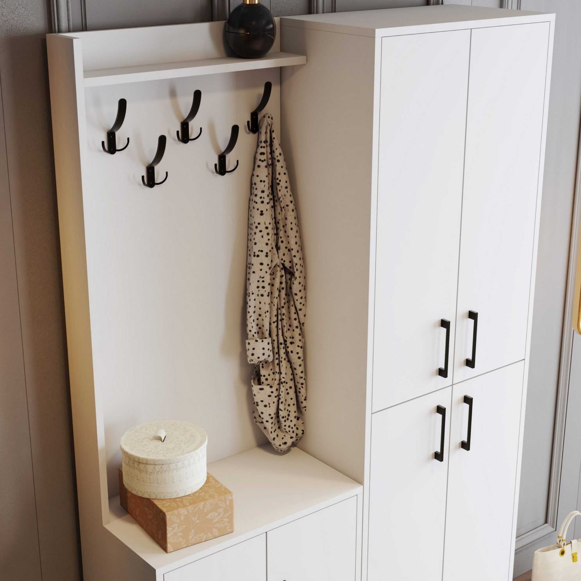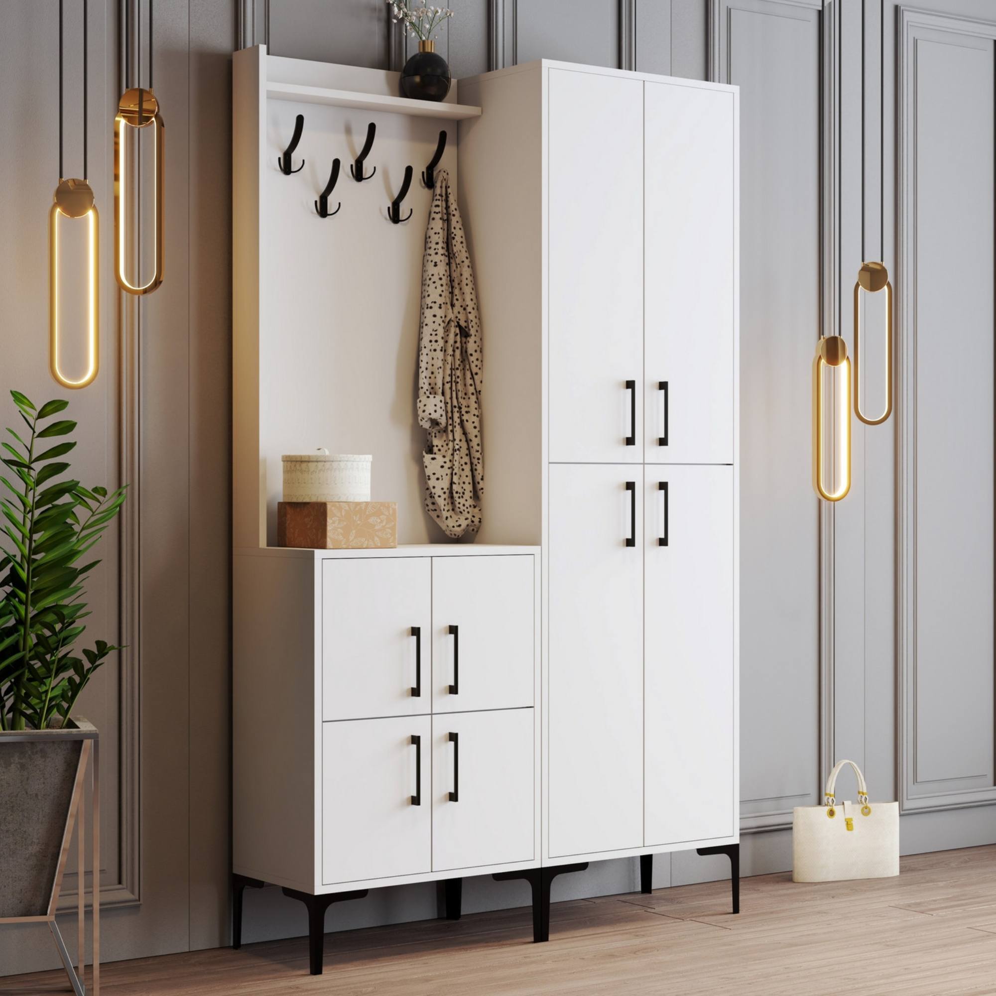 Sestava nabízí dostatek úložného prostoru. Její součástí je 7 polic, z nichž 6 se ukrývá za otočnými dvířky. Aby se s těmito dvířky dobře manipulovalo, jsou vybavena plastovými úchyty. Nechybí ani 5 kovových dvojitých háčků, na něž si můžete pověsit oblíbené oděvy i módní doplňky.