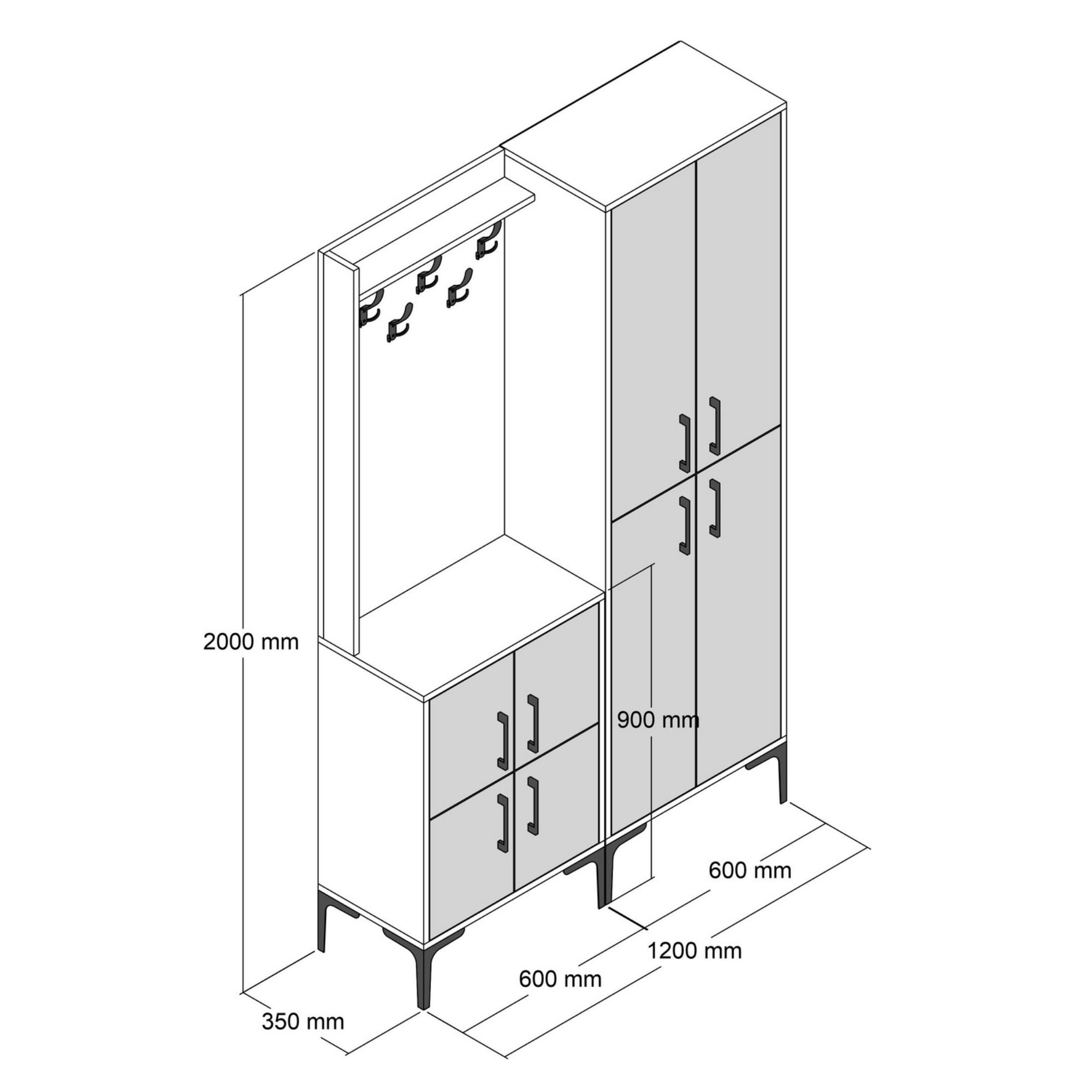 Sestava nabízí dostatek úložného prostoru. Její součástí je 7 polic, z nichž 6 se ukrývá za otočnými dvířky. Aby se s těmito dvířky dobře manipulovalo, jsou vybavena plastovými úchyty. Nechybí ani 5 kovových dvojitých háčků, na něž si můžete pověsit oblíbené oděvy i módní doplňky.