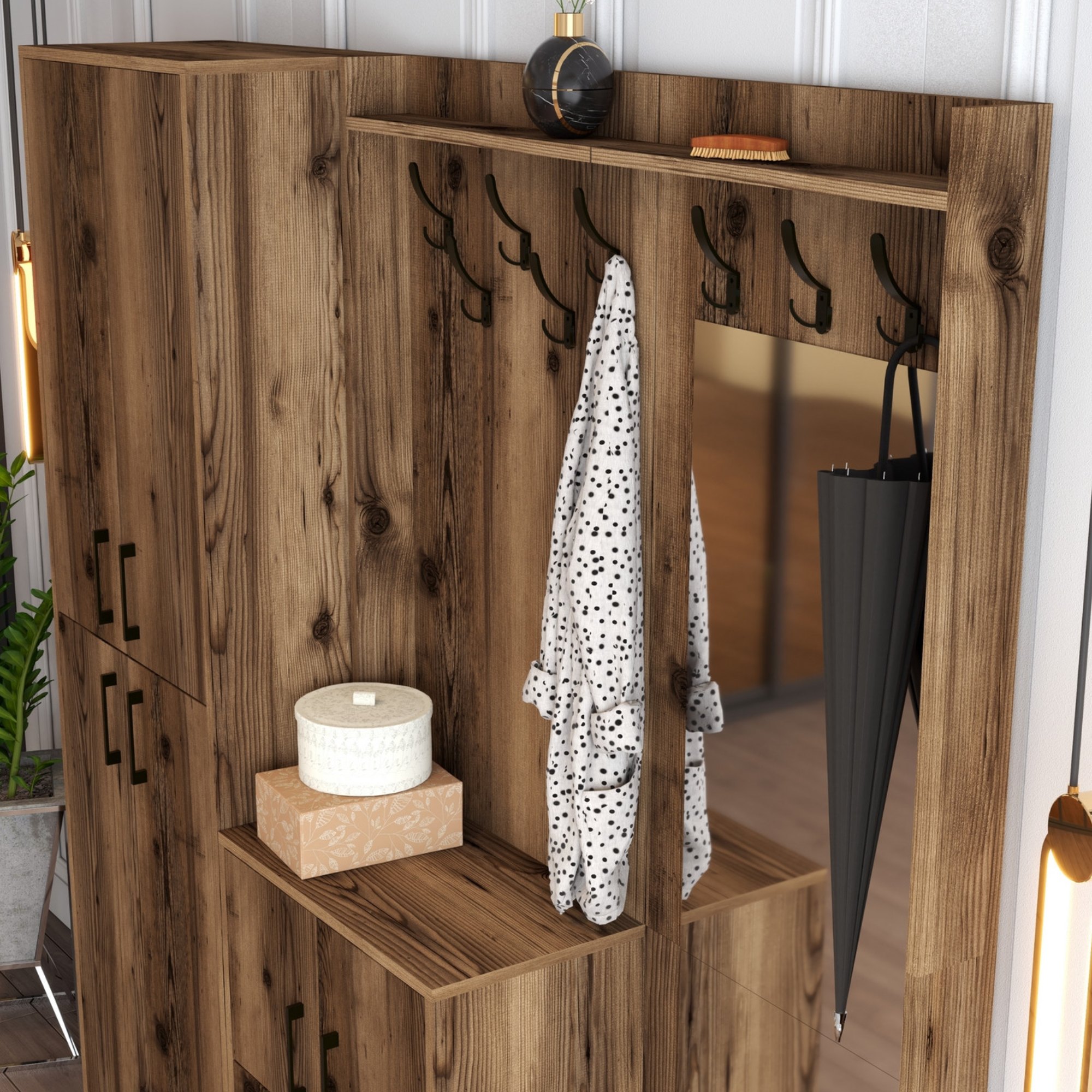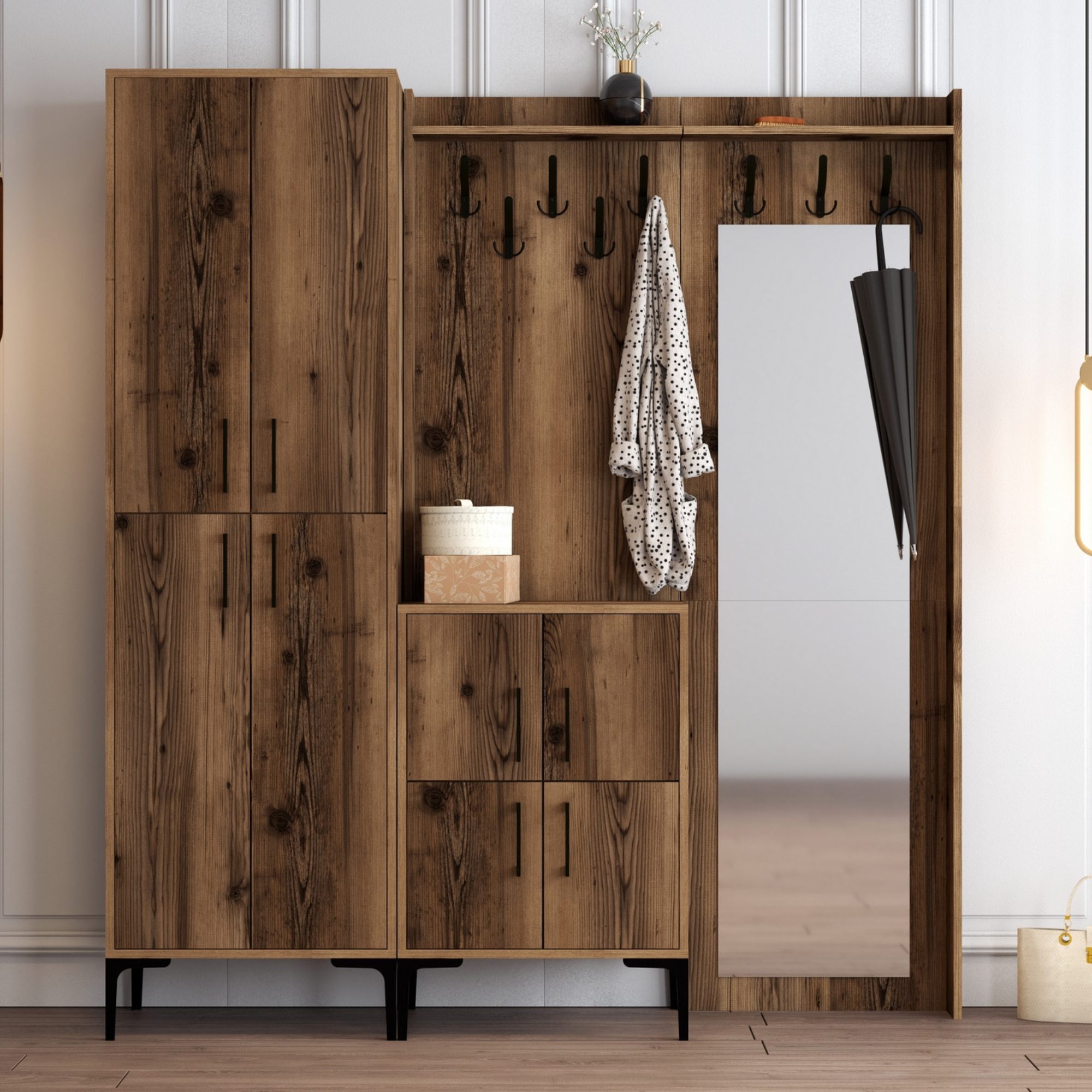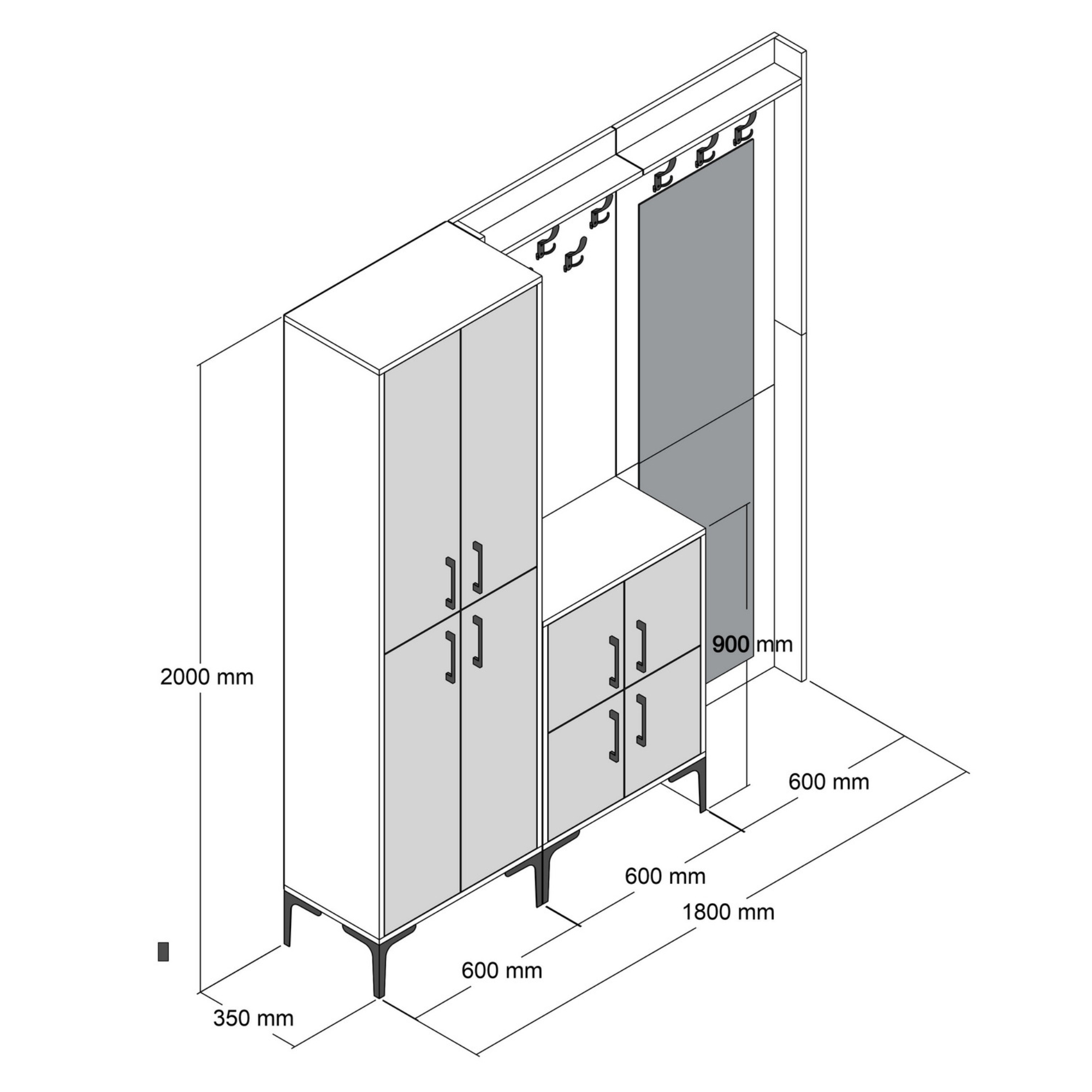 Sestava nabízí dostatek úložného prostoru. Její součástí je 7 polic, z nichž 6 se nachází za otočnými dvířky. Ta jsou pro lepší manipulaci vybavena kovovými úchyty. Nechybí ani 8 kovových dvojitých háčků, na něž si můžete pověsit oblíbené oděvy i módní doplňky, a zrcadlo, ve kterém si můžete vždy před odchodem z domova ověřit, že vypadáte bezchybně.