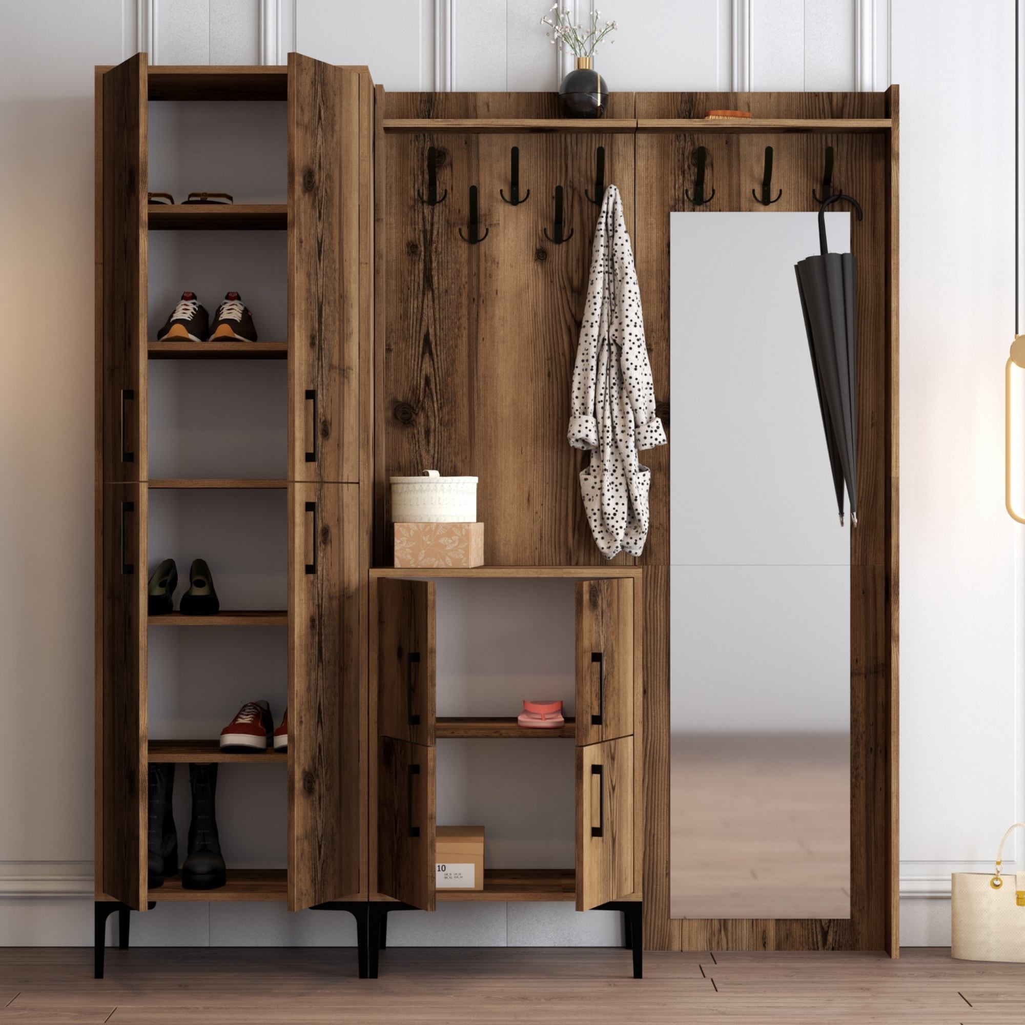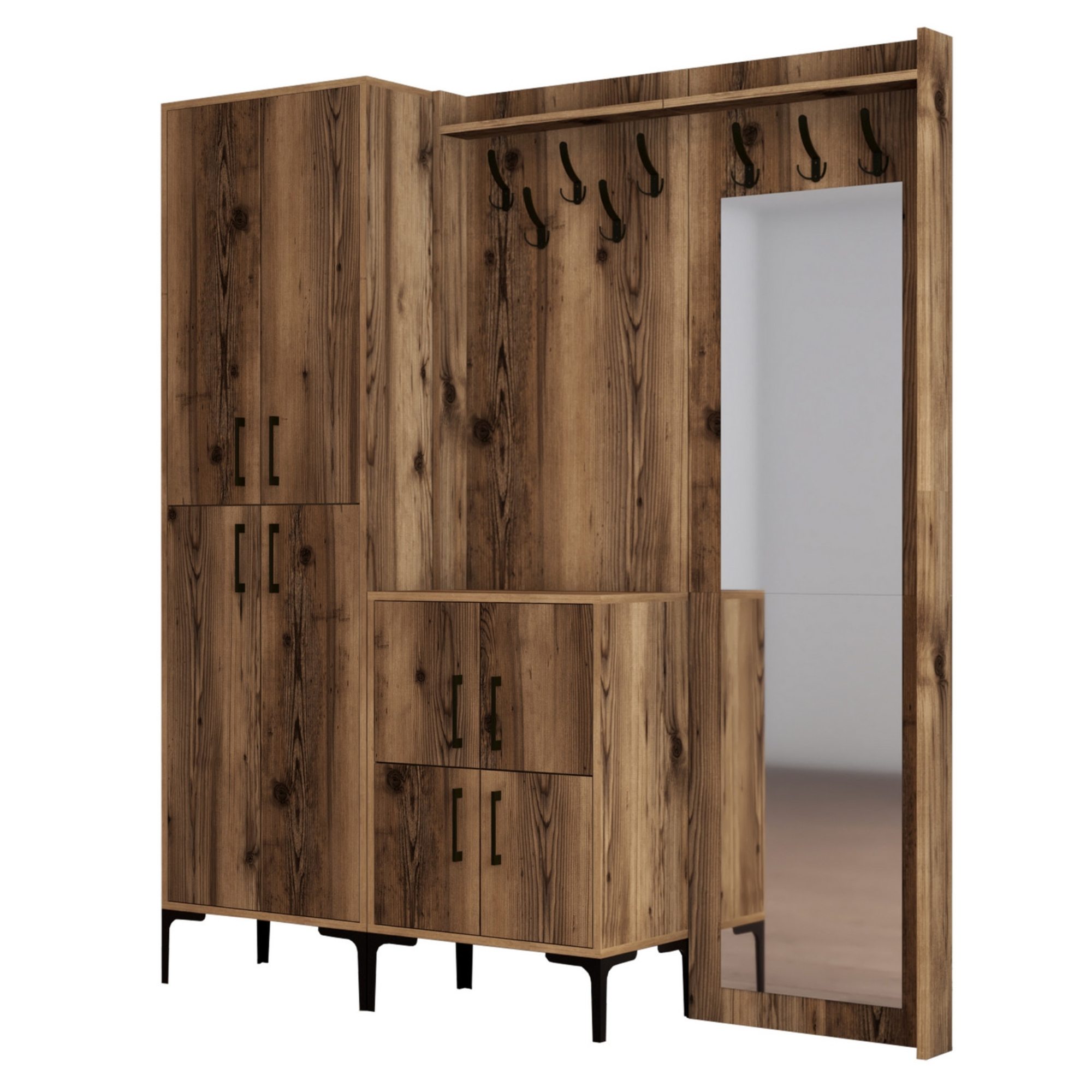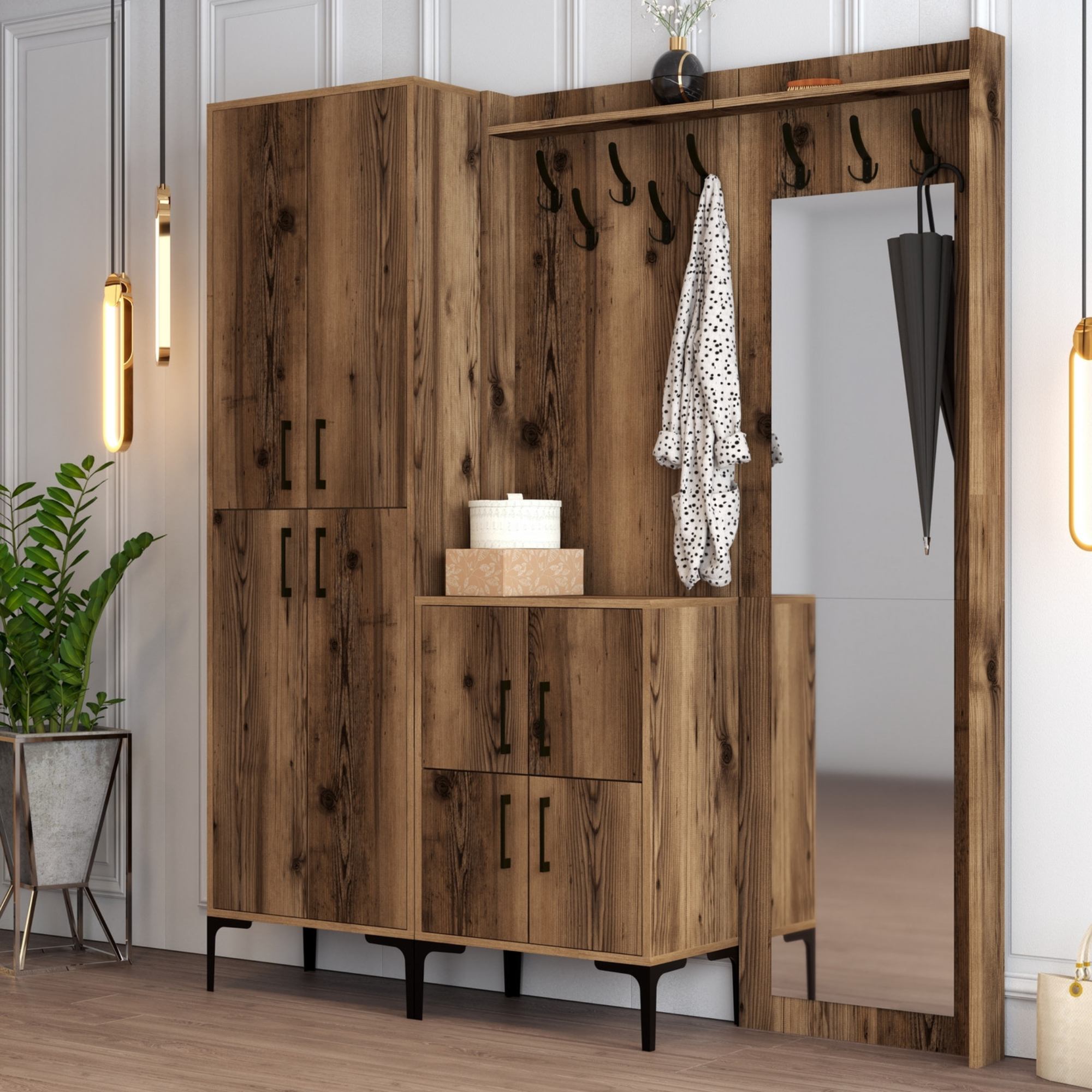 Sestava nabízí dostatek úložného prostoru. Její součástí je 7 polic, z nichž 6 se nachází za otočnými dvířky. Ta jsou pro lepší manipulaci vybavena kovovými úchyty. Nechybí ani 8 kovových dvojitých háčků, na něž si můžete pověsit oblíbené oděvy i módní doplňky, a zrcadlo, ve kterém si můžete vždy před odchodem z domova ověřit, že vypadáte bezchybně.