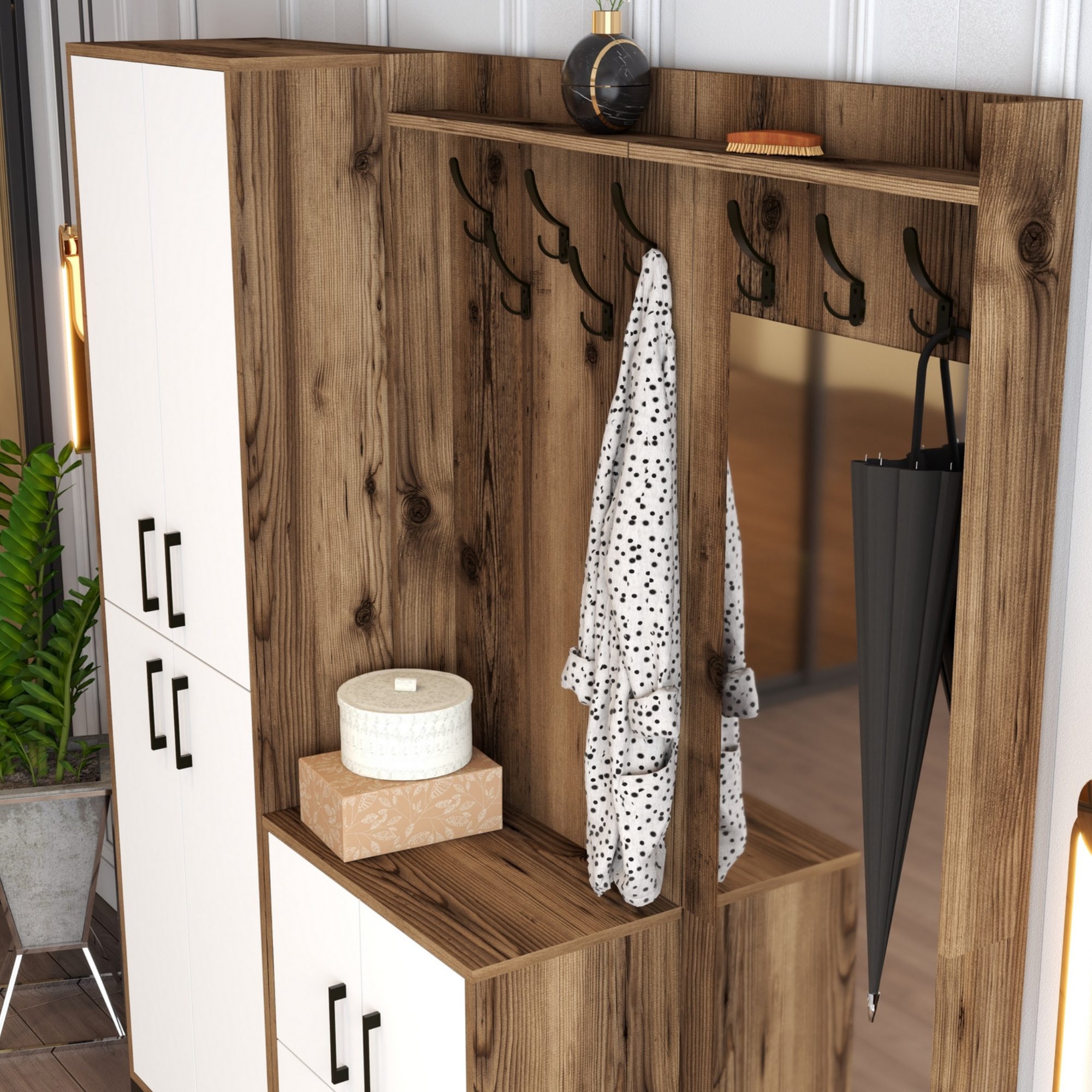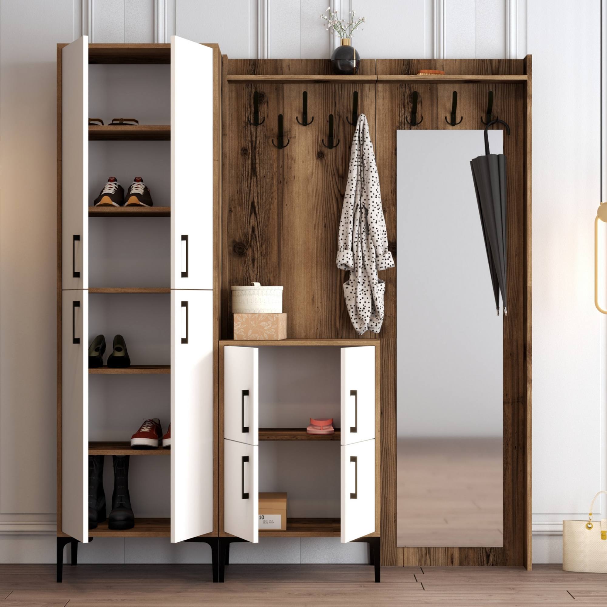 Sestava nabízí dostatek úložného prostoru. Její součástí je 7 polic, z nichž 6 se nachází za otočnými dvířky. Ta jsou pro lepší manipulaci vybavena kovovými úchyty. Nechybí ani 8 kovových dvojitých háčků, na něž si můžete pověsit oblíbené oděvy i módní doplňky, a zrcadlo, ve kterém si můžete vždy před odchodem z domova ověřit, že vypadáte bezchybně.