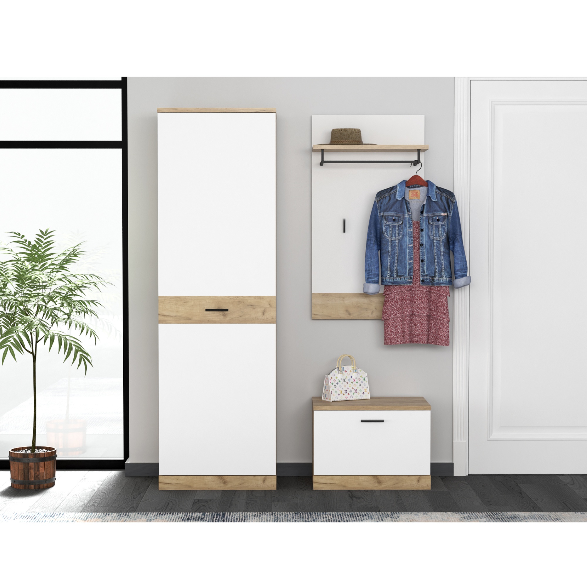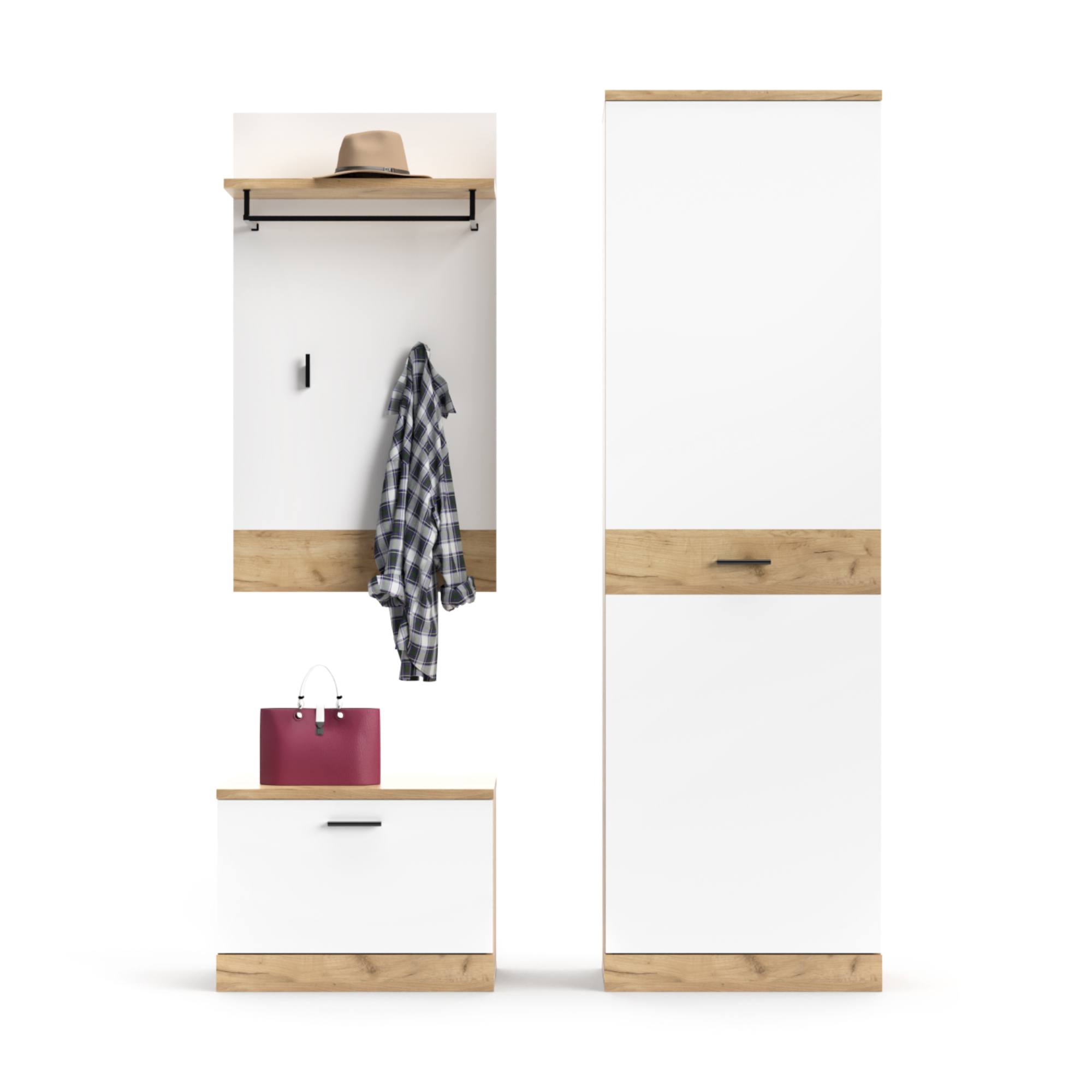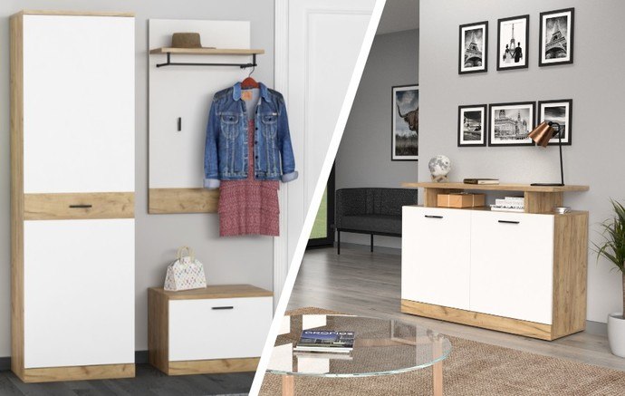 Skládá se z panelu disponujícím policí s kovovou konstrukcí na zavěšení ramínek a dvěma háčky, botníku a dvoudvéřové šatní skříně, která je uprostřed dělená zásuvkou. Společným jmenovatelem je zhotovení z laminovaného dřevěného materiálu, pro který je typická snadná udržovatelnost i dlouhá životnost. Moderní design je pak podpořen barevnou kombinací, ve které se střetává kontrast dekoru dubu craft a mléčně bílé. Sestava nabízí bohatý úložný prostor na boty, bundy, čepice a řadu dalších běžných potřeb. Nábytek navíc disponuje praktickými úchyty v černé barvě.