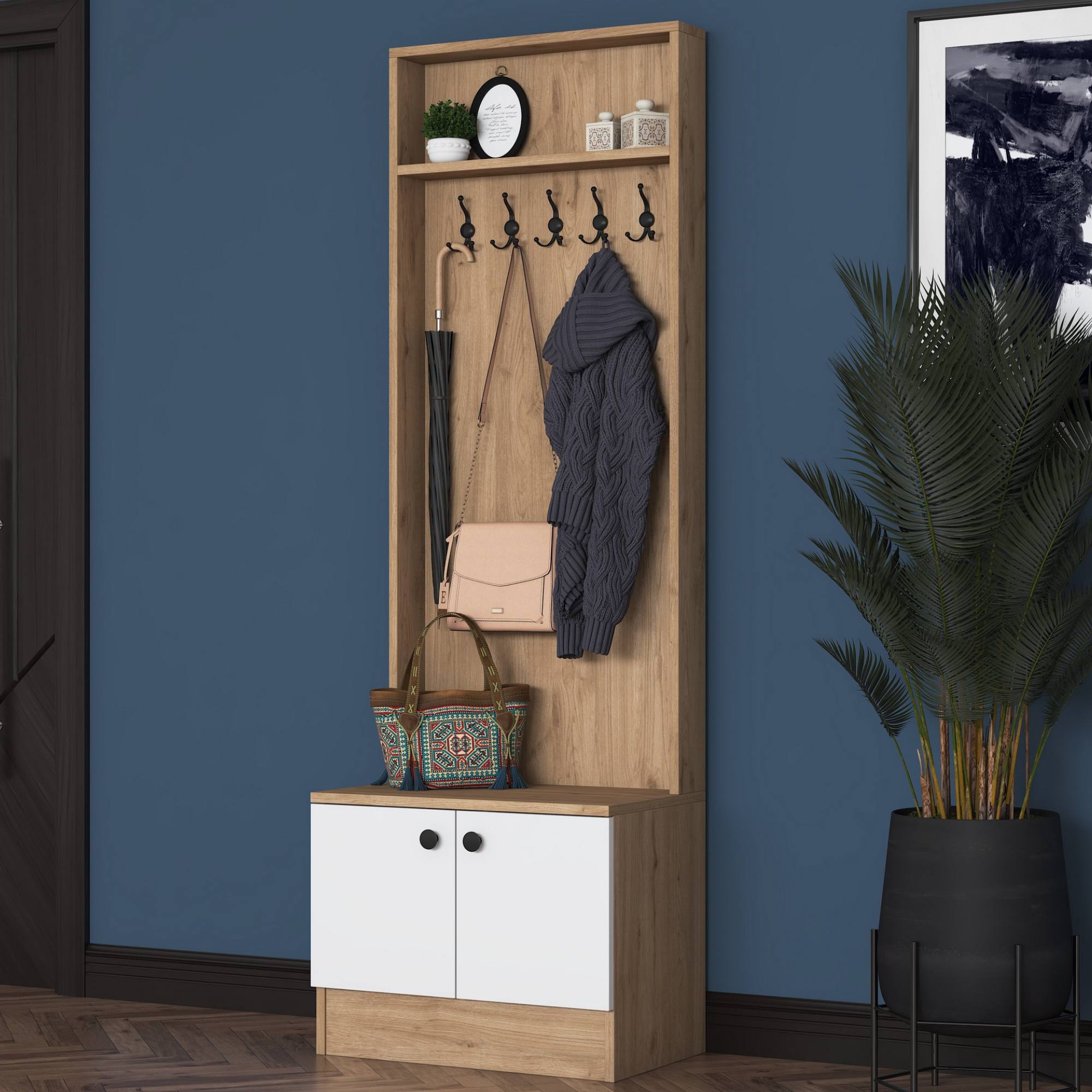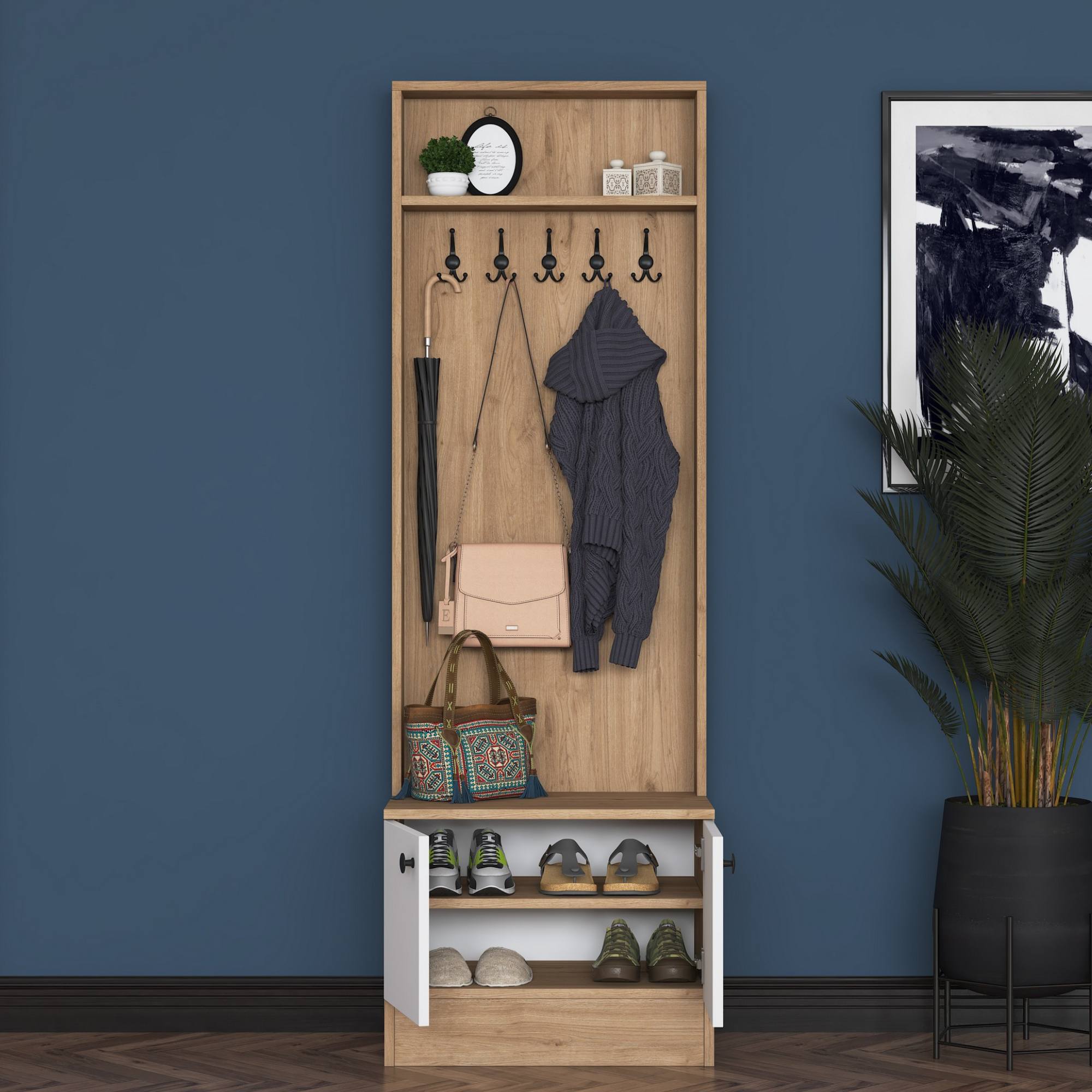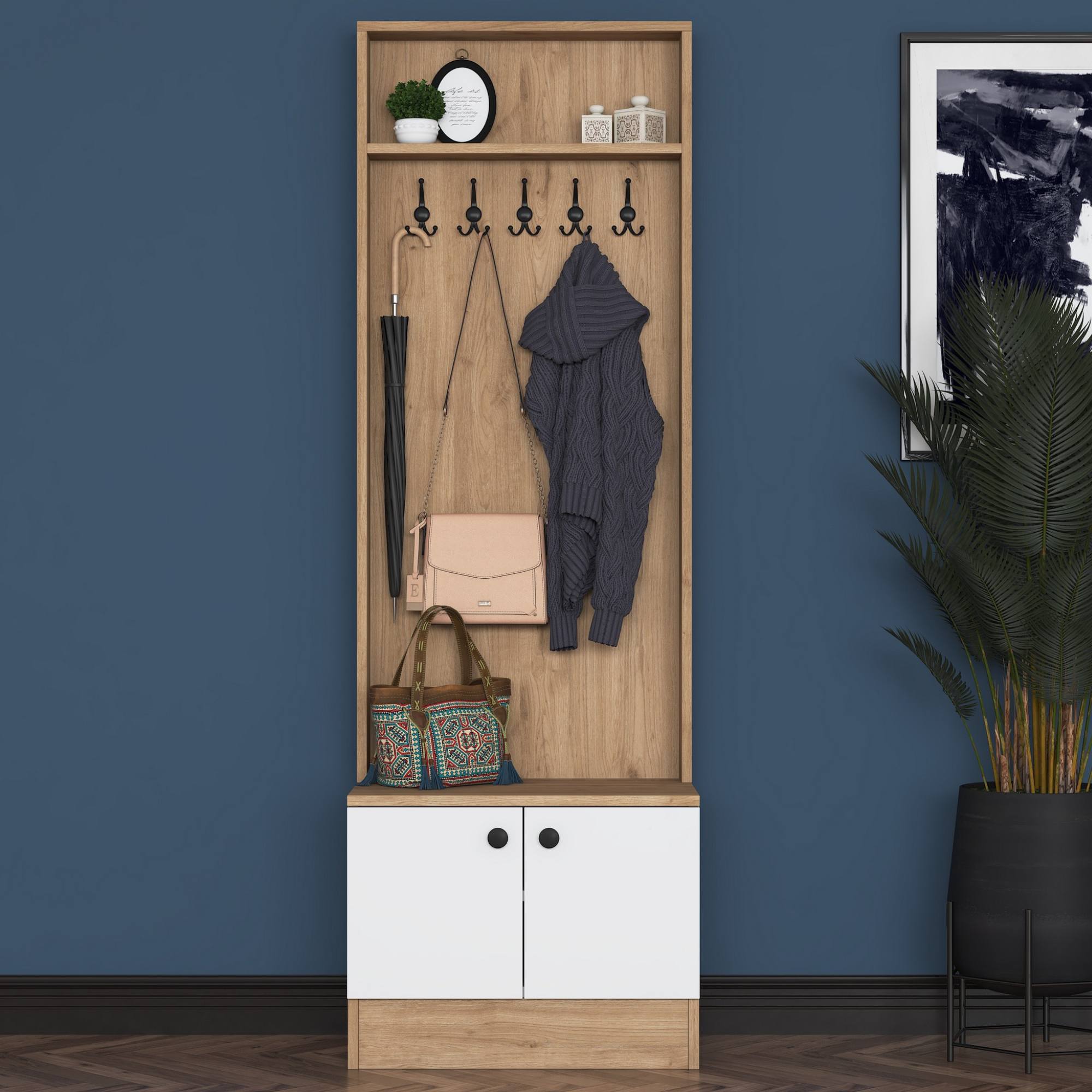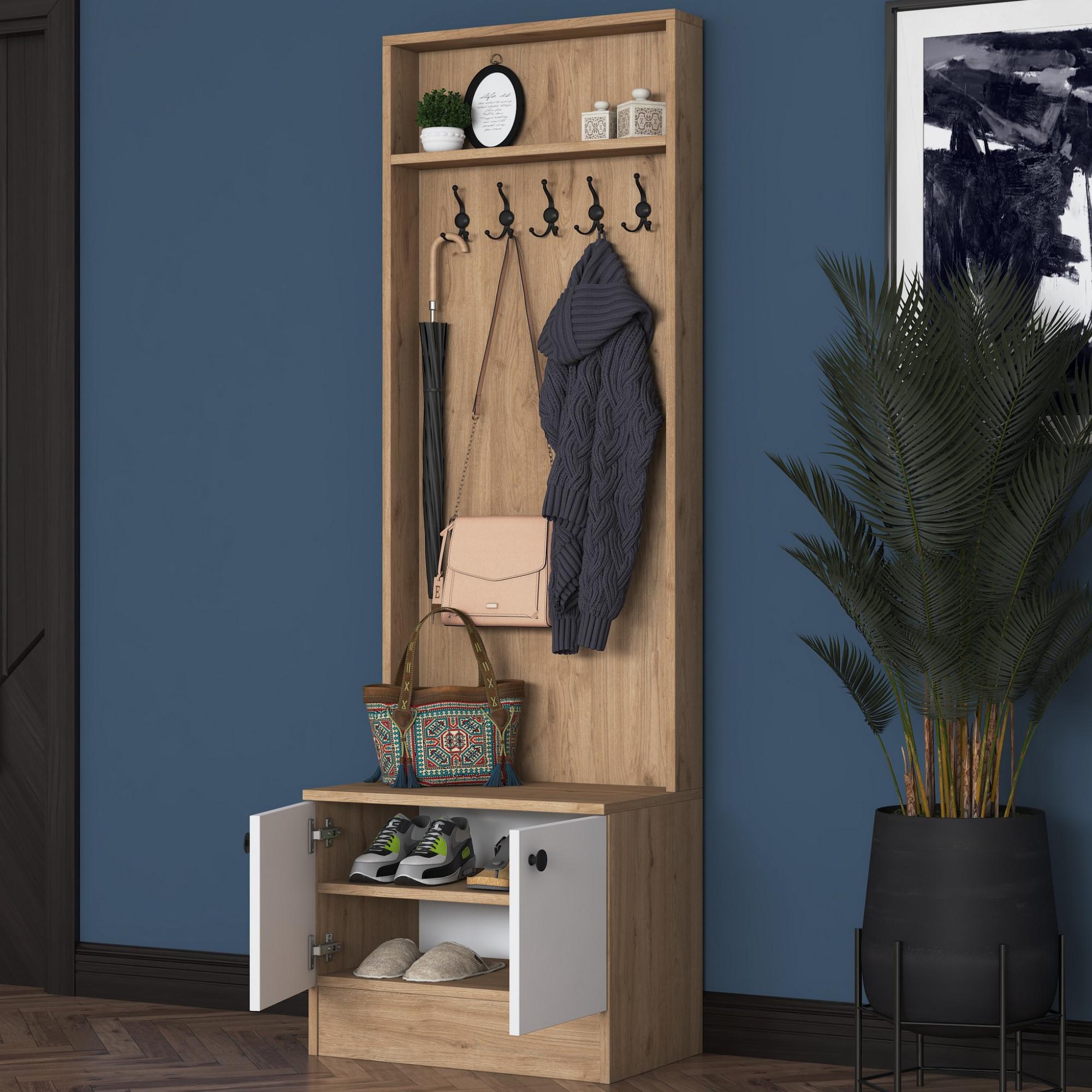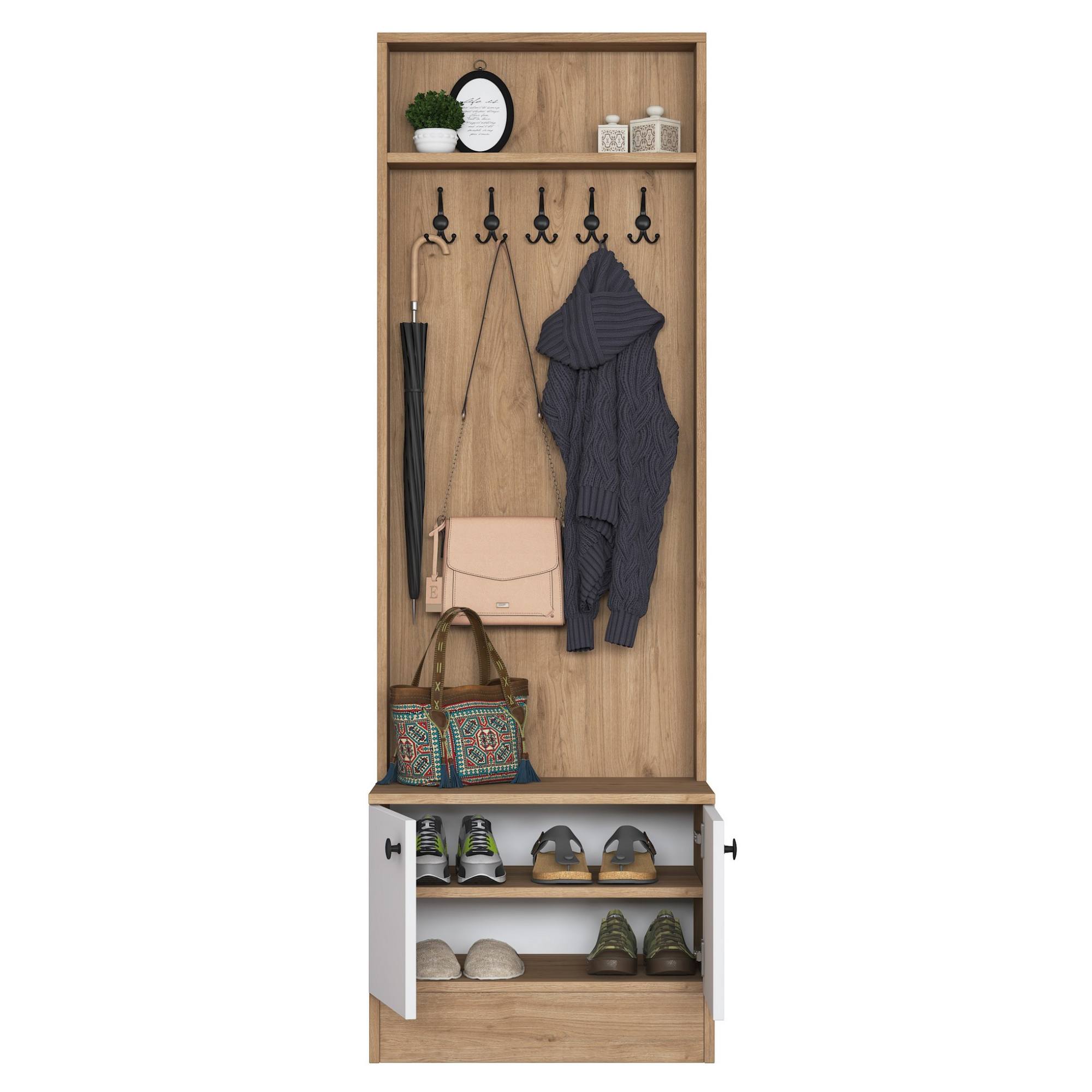 Sestava nabízí dostatek úložného prostoru. Její součástí jsou 2 vložené police, z nichž 1 se ukrývá za dvířky. Aby se s dvířky sestavy dobře manipulovalo, jsou vybavena úchyty. Nechybí ani 5 dvojitých háčků, na které si můžete pověsit nejen často nošené kabáty či bundy, ale i různé módní doplňky.