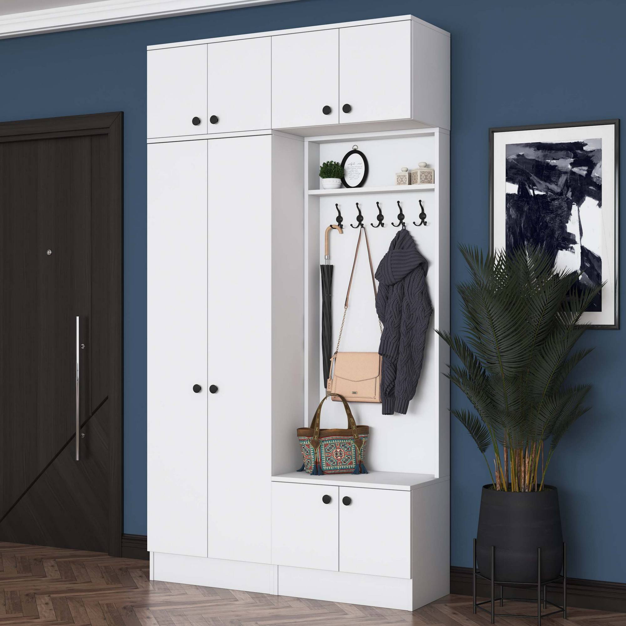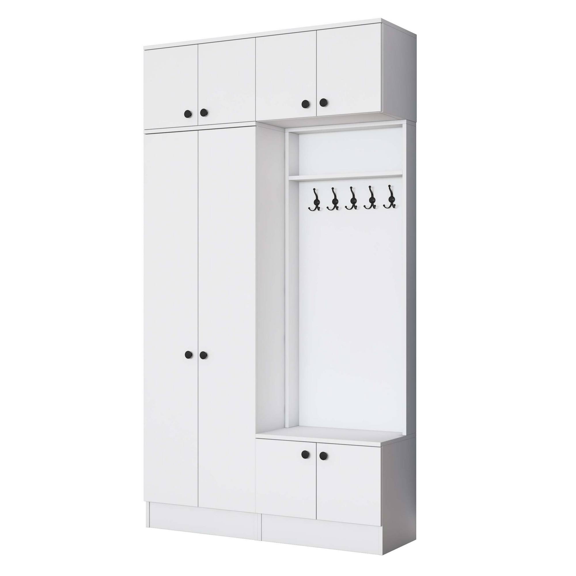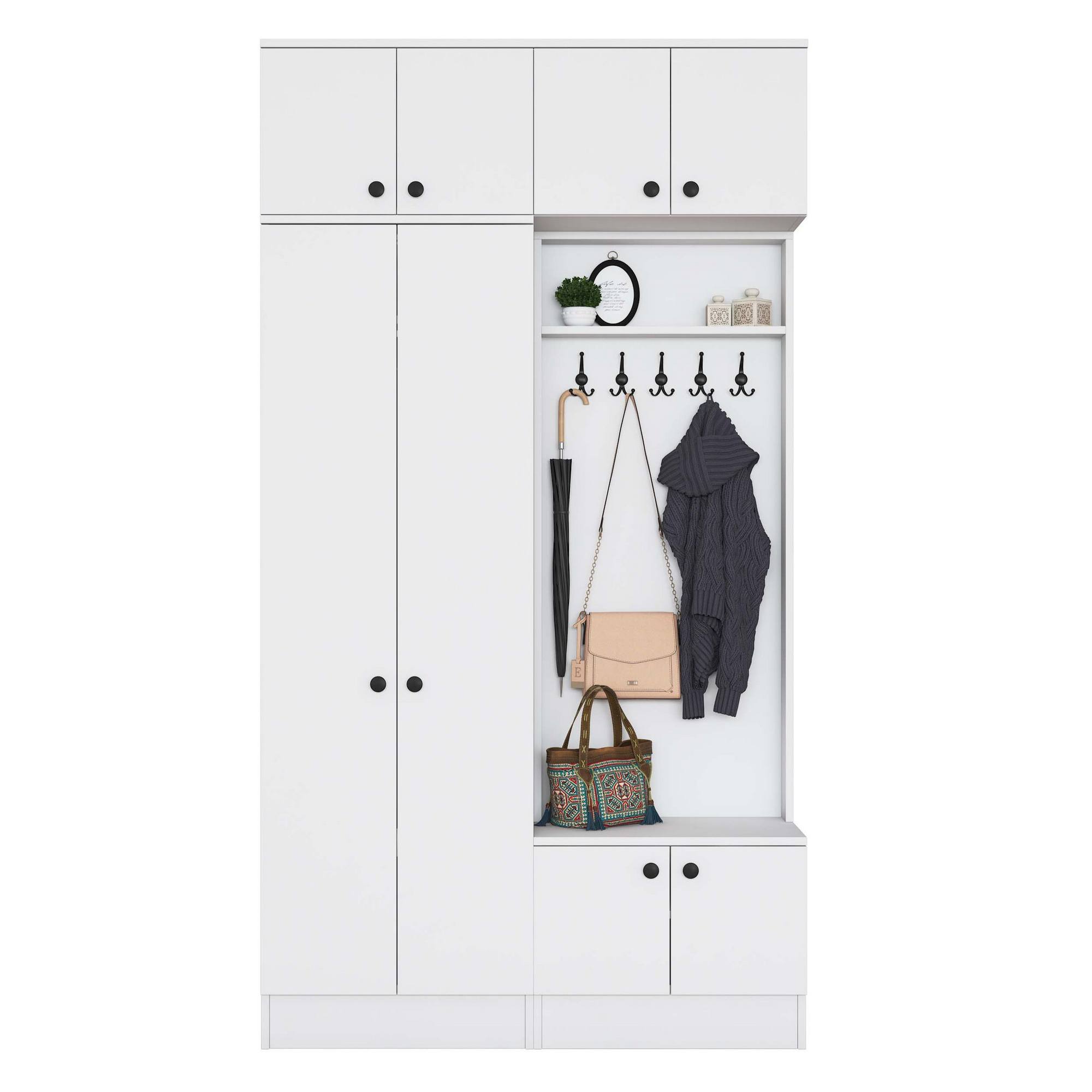 Sestava nabízí dostatek úložného prostoru. Její součástí jsou 4 vložené police, z nichž 3 se ukrývají za dvířky. Aby se s dvířky sestavy dobře manipulovalo, jsou vybavena úchyty. Nechybí ani 10 dvojitých háčků, na které si můžete pověsit nejen často nošené kabáty či bundy, ale i různé módní doplňky. 5 z těchto háčků se nachází za dvířky.
