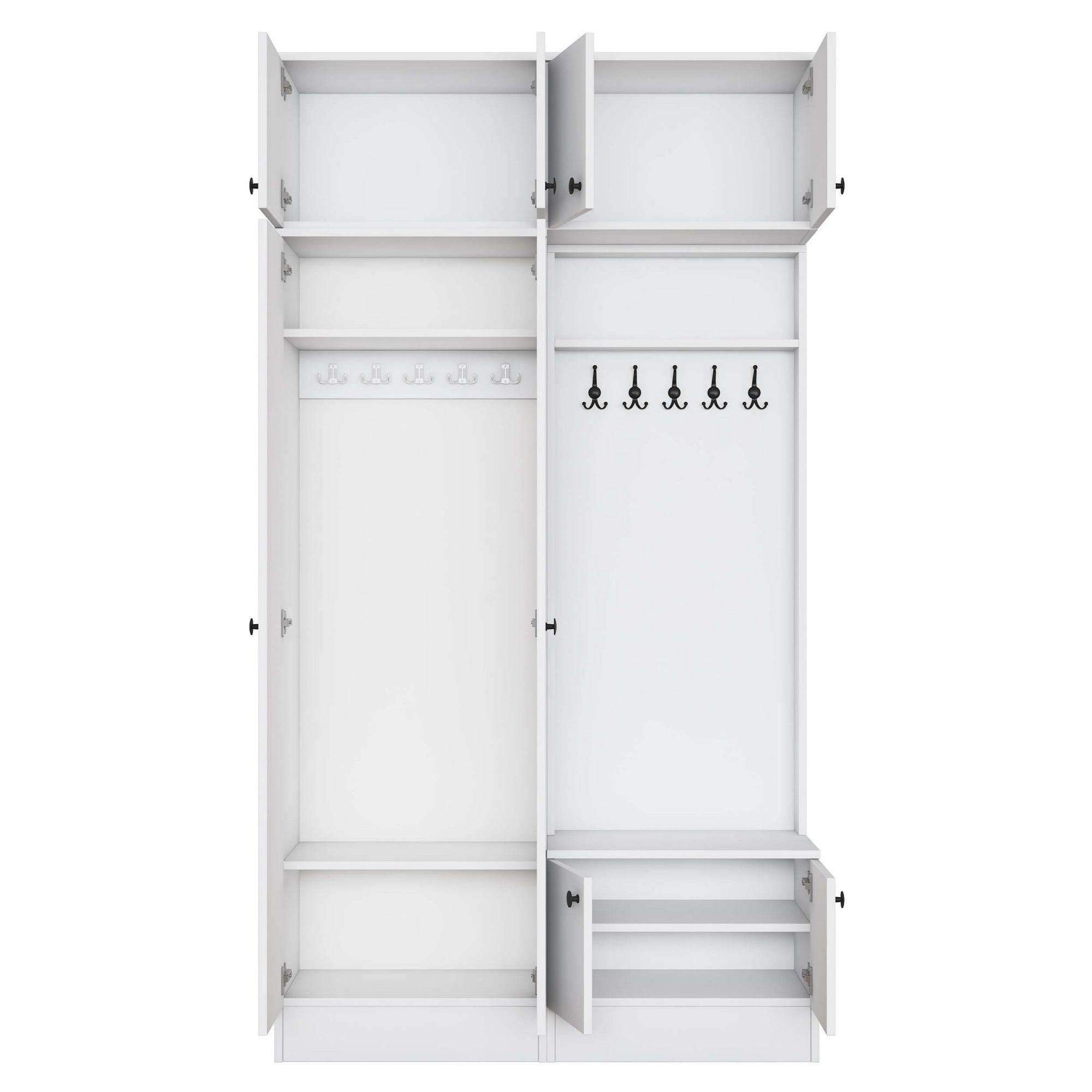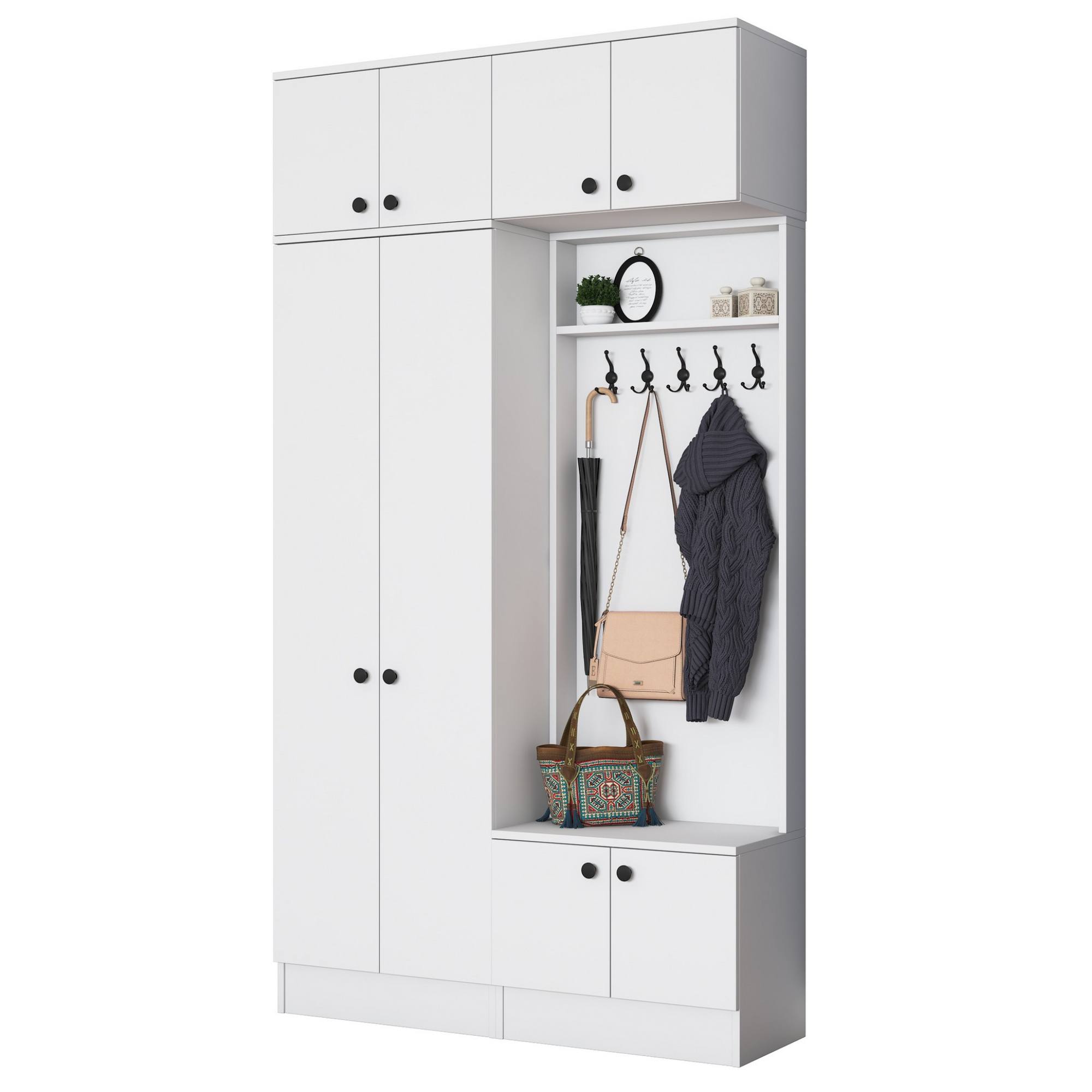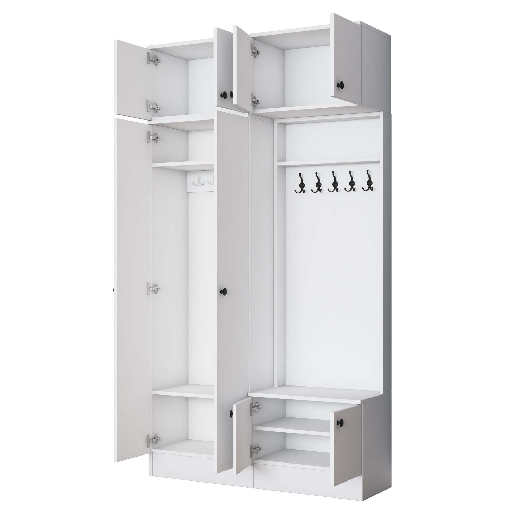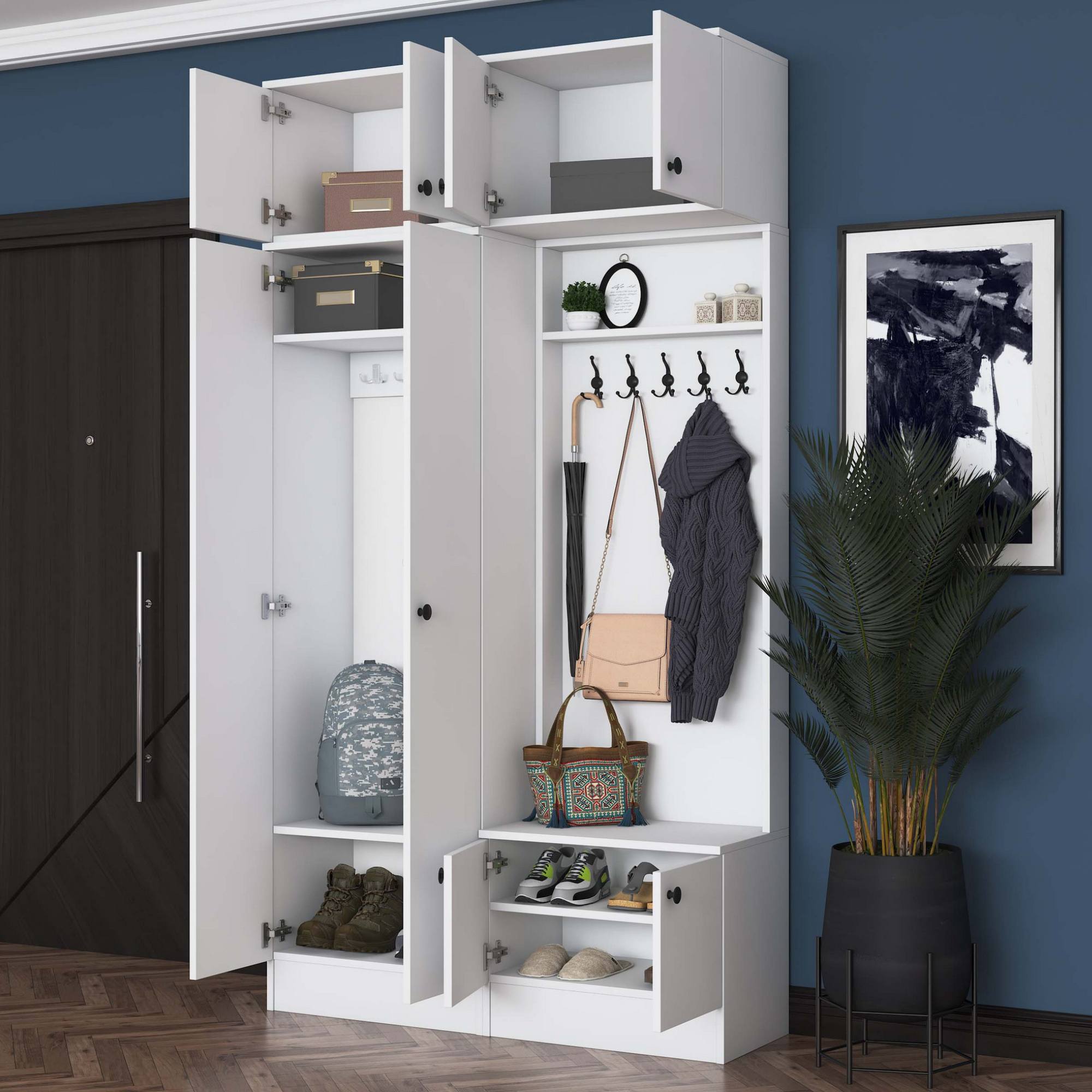 Sestava nabízí dostatek úložného prostoru. Její součástí jsou 4 vložené police, z nichž 3 se ukrývají za dvířky. Aby se s dvířky sestavy dobře manipulovalo, jsou vybavena úchyty. Nechybí ani 10 dvojitých háčků, na které si můžete pověsit nejen často nošené kabáty či bundy, ale i různé módní doplňky. 5 z těchto háčků se nachází za dvířky.