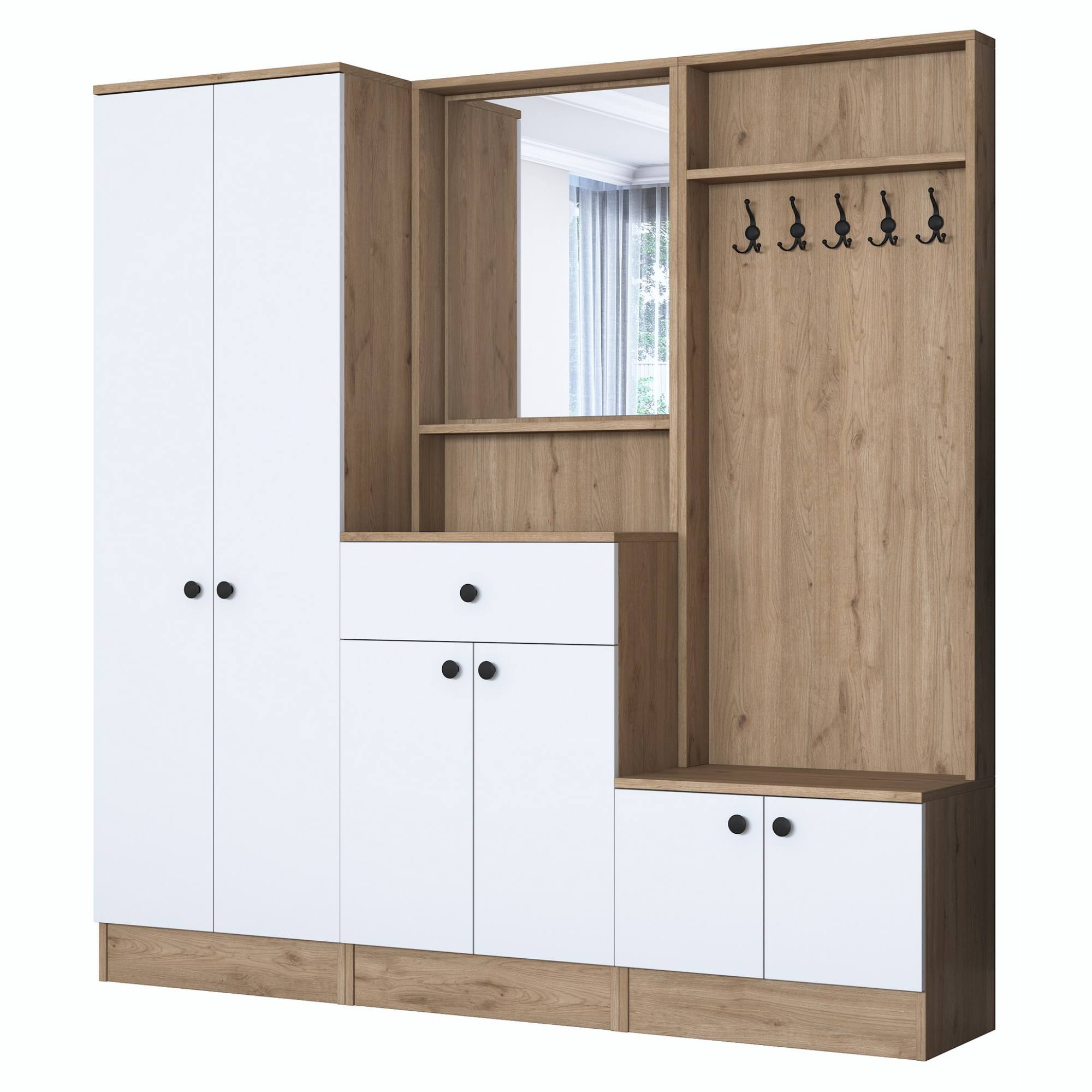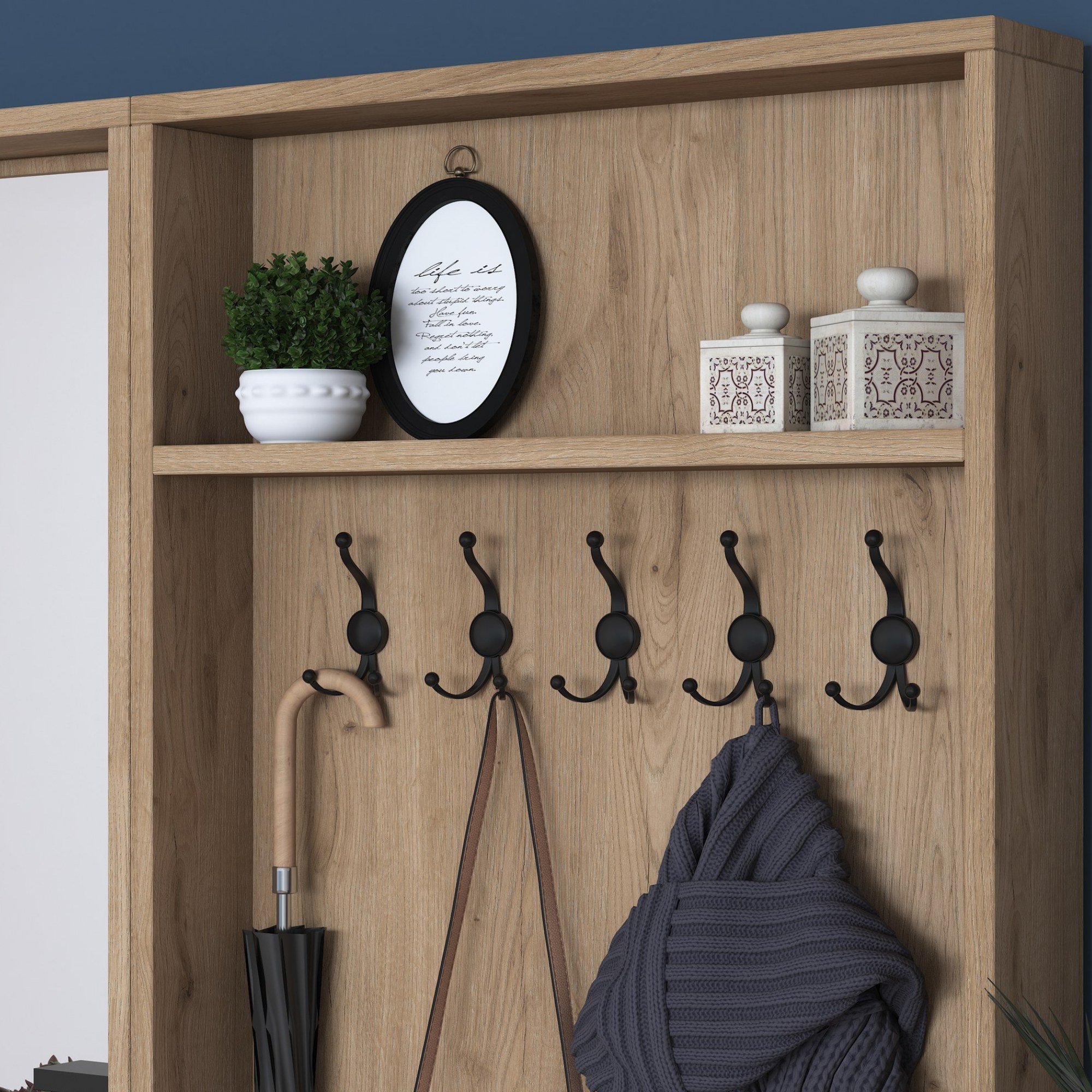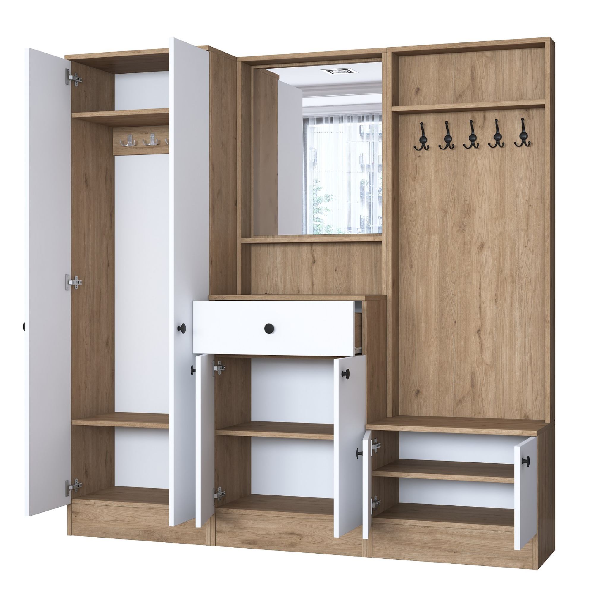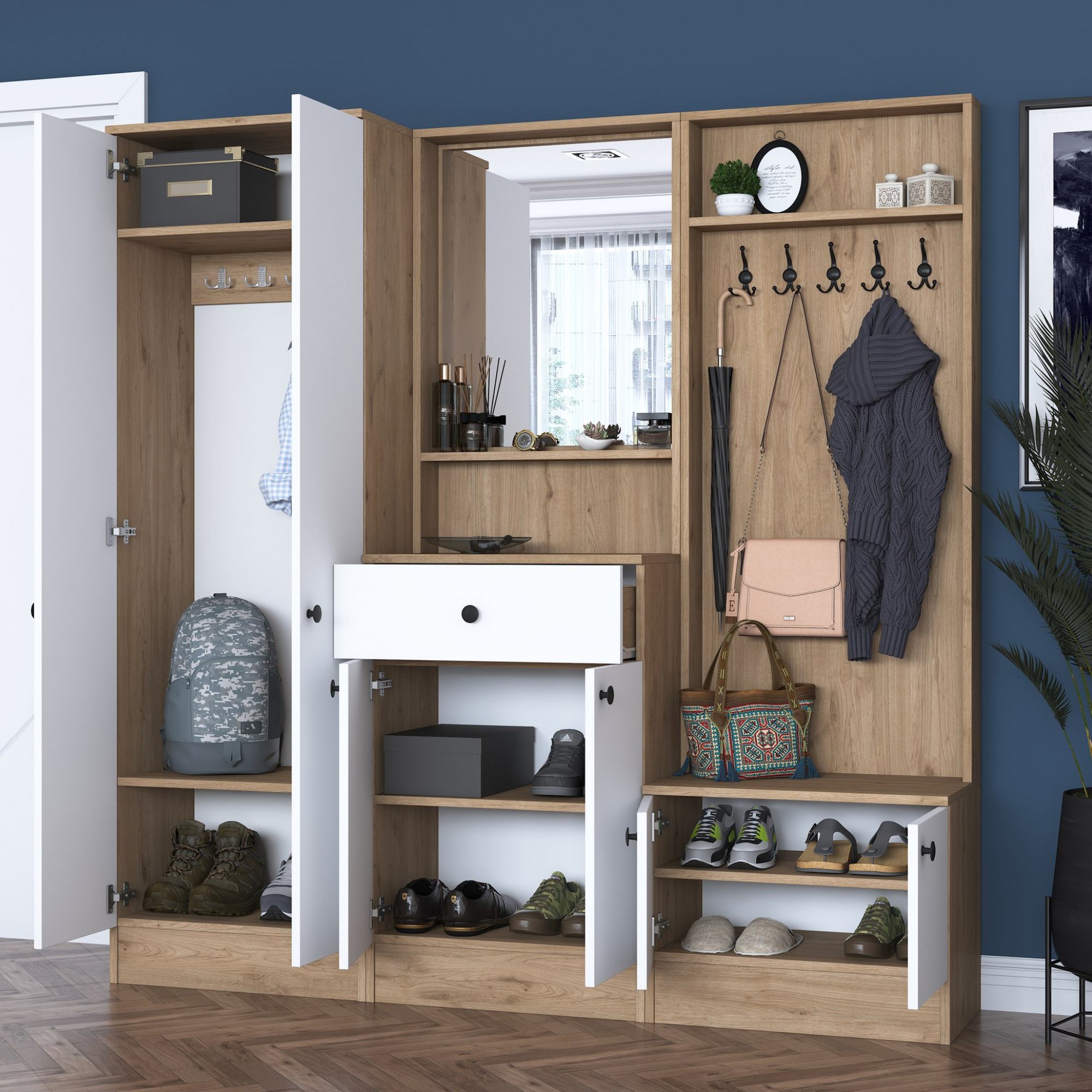 Sestava nabízí dostatek úložného prostoru. Ten zahrnuje 5 vložených polic, z nichž 4 se ukrývají za dvířky, a 1 zásuvku ideální pro uložení drobností. Aby se s dvířky a zásuvkou dobře manipulovalo, jsou vybaveny úchyty. Nechybí ani 10 dvojitých háčků, na které si můžete pověsit nejen často nošené kabáty či bundy, ale i různé módní doplňky. 5 z těchto háčků se nachází za dvířky. Součástí sestavy je i zrcadlo, v němž si můžete vždy před odchodem z domova zkontrolovat váš vzhled.