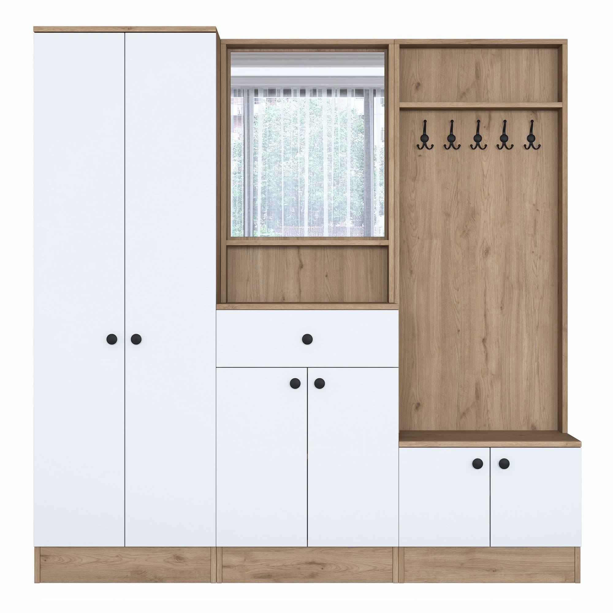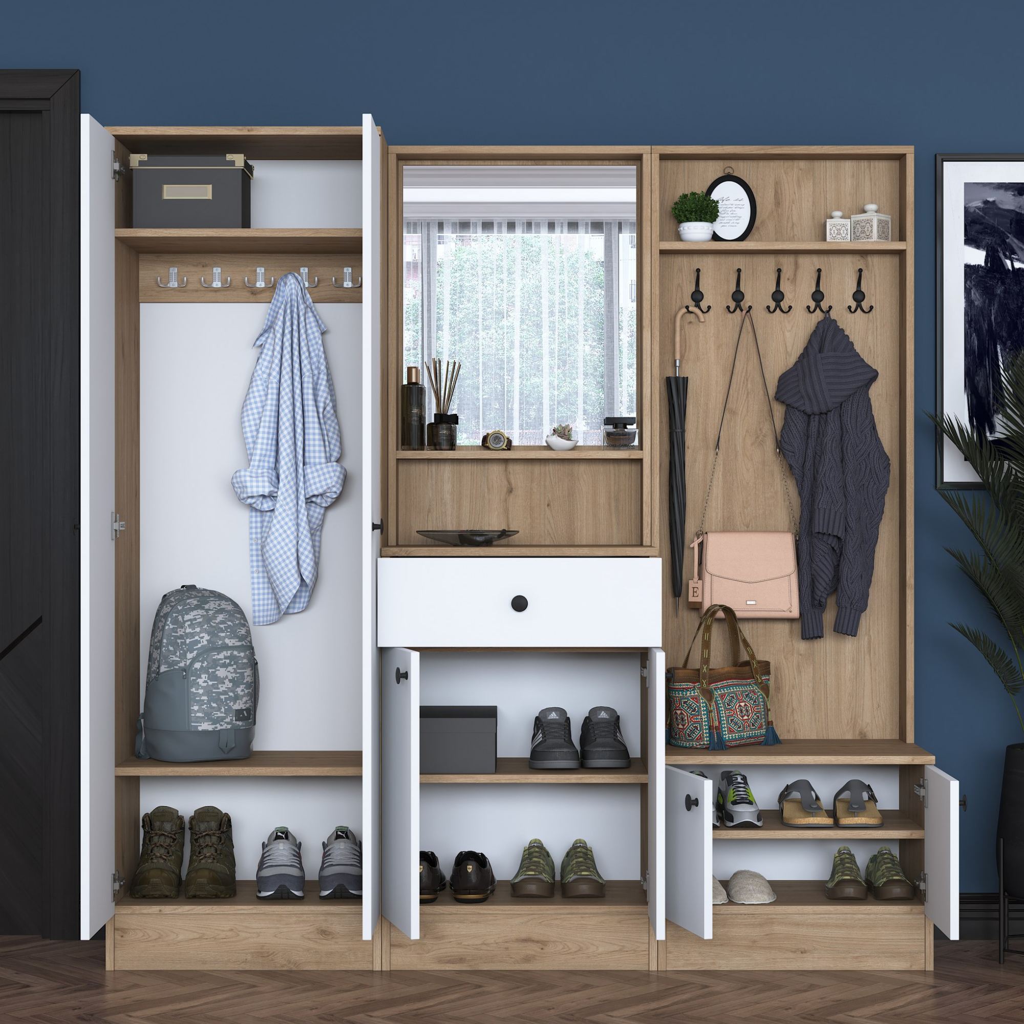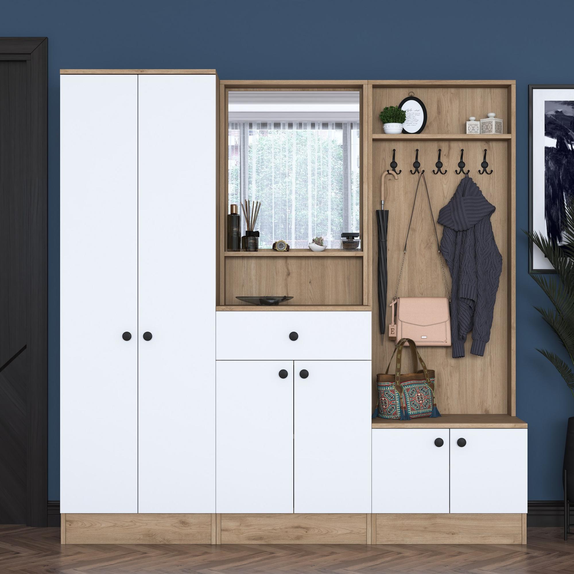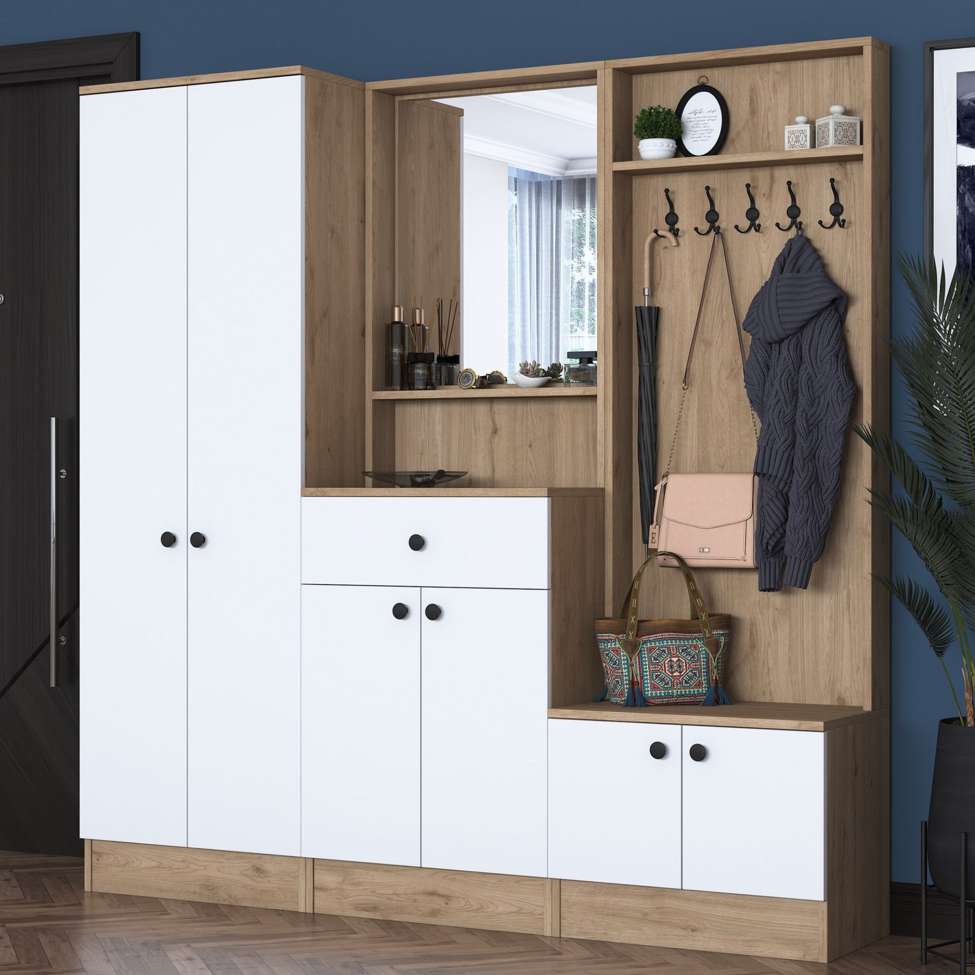 Sestava nabízí dostatek úložného prostoru. Ten zahrnuje 5 vložených polic, z nichž 4 se ukrývají za dvířky, a 1 zásuvku ideální pro uložení drobností. Aby se s dvířky a zásuvkou dobře manipulovalo, jsou vybaveny úchyty. Nechybí ani 10 dvojitých háčků, na které si můžete pověsit nejen často nošené kabáty či bundy, ale i různé módní doplňky. 5 z těchto háčků se nachází za dvířky. Součástí sestavy je i zrcadlo, v němž si můžete vždy před odchodem z domova zkontrolovat váš vzhled.