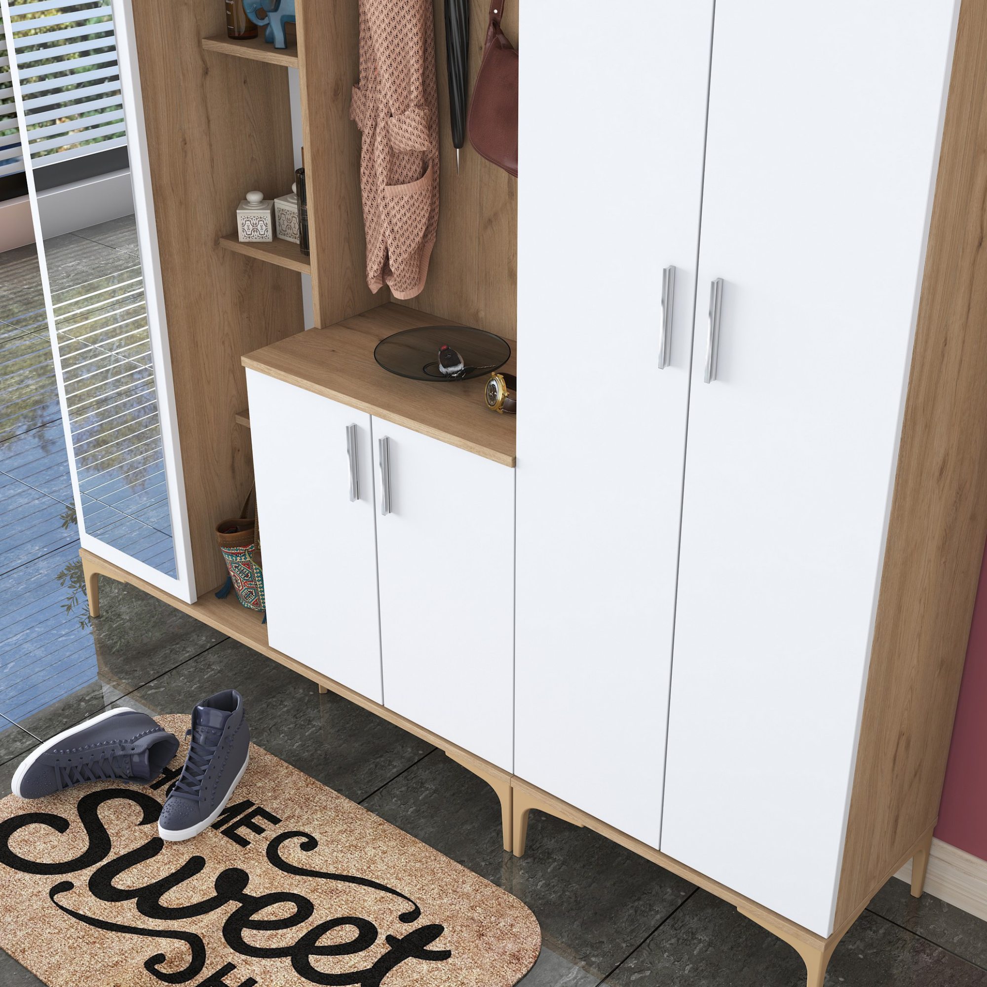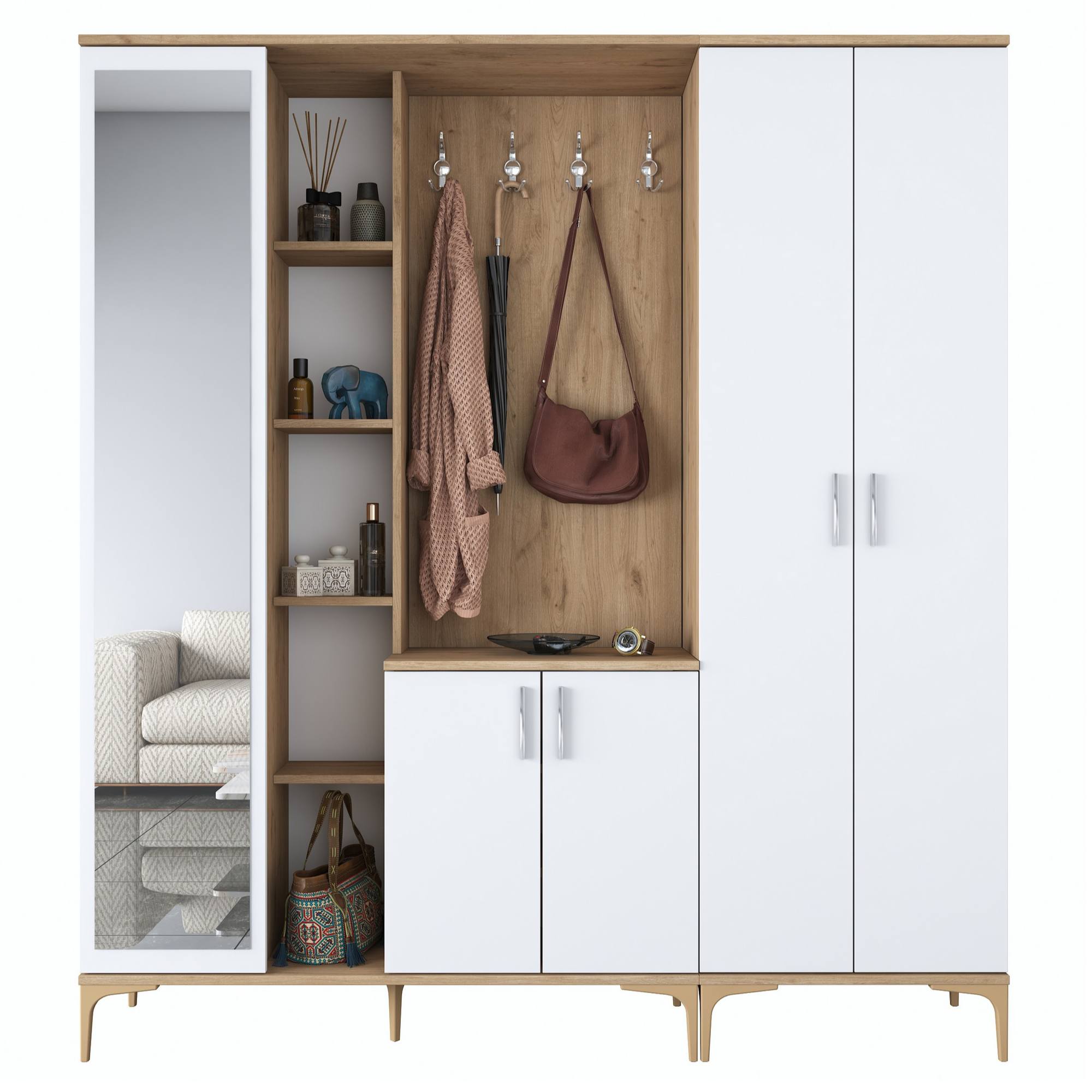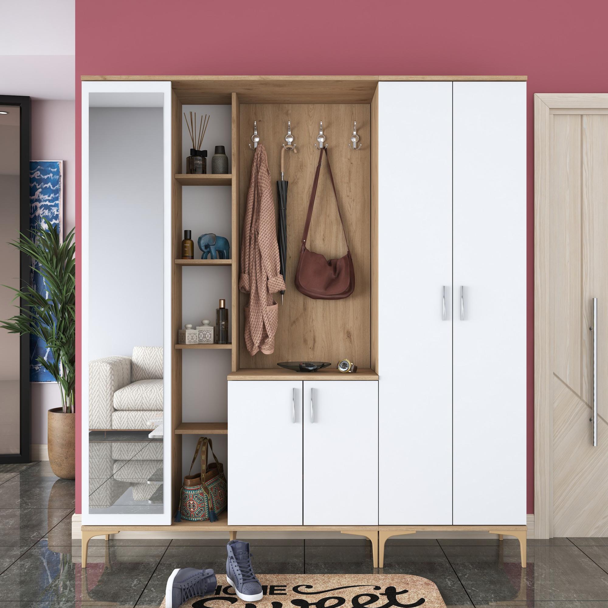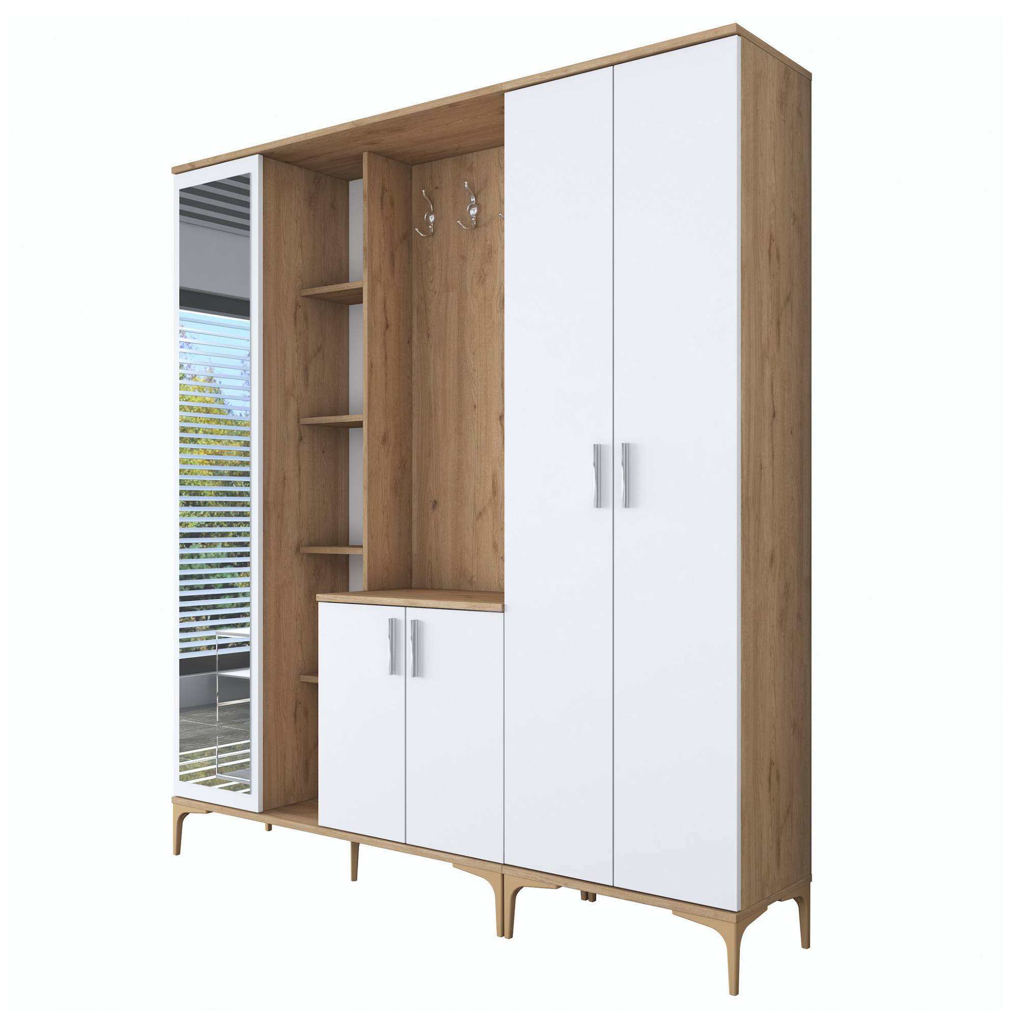 Sestava nabízí dostatek úložného prostoru. Její součástí je 13 vložených polic, z nichž 9 se ukrývá za dvířky. Aby se s dvířky sestavy dobře manipulovalo, jsou vybavena úchyty. Nechybí ani 8 dvojitých háčků, na které si můžete pověsit nejen často nošené kabáty či bundy, ale i různé módní doplňky. Sestava je vybavena také zrcadlem a má vysoké nohy, které usnadňují úklid pod ní.