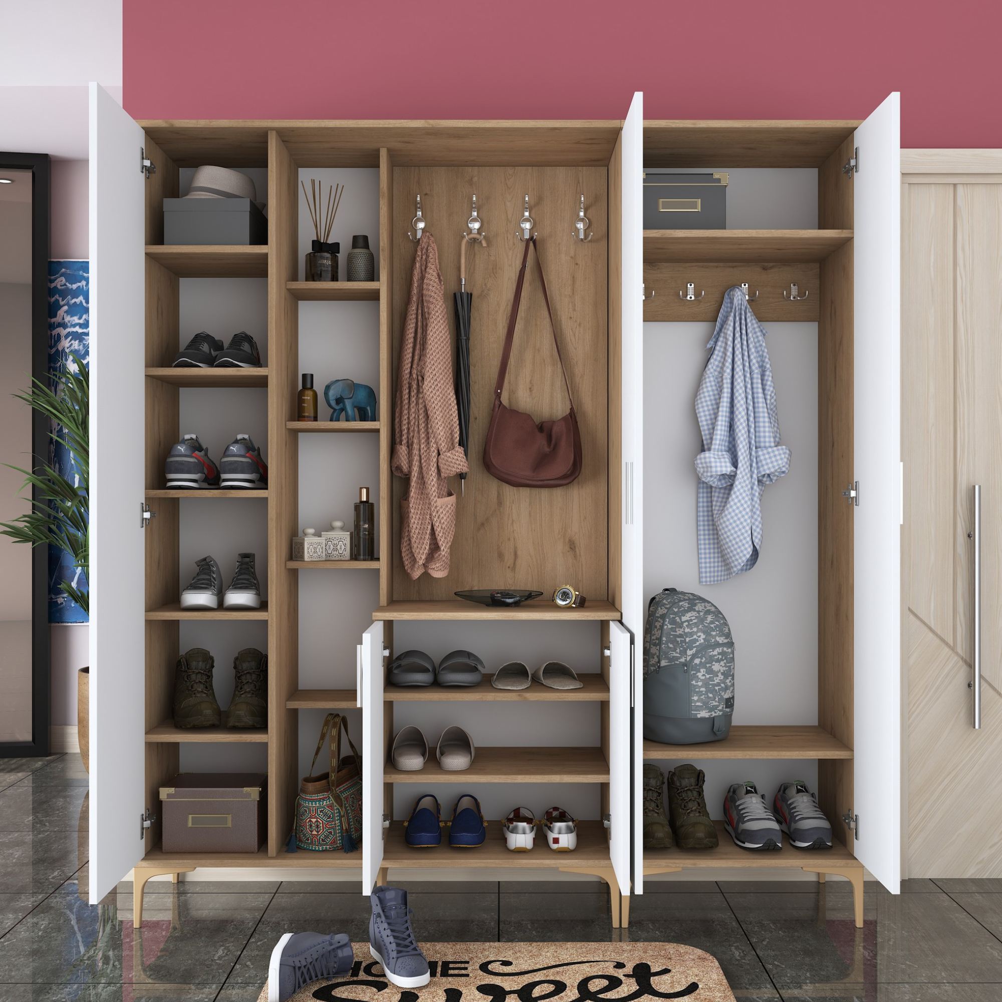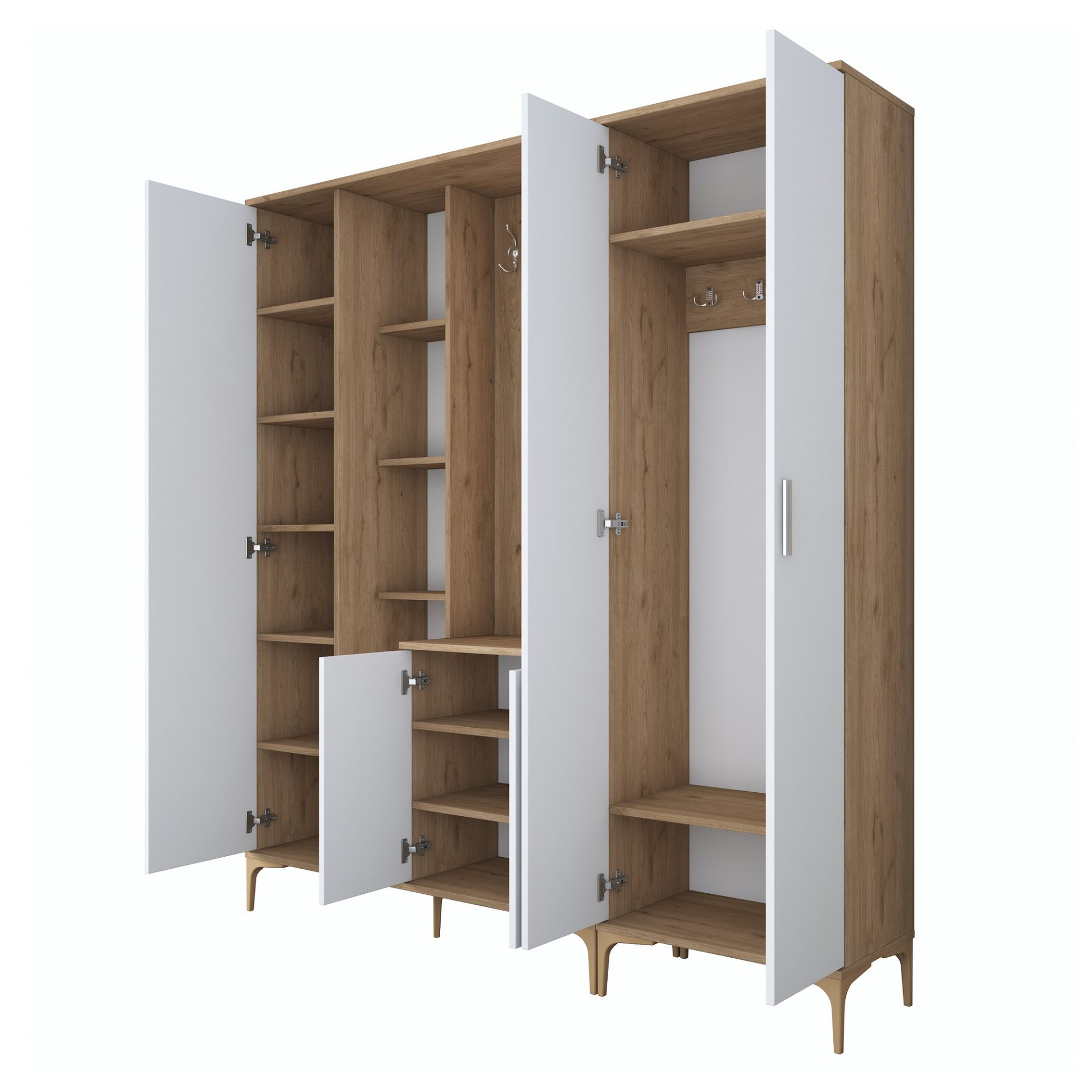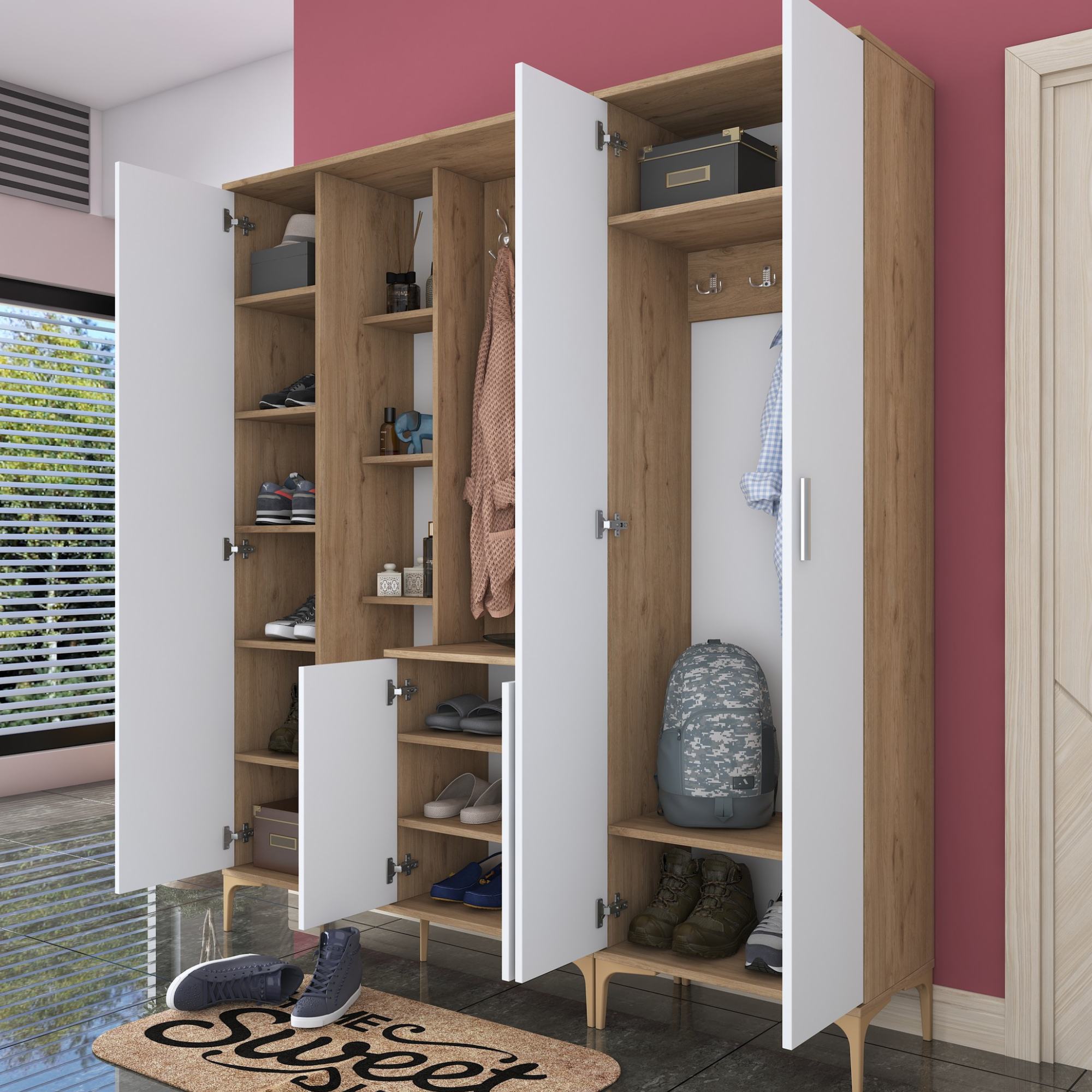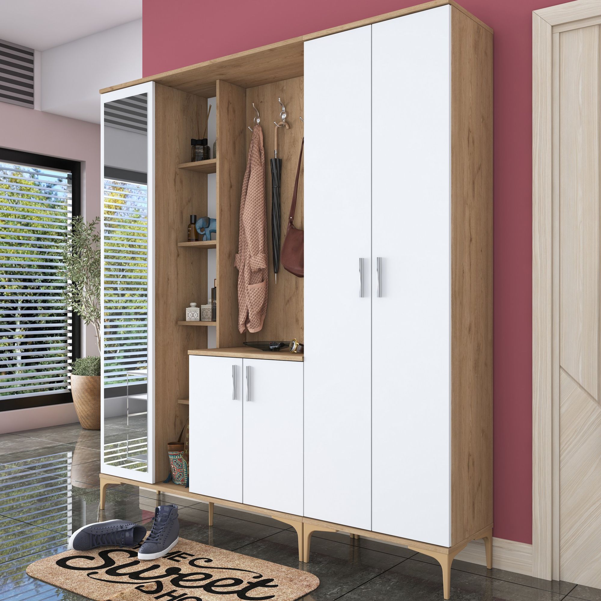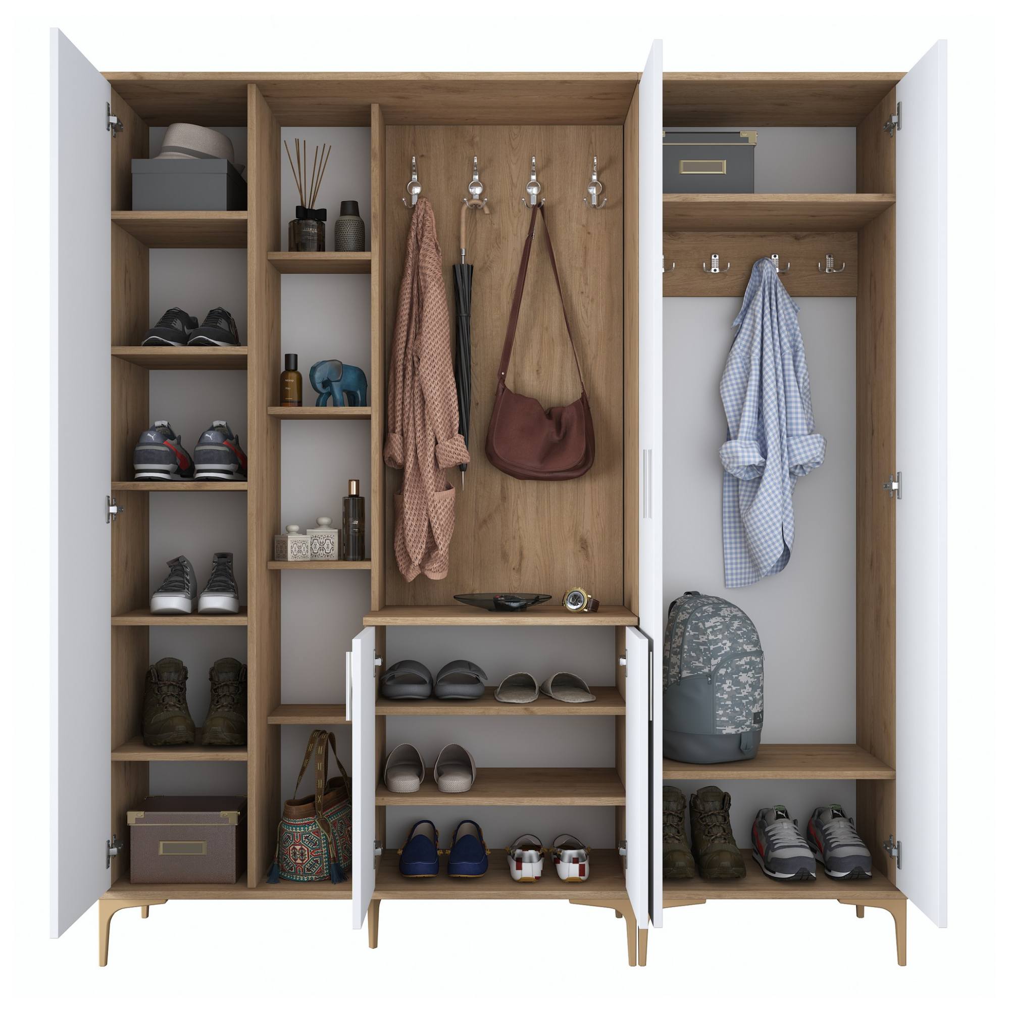 Sestava nabízí dostatek úložného prostoru. Její součástí je 13 vložených polic, z nichž 9 se ukrývá za dvířky. Aby se s dvířky sestavy dobře manipulovalo, jsou vybavena úchyty. Nechybí ani 8 dvojitých háčků, na které si můžete pověsit nejen často nošené kabáty či bundy, ale i různé módní doplňky. Sestava je vybavena také zrcadlem a má vysoké nohy, které usnadňují úklid pod ní.