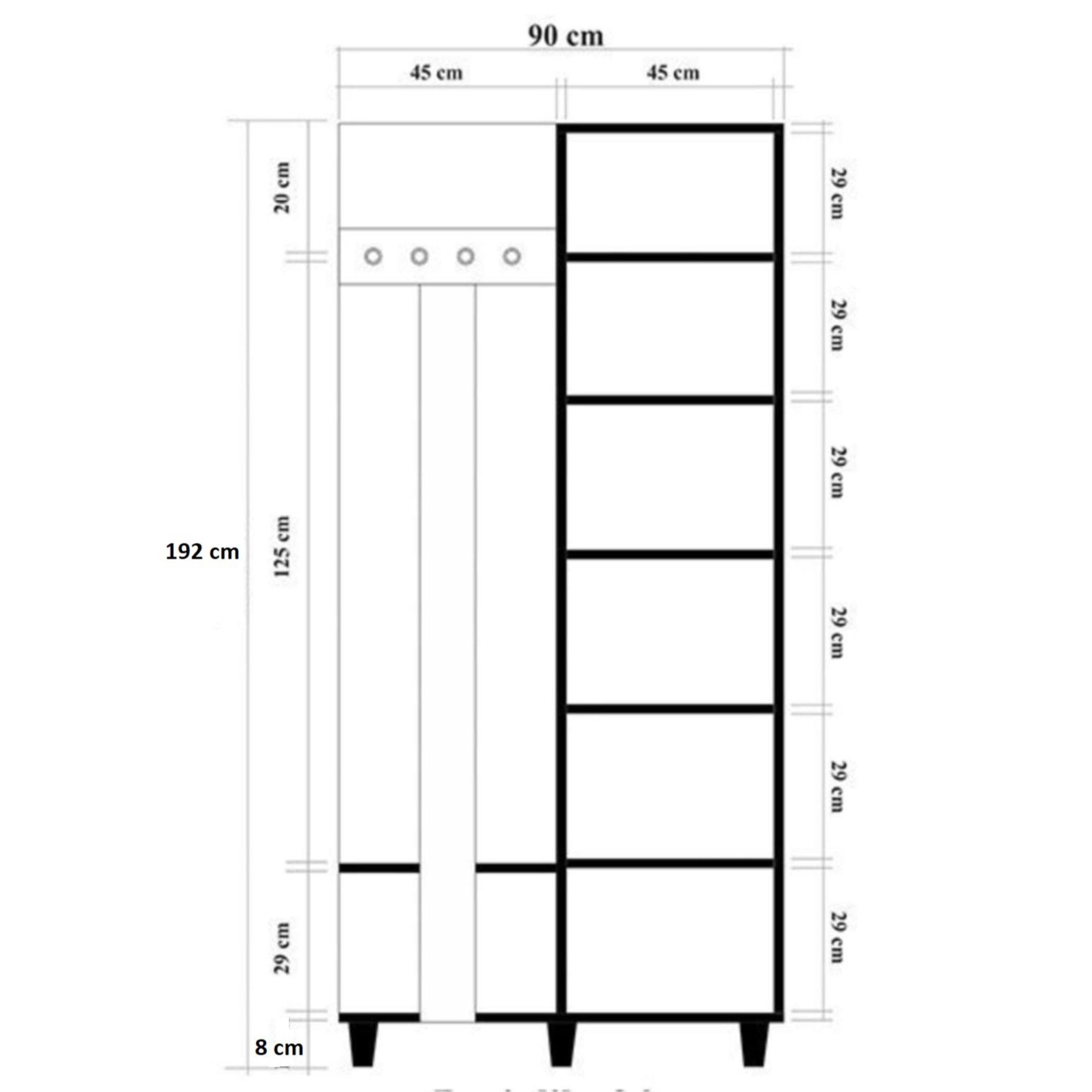 Kromě vzhledu vás tato sestava potěší i dostatkem úložného prostoru. Její součástí je 6 vložených polic, z nichž 5 je umístěno za dvířky. Aby se s dvířky lépe manipulovalo, jsou vybavena úchytem. Sestava dále disponuje 4 háčky a 1 šatní tyčí.