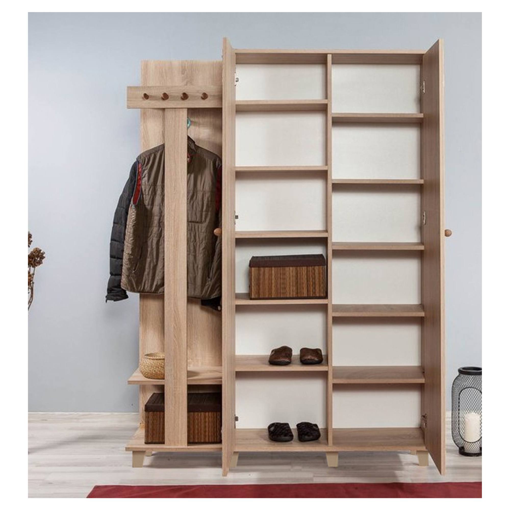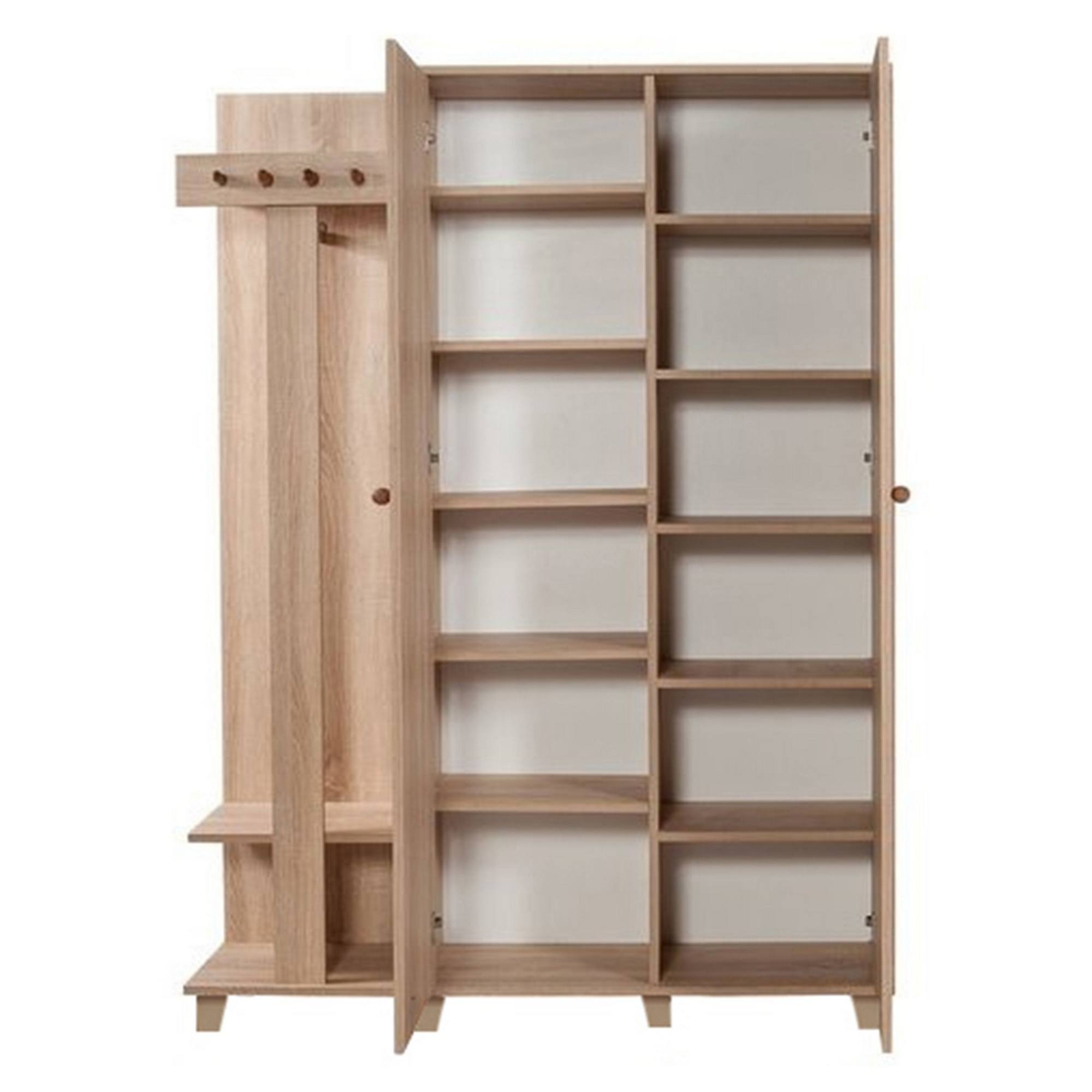 Kromě vzhledu vás tato sestava potěší i dostatkem úložného prostoru. Její součástí je *11 vložených polic**, z nichž 10 je umístěno za dvířky. Aby se s dvířky lépe manipulovalo, jsou vybavena dřevěnými úchyty. Sestava dále disponuje 4 háčky a 1 šatní tyčí.