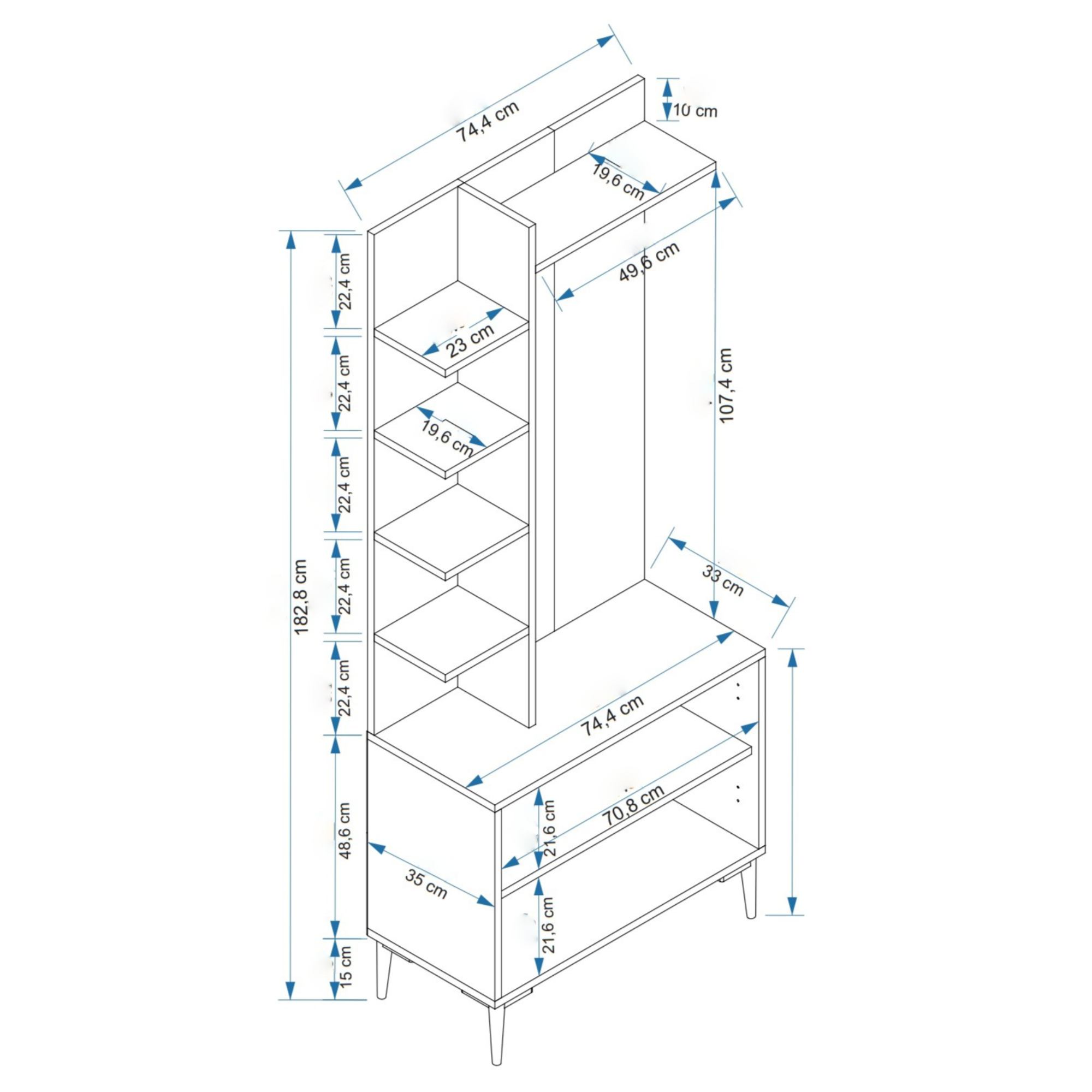 Sestava nabízí dostatek úložného prostoru. Její součástí je 6 vložených polic, z nichž 1 je ukryta za otočnými dvířky. Aby se s těmito dvířky dobře manipulovalo, jsou vybavena úchyty. Nechybí ani 4 háčky, na které si můžete pověsit nejen často nošené kabáty či bundy, ale i různé módní doplňky. Sestava má vysoké nohy, které usnadňují úklid pod ní.