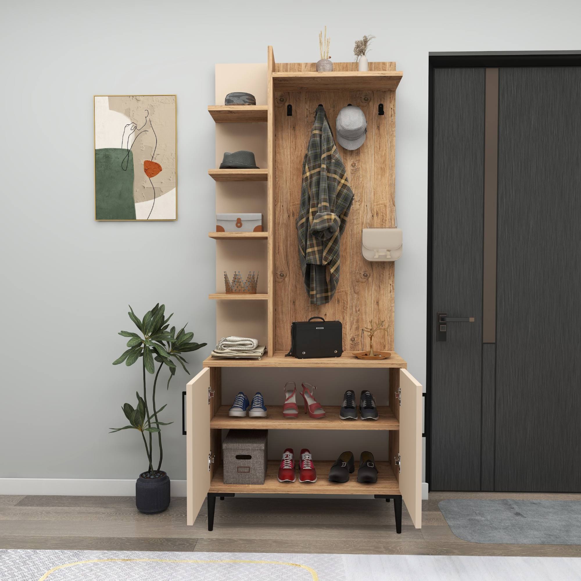 Sestava nabízí dostatek úložného prostoru. Její součástí je 6 vložených polic, z nichž 1 je ukryta za otočnými dvířky. Aby se s těmito dvířky dobře manipulovalo, jsou vybavena úchyty. Nechybí ani 4 háčky, na které si můžete pověsit nejen často nošené kabáty či bundy, ale i různé módní doplňky. Sestava má vysoké nohy, které usnadňují úklid pod ní.