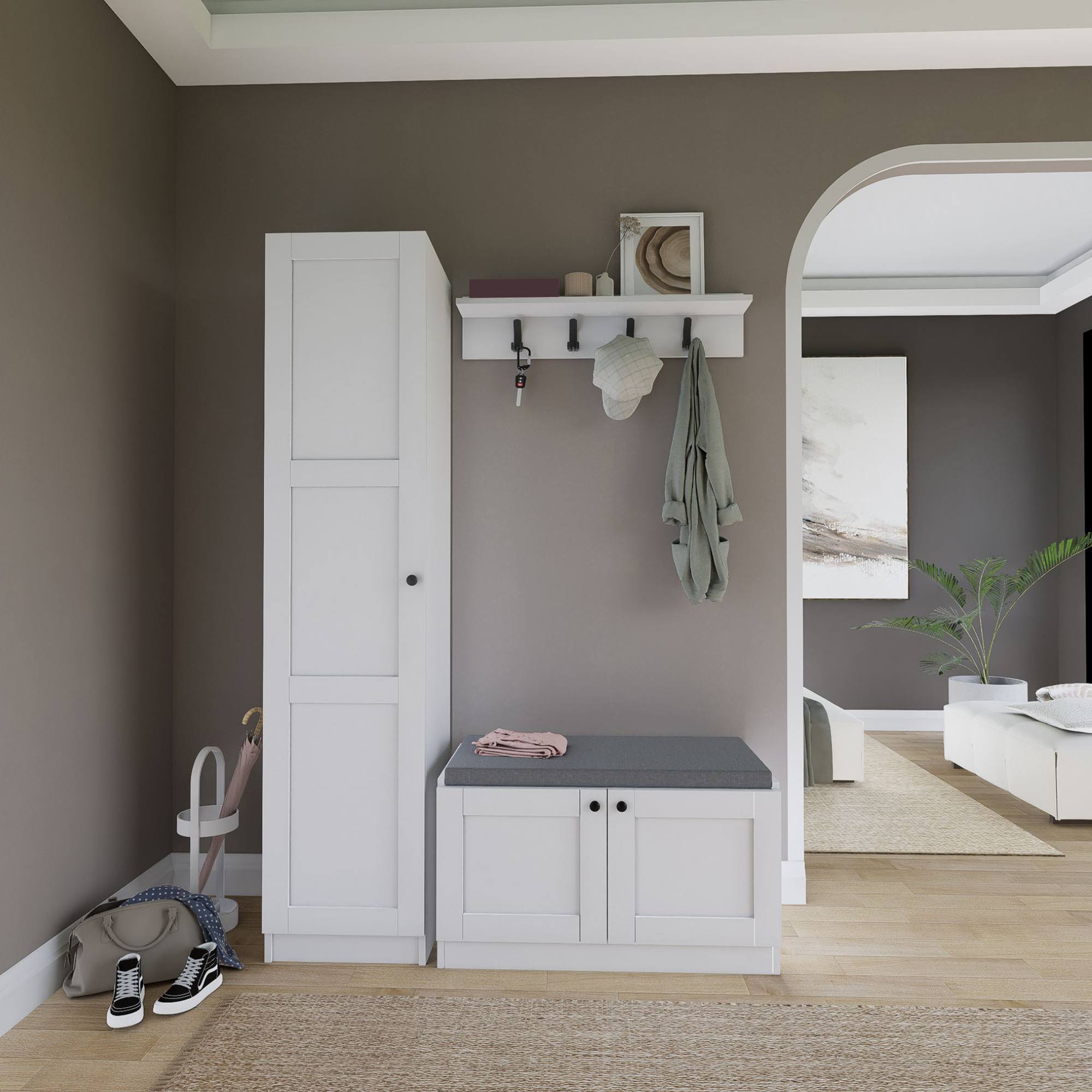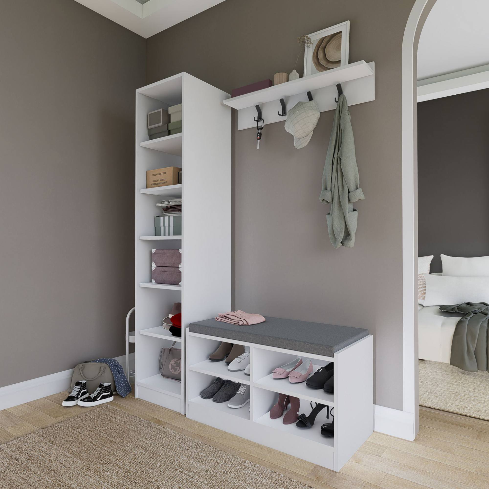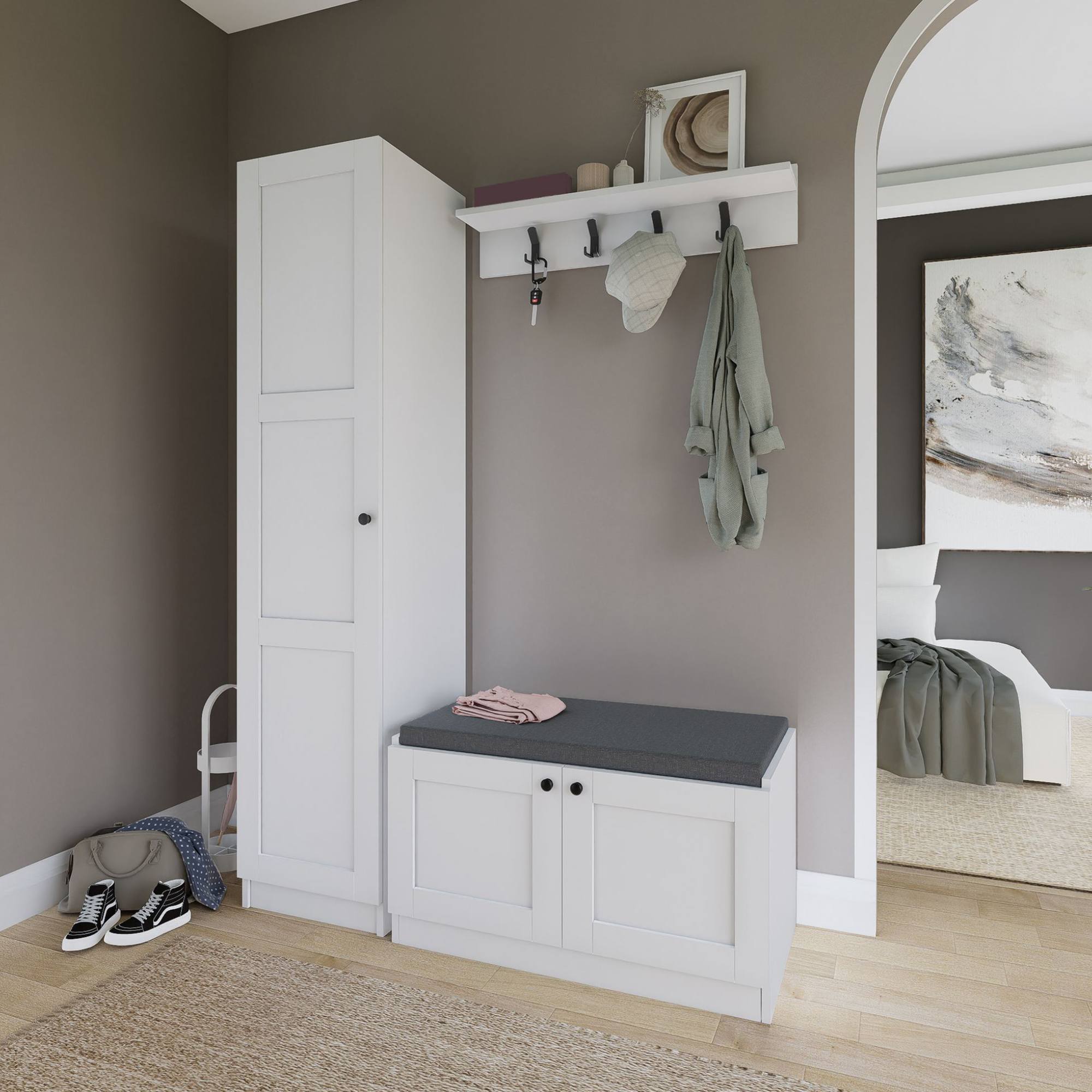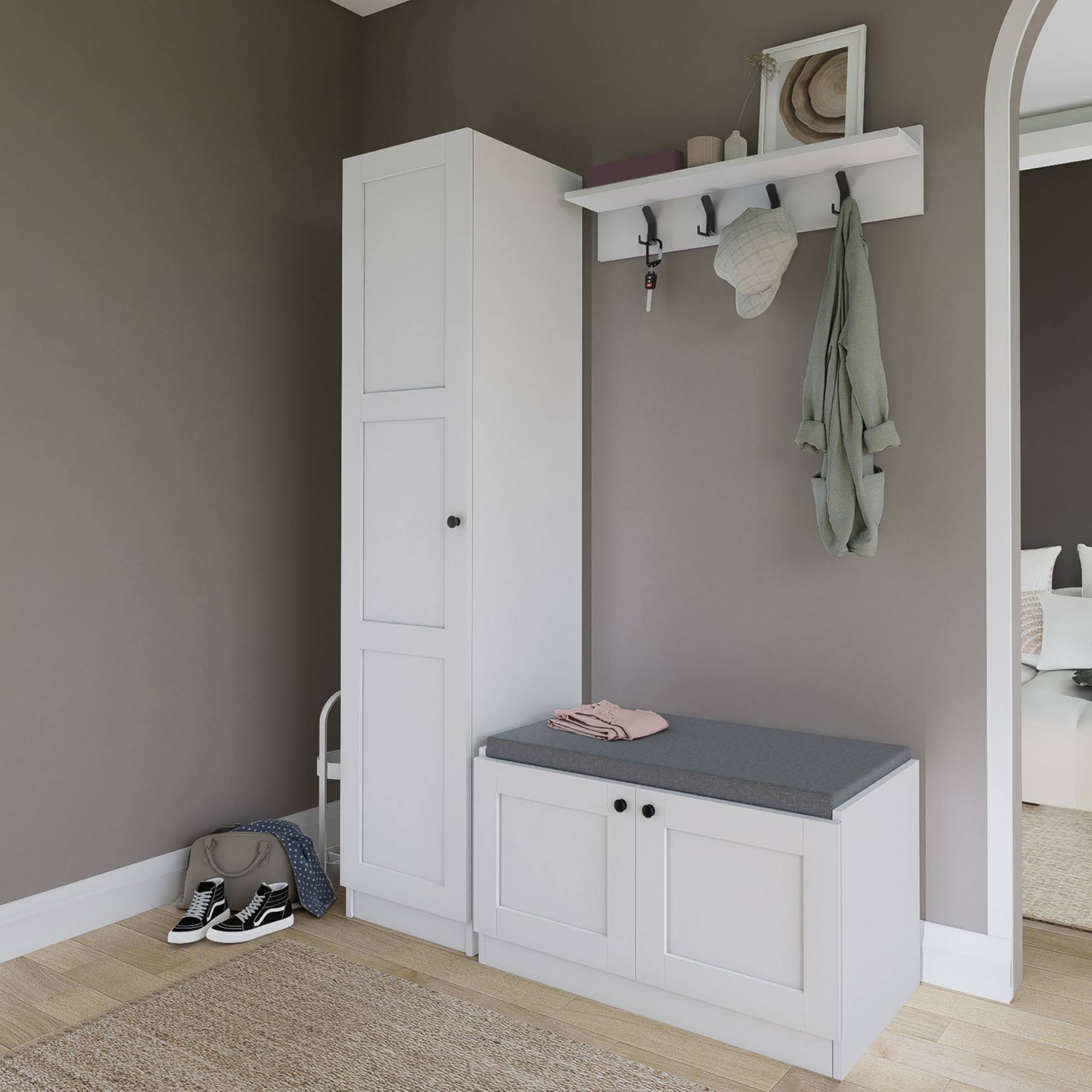 Botníková lavice nabízí nejen místo na sezení, ale i 2 vložené police. Dalších 5 polic se ukrývá za dvířky skříňky. Dvířka jsou pro snadnější manipulaci vybavena úchyty. Nástěnná police je vybavena 4 dvojitými háčky.