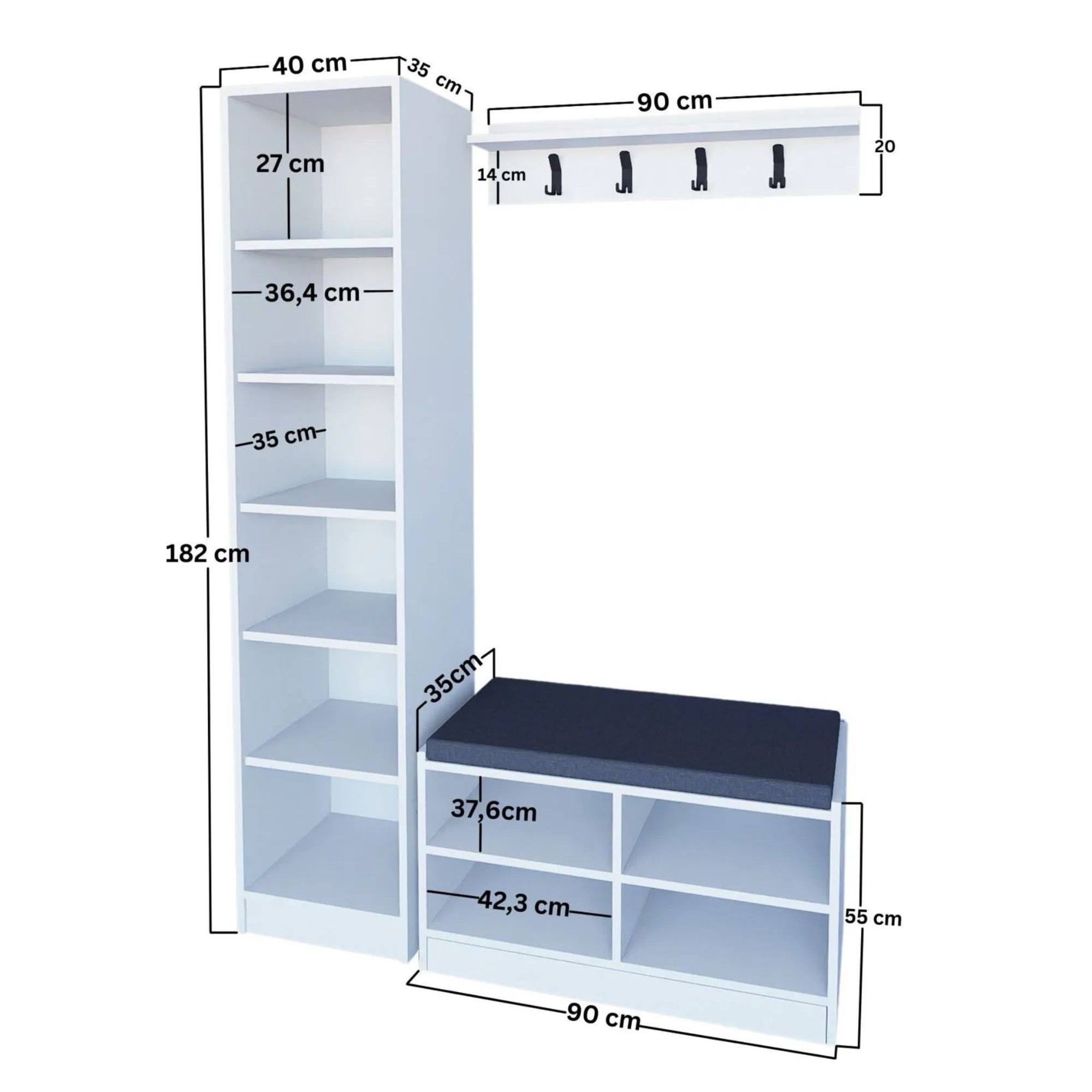 - Skládá se z: Botníková lavice, skříňka, nástěnná police
