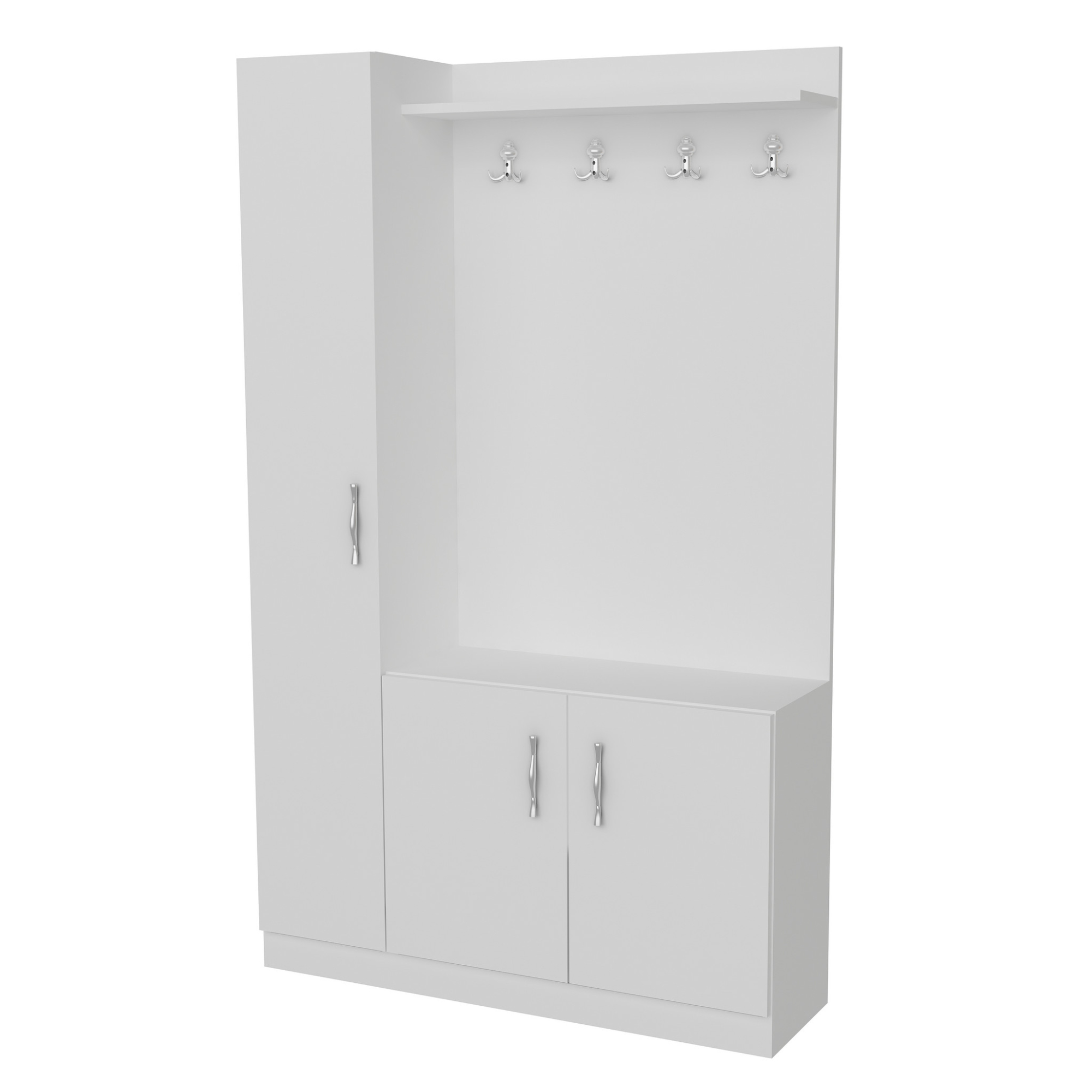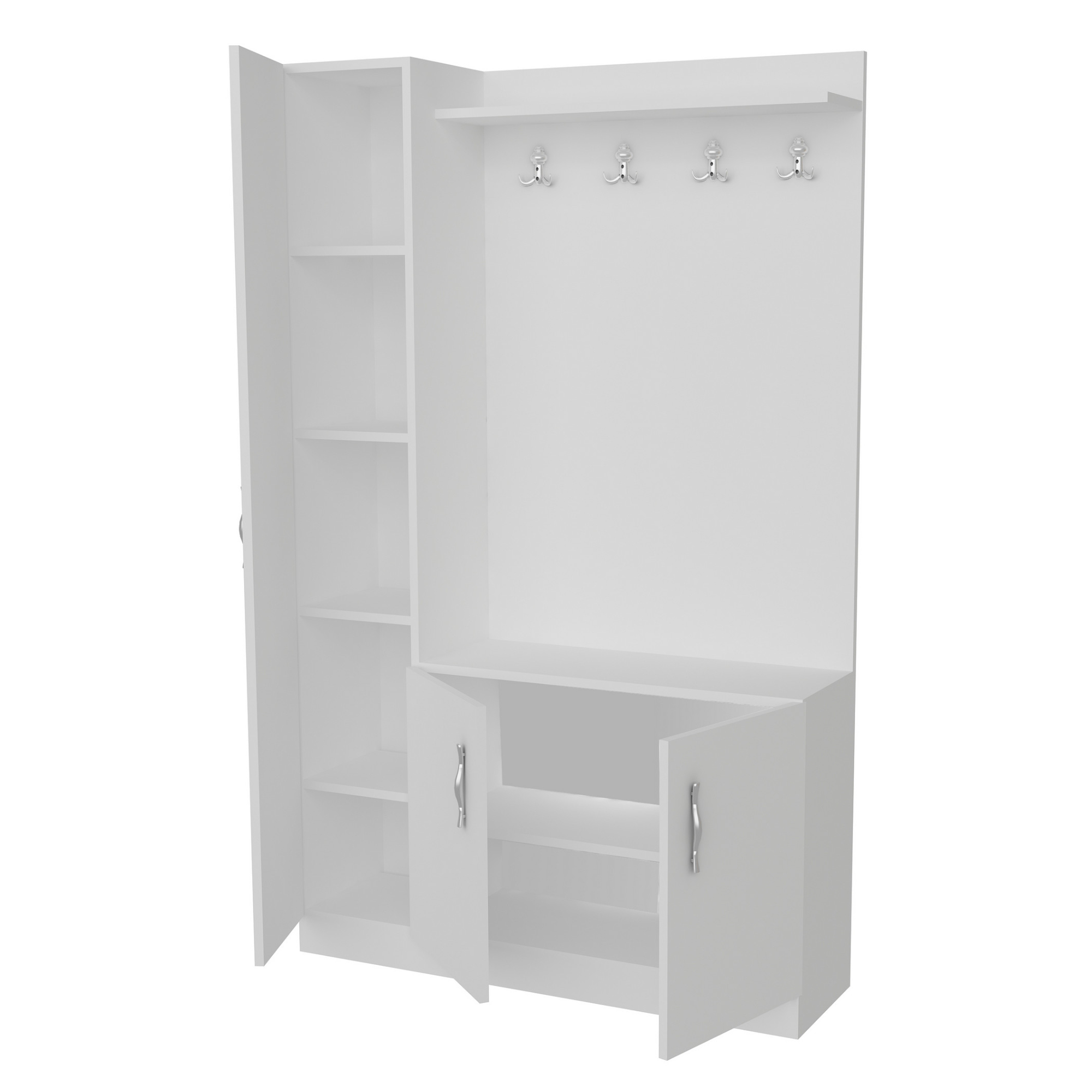 Sestava nabízí dostatek úložného prostoru. Její součástí je 6 vložených polic, z nichž 5 se ukrývá za otočnými dvířky. Aby se s těmito dvířky dobře manipulovalo, jsou vybavena úchyty. Nechybí ani 4 dvojité háčky, na které si můžete pověsit nejen často nošené kabáty či bundy, ale i různé módní doplňky.