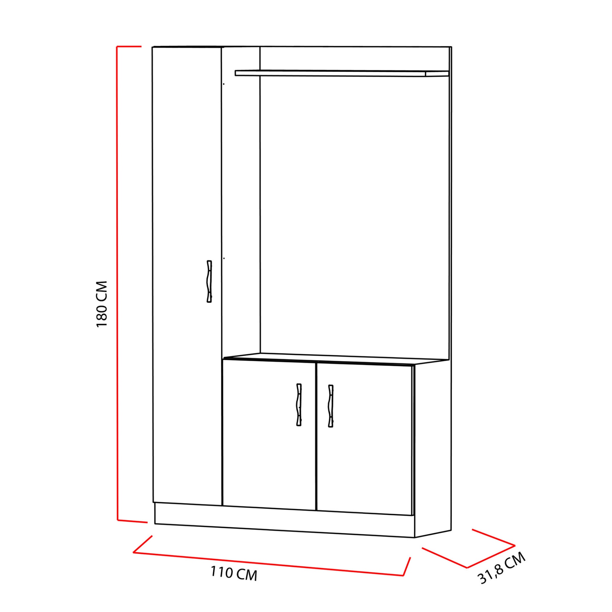Sestava nabízí dostatek úložného prostoru. Její součástí je 6 vložených polic, z nichž 5 se ukrývá za otočnými dvířky. Aby se s těmito dvířky dobře manipulovalo, jsou vybavena úchyty. Nechybí ani 4 dvojité háčky, na které si můžete pověsit nejen často nošené kabáty či bundy, ale i různé módní doplňky.