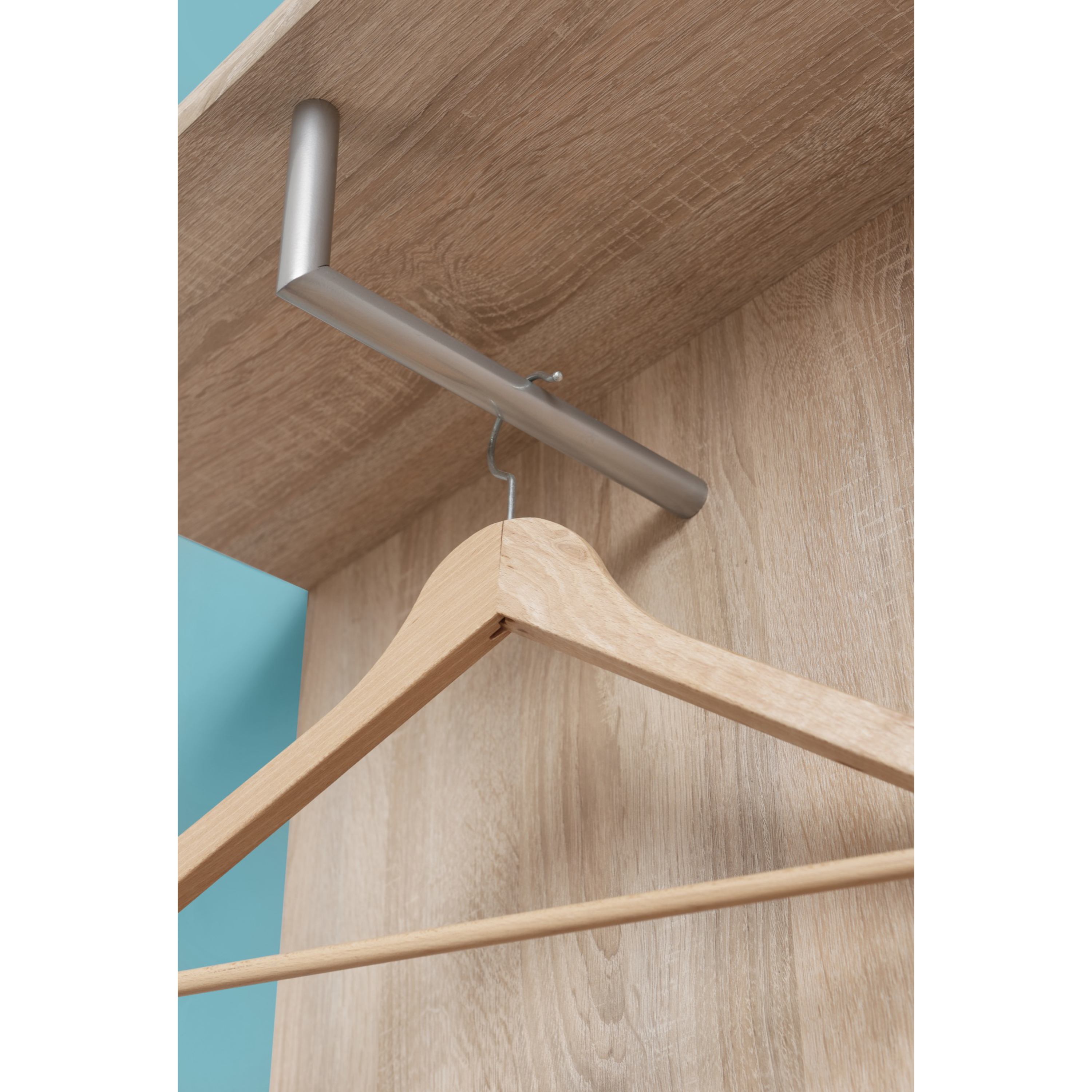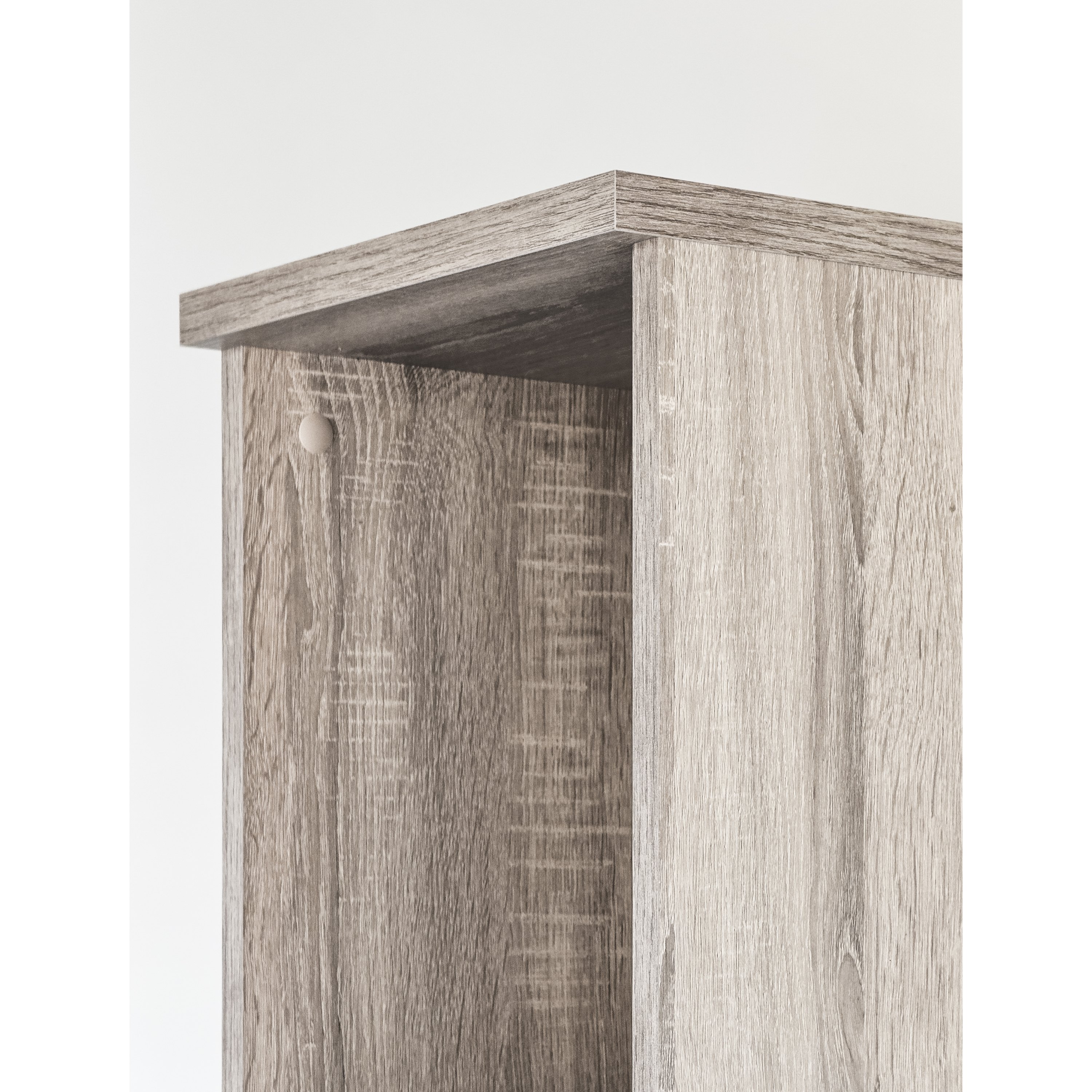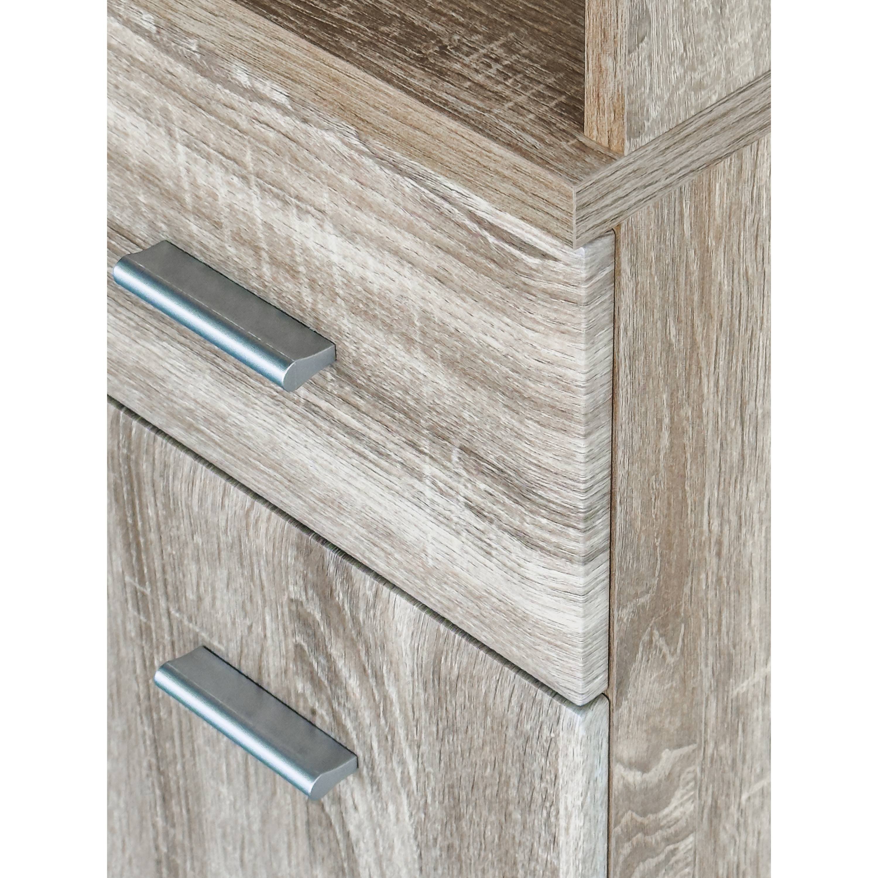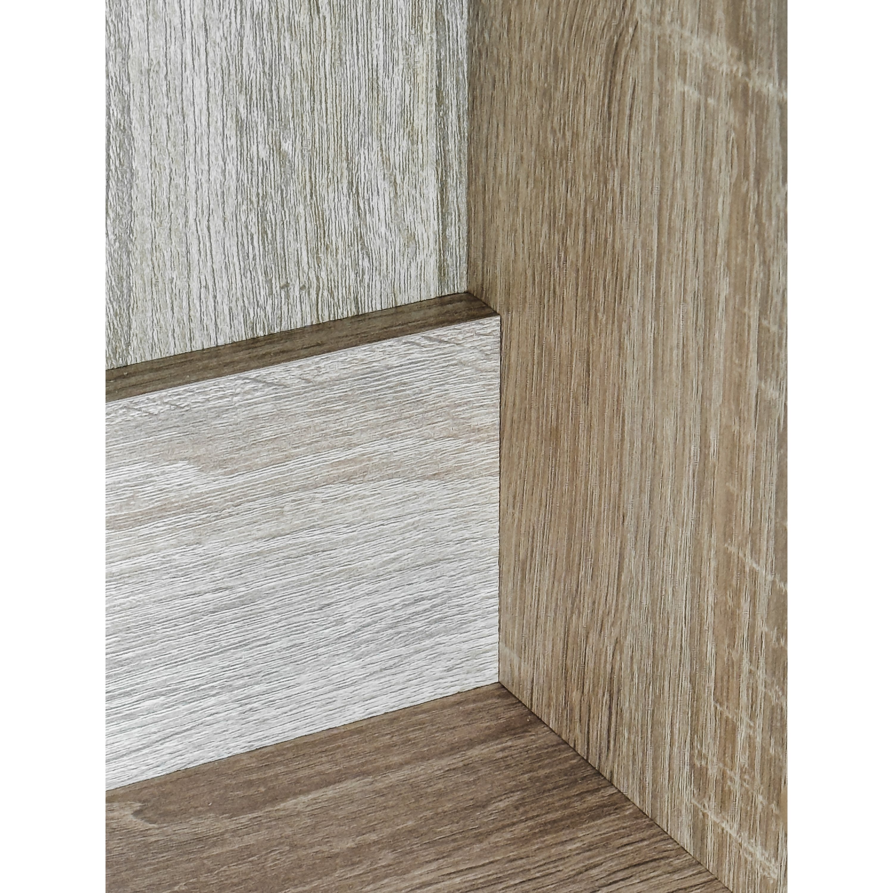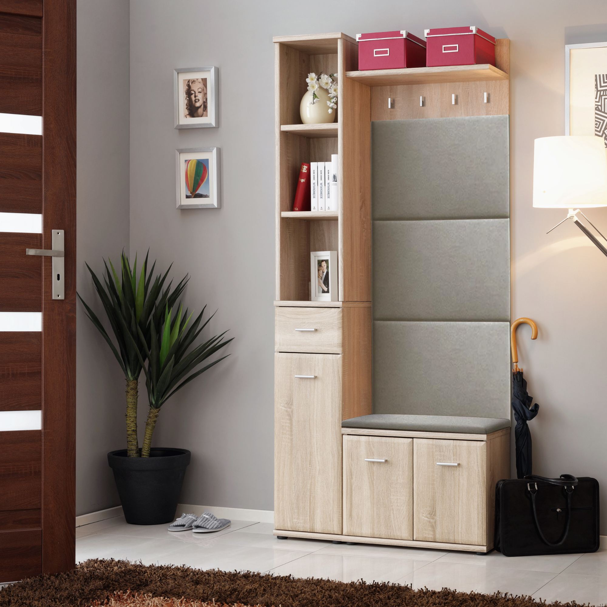 Součástí sestavy je vysoká skříň nabízející úložný prostor v podobě 2 otevřených polic, praktické zásuvky a 2 polic za otočnými dveřmi. Dalším prvkem je botníková lavice s čalouněným sedákem, s vloženou policí za párem otočných dveří. Její vrchní část skvěle poslouží pro sezení během přezouvání nebo pro odložení tašek.