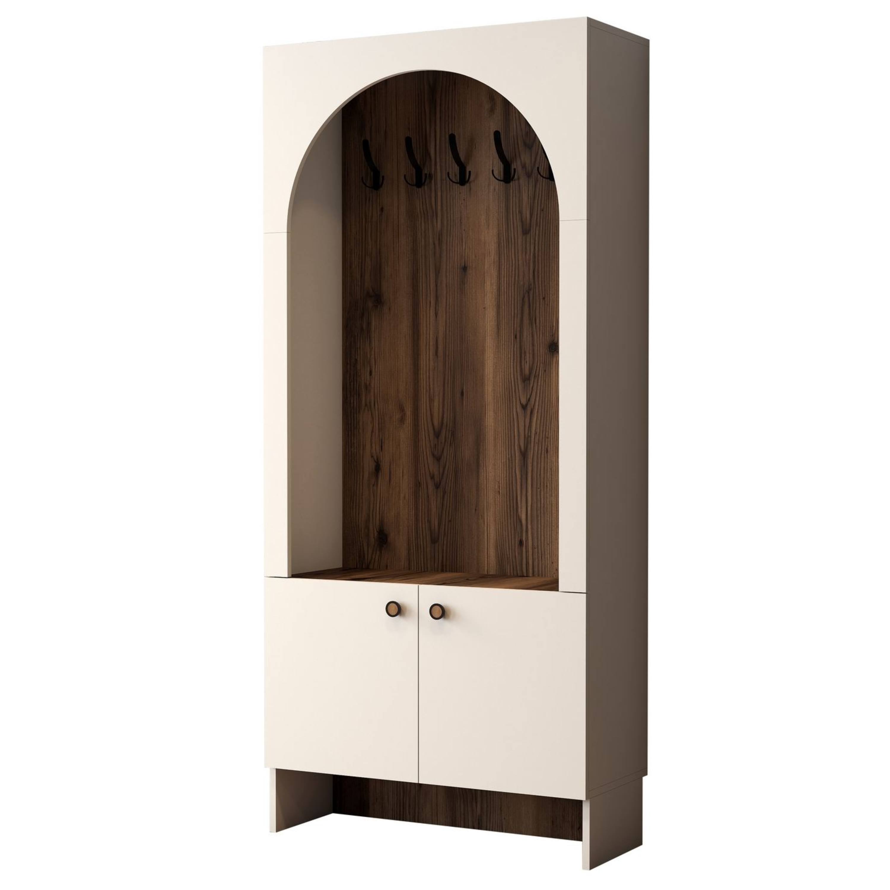 Sestava nabízí otevřený prostor s kontrastním atraktivním dekorem, ve kterém je umístěno 6 dvojitých háčků pro přehledné zavěšení kabátů, bund či doplňků. Nechybí ani odkládací plocha pro drobnosti, které chcete mít vždy po ruce. Ve spodní části se nachází uzavíratelný úložný prostor s otočnými dveřmi a praktickými úchyty. Vnitřní prostor je vybaven vloženou policí, která umožňuje přehledné uspořádání obuvi a dalších předmětů.