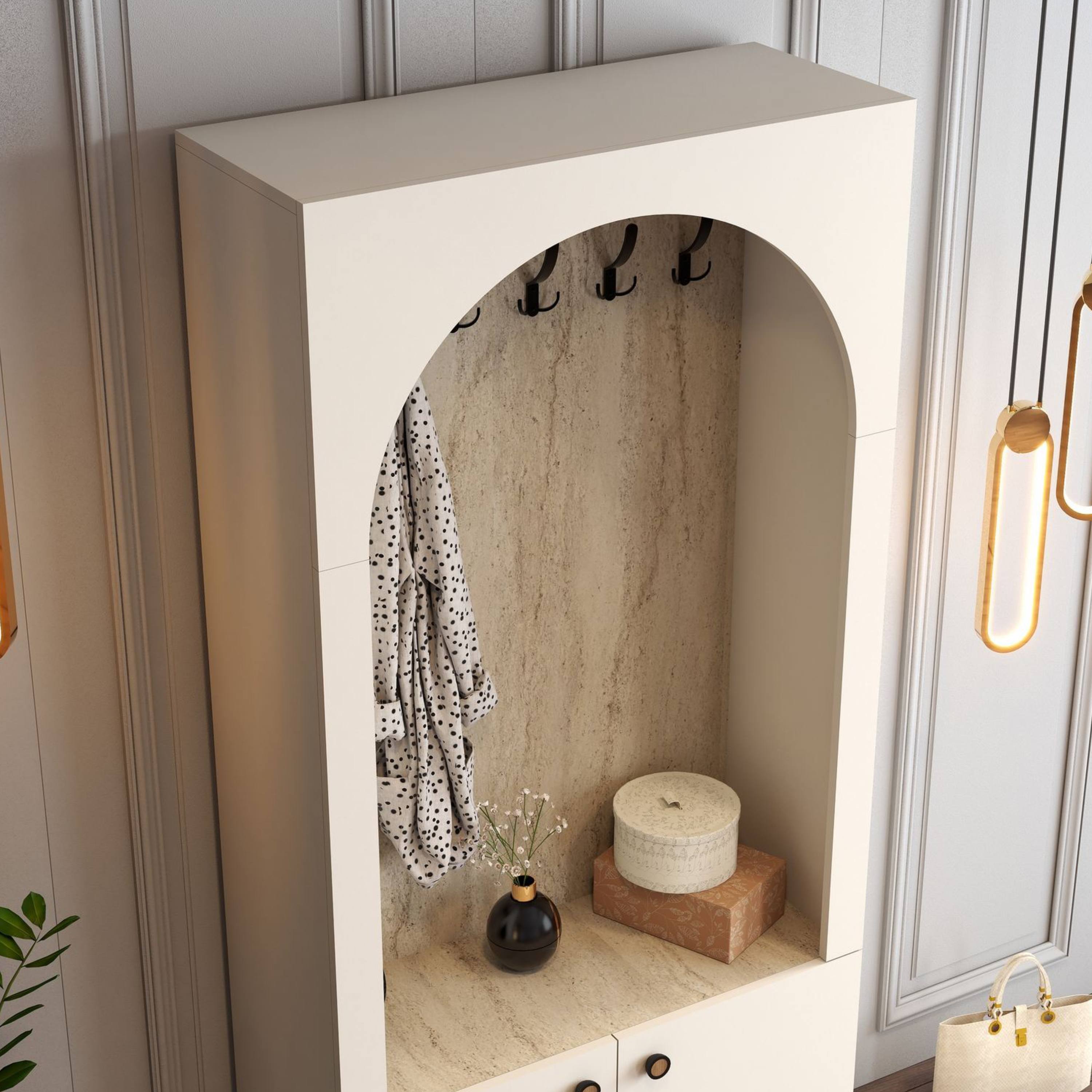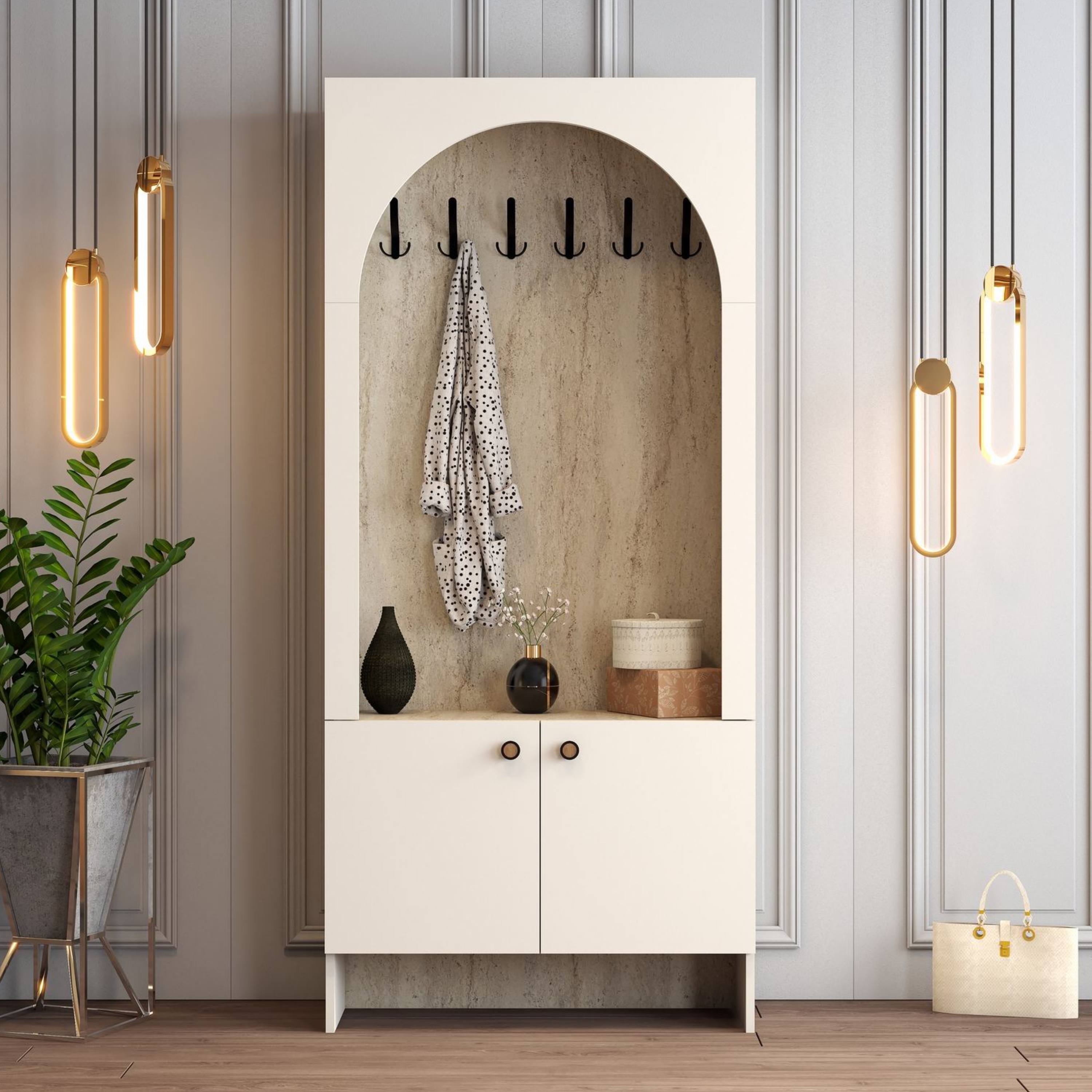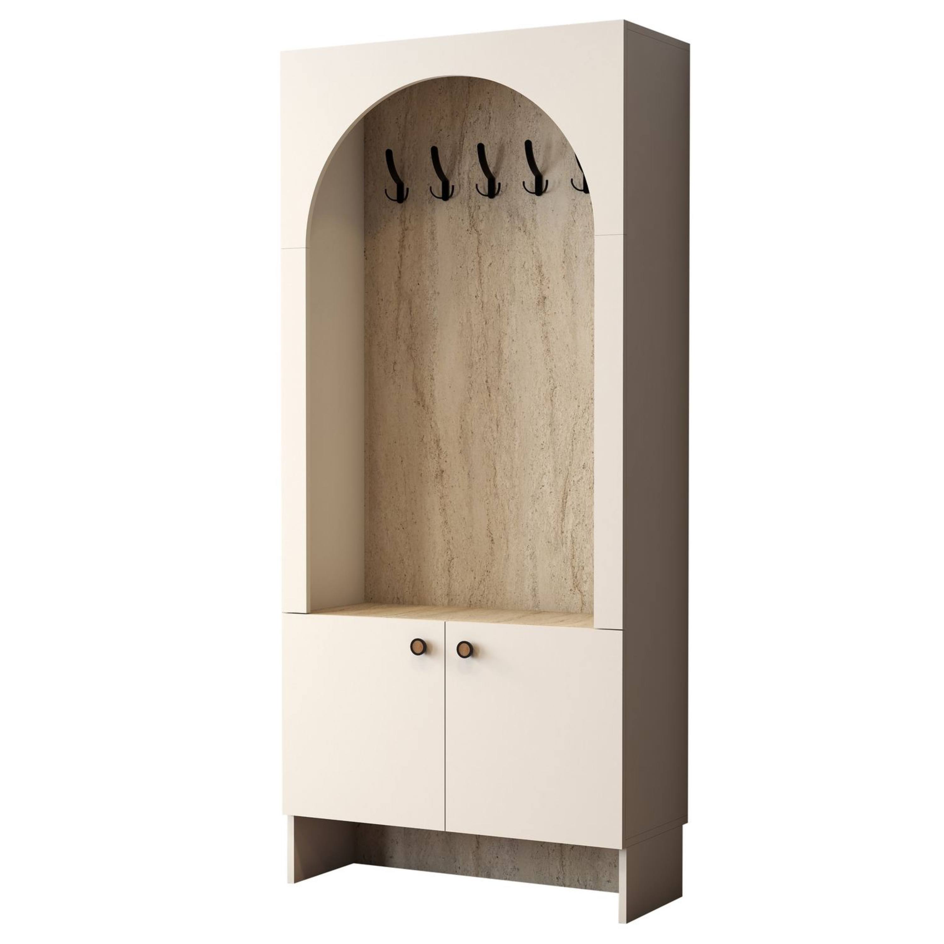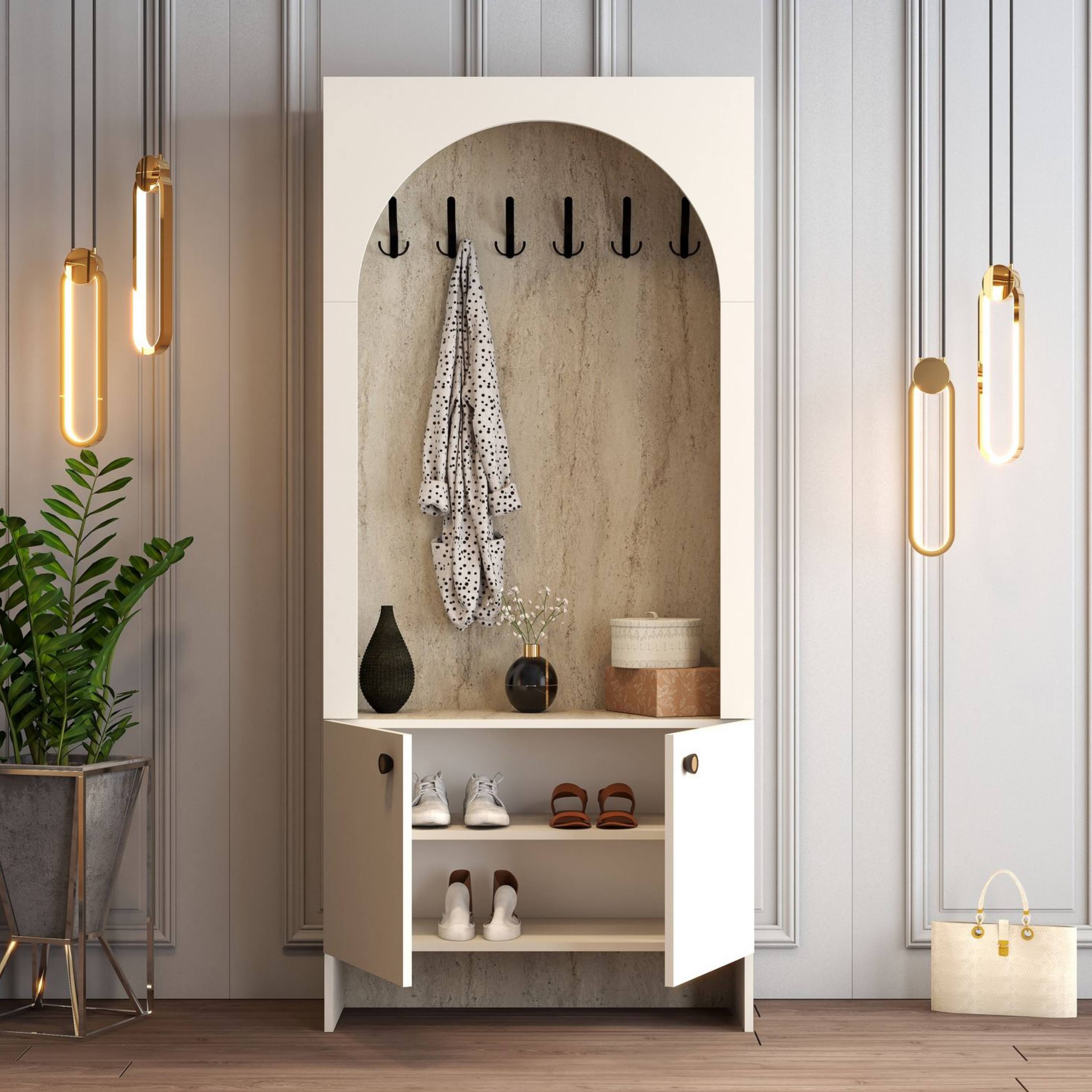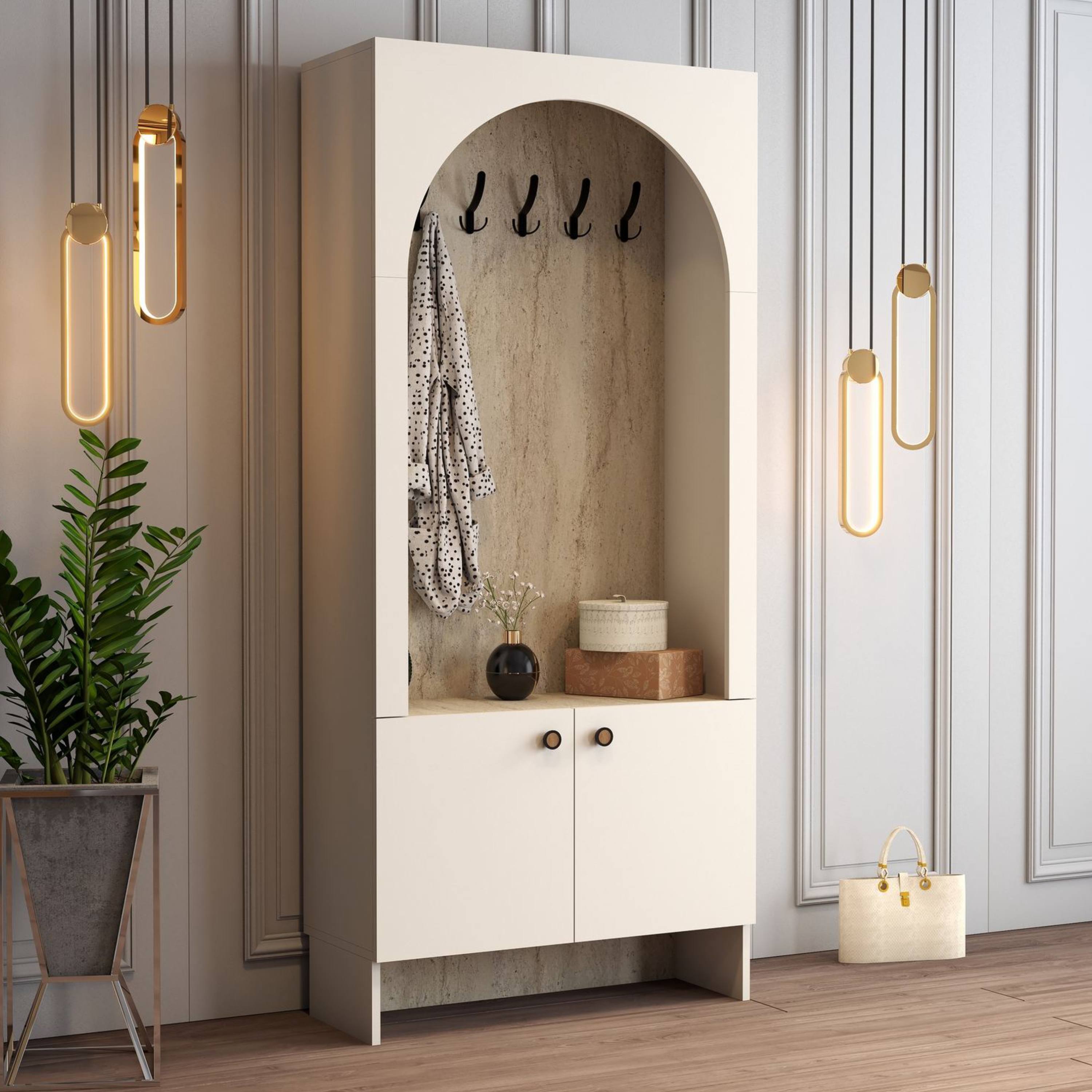 Sestava nabízí otevřený prostor s kontrastním atraktivním dekorem, ve kterém je umístěno 6 dvojitých háčků pro přehledné zavěšení kabátů, bund či doplňků. Nechybí ani odkládací plocha pro drobnosti, které chcete mít vždy po ruce. Ve spodní části se nachází uzavíratelný úložný prostor s otočnými dveřmi a praktickými úchyty. Vnitřní prostor je vybaven vloženou policí, která umožňuje přehledné uspořádání obuvi a dalších předmětů.