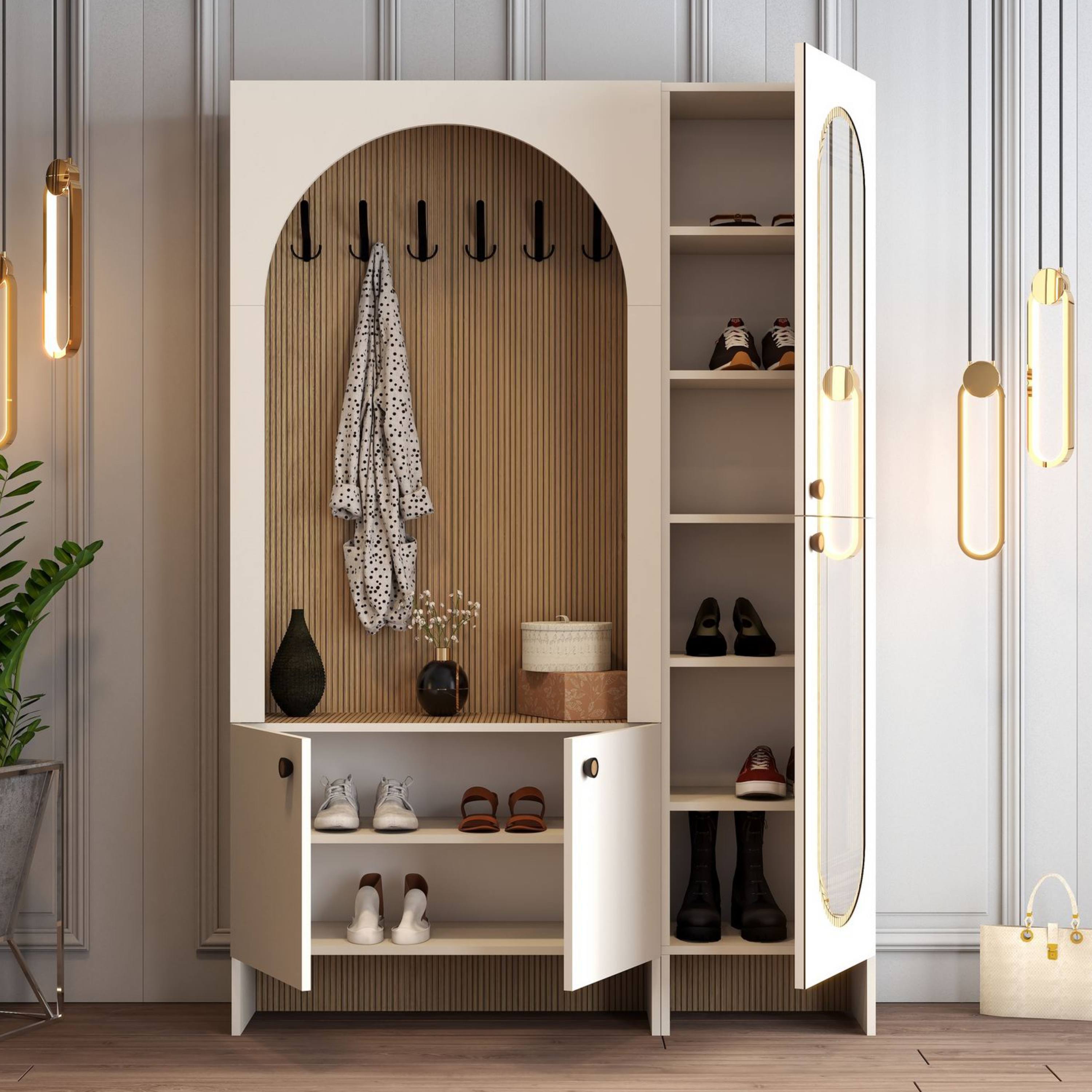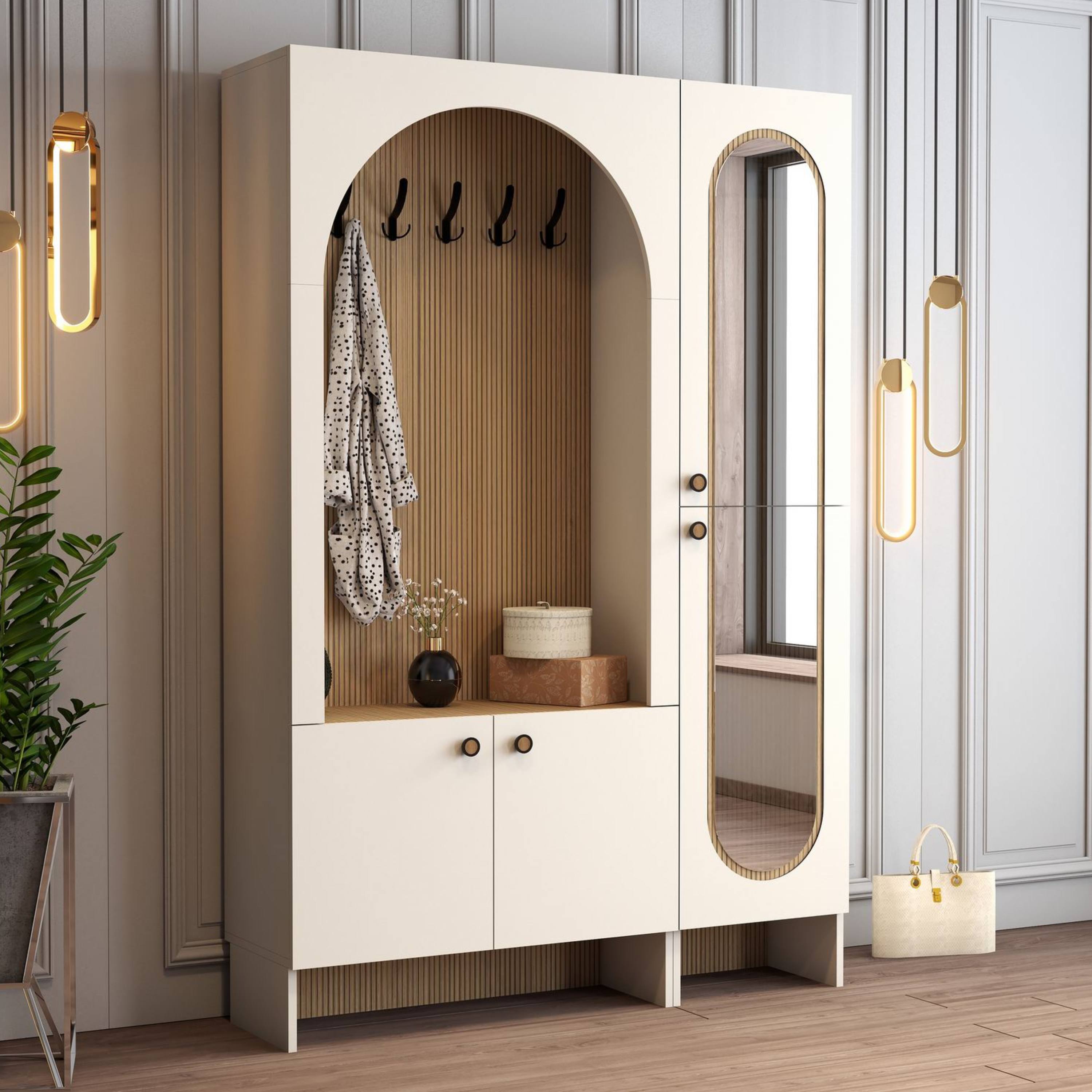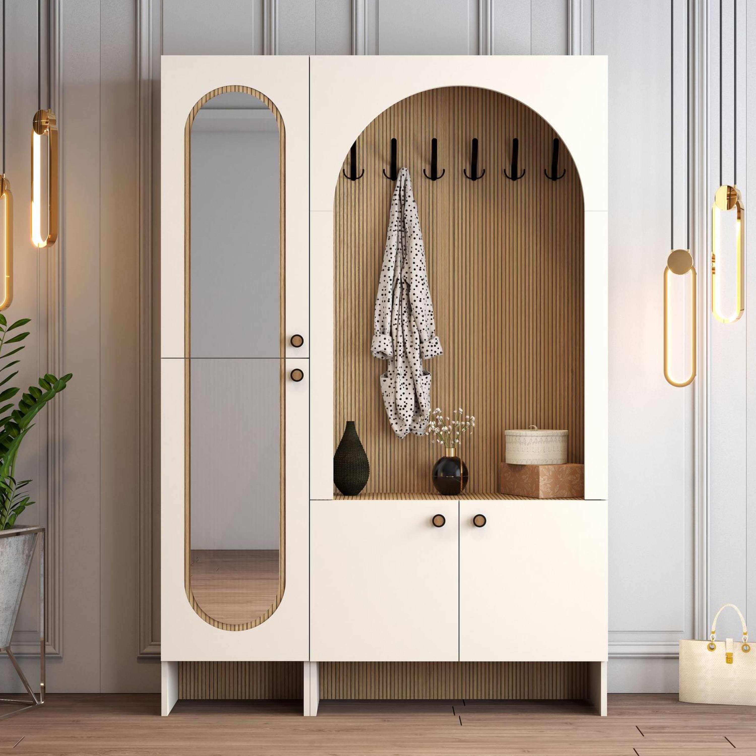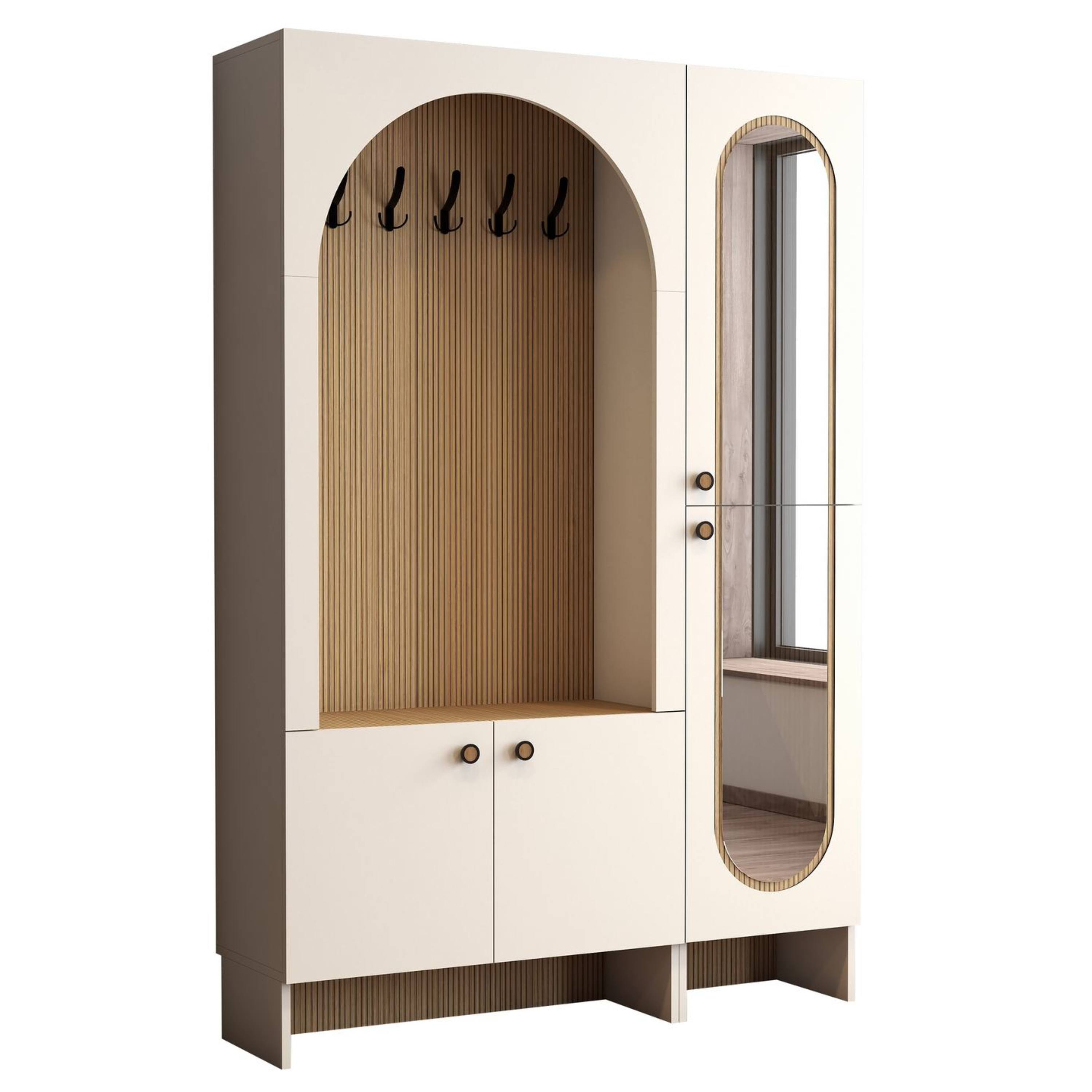 Sestava nabízí otevřený prostor s kontrastním atraktivním dekorem, ve kterém je umístěno 6 dvojitých háčků pro přehledné zavěšení kabátů, bund či doplňků. Nechybí ani odkládací plocha pro drobnosti, které chcete mít vždy po ruce. Ve spodní části se nachází uzavíratelný úložný prostor s otočnými dveřmi a praktickými úchyty. Vnitřní prostor je vybaven vloženou policí, která umožňuje přehledné uspořádání obuvi a dalších předmětů. Uzavíratelná policová část na pravé straně je potom vybavena zrcadlovými otočnými dveřmi.