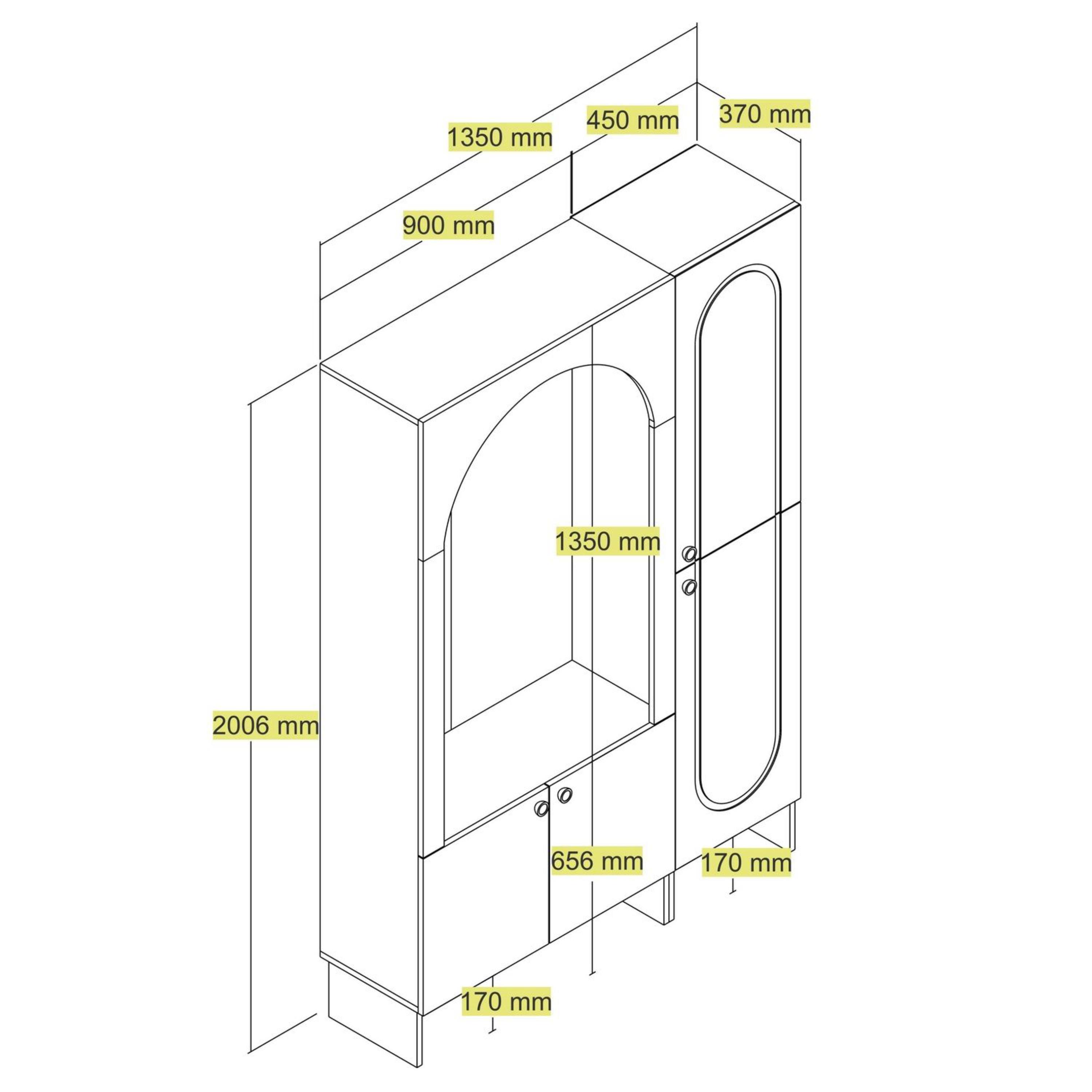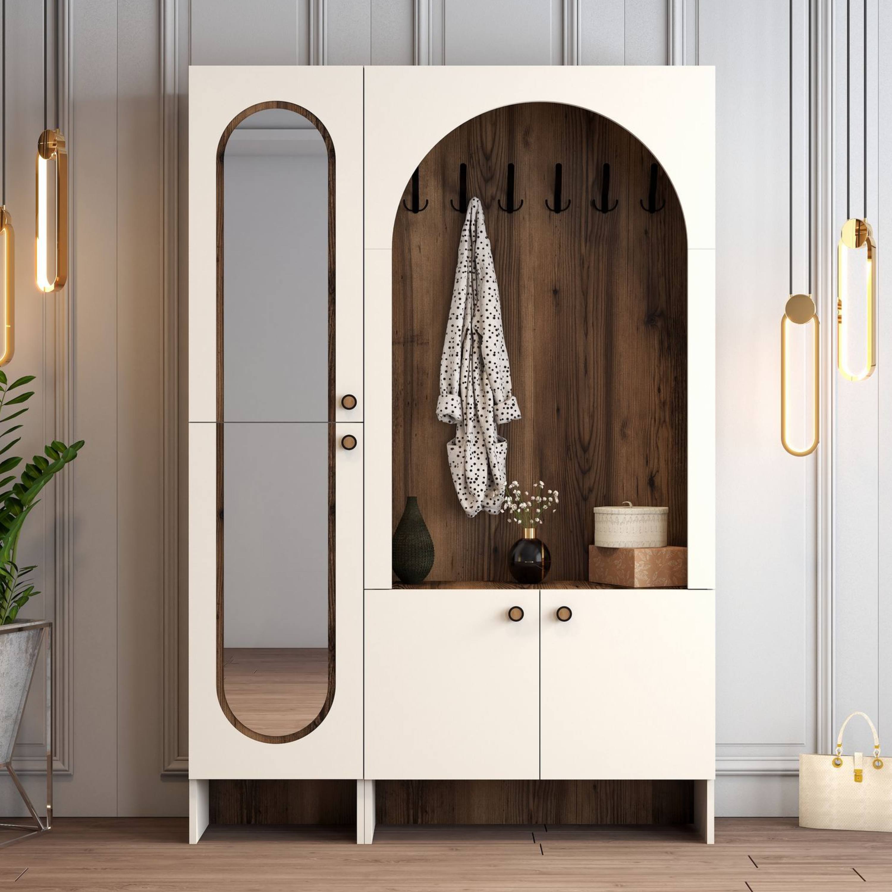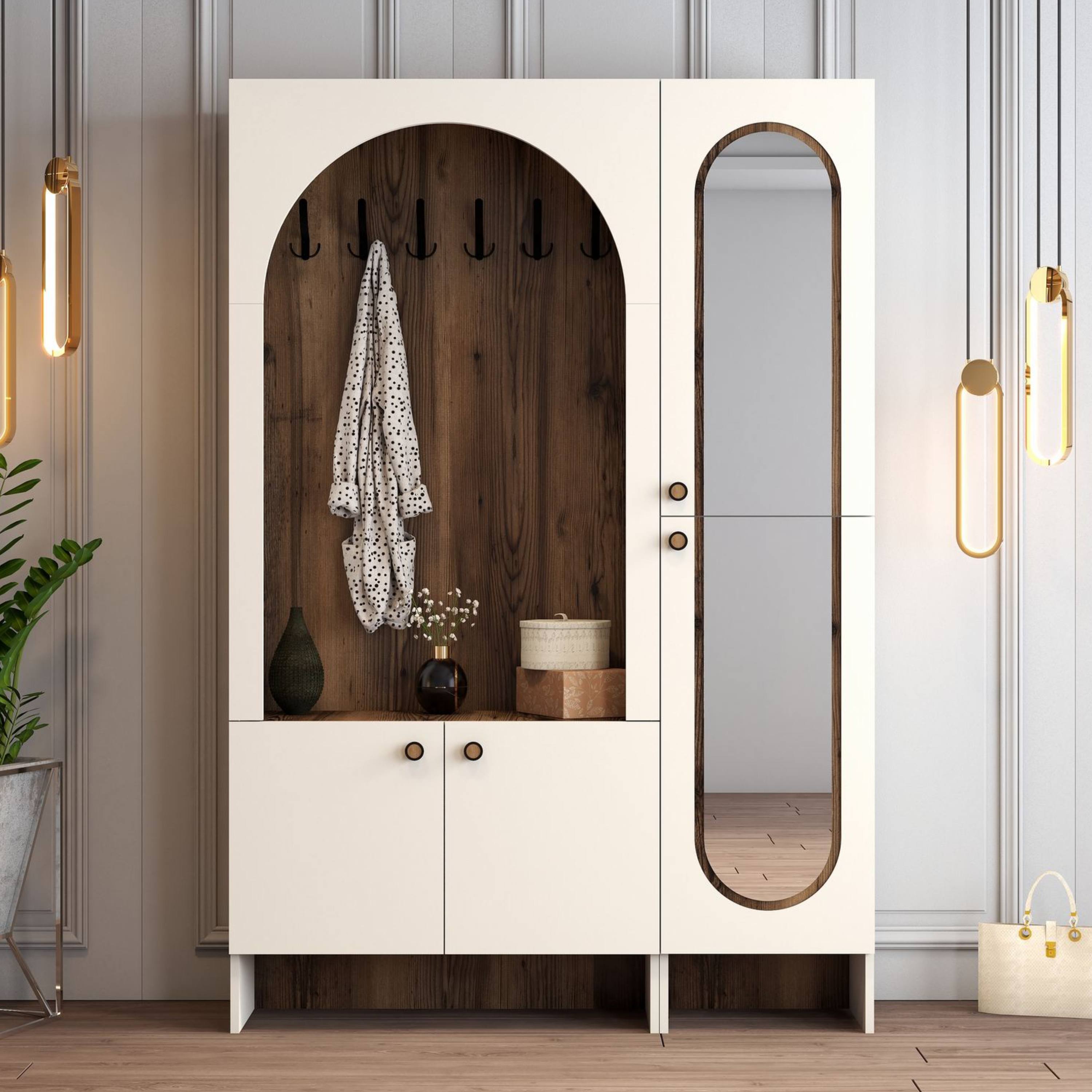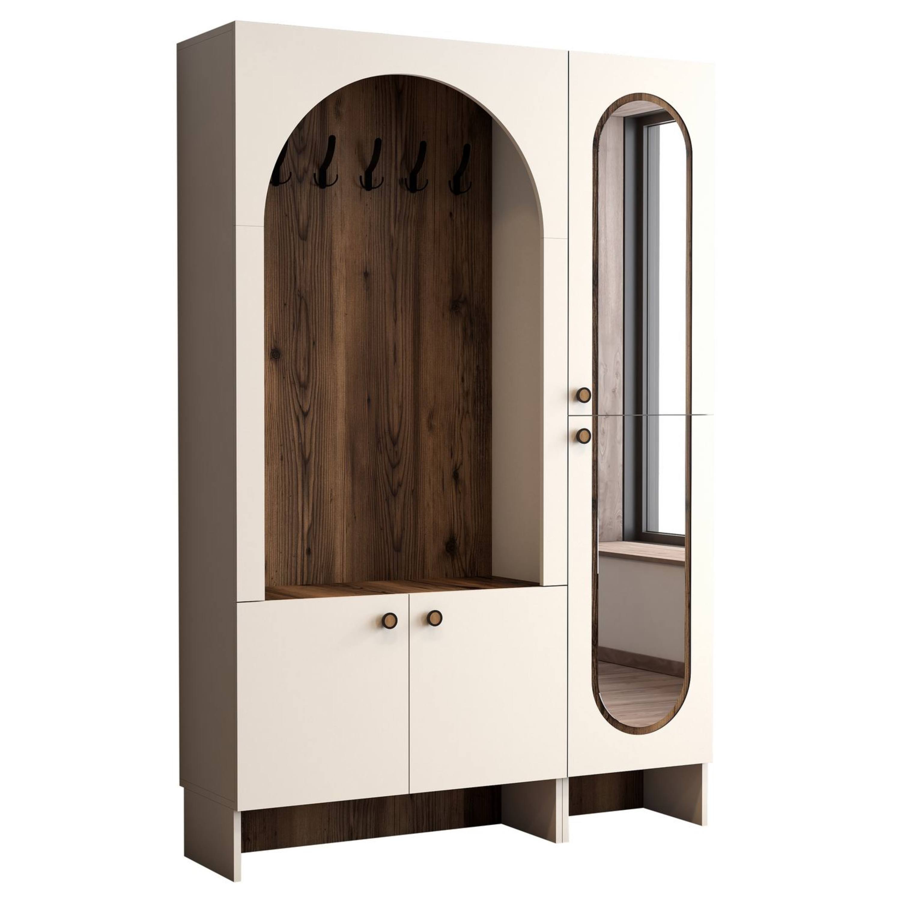 Sestava nabízí otevřený prostor s kontrastním atraktivním dekorem, ve kterém je umístěno 6 dvojitých háčků pro přehledné zavěšení kabátů, bund či doplňků. Nechybí ani odkládací plocha pro drobnosti, které chcete mít vždy po ruce. Ve spodní části se nachází uzavíratelný úložný prostor s otočnými dveřmi a praktickými úchyty. Vnitřní prostor je vybaven vloženou policí, která umožňuje přehledné uspořádání obuvi a dalších předmětů. Uzavíratelná policová část na pravé straně je potom vybavena zrcadlovými otočnými dveřmi.