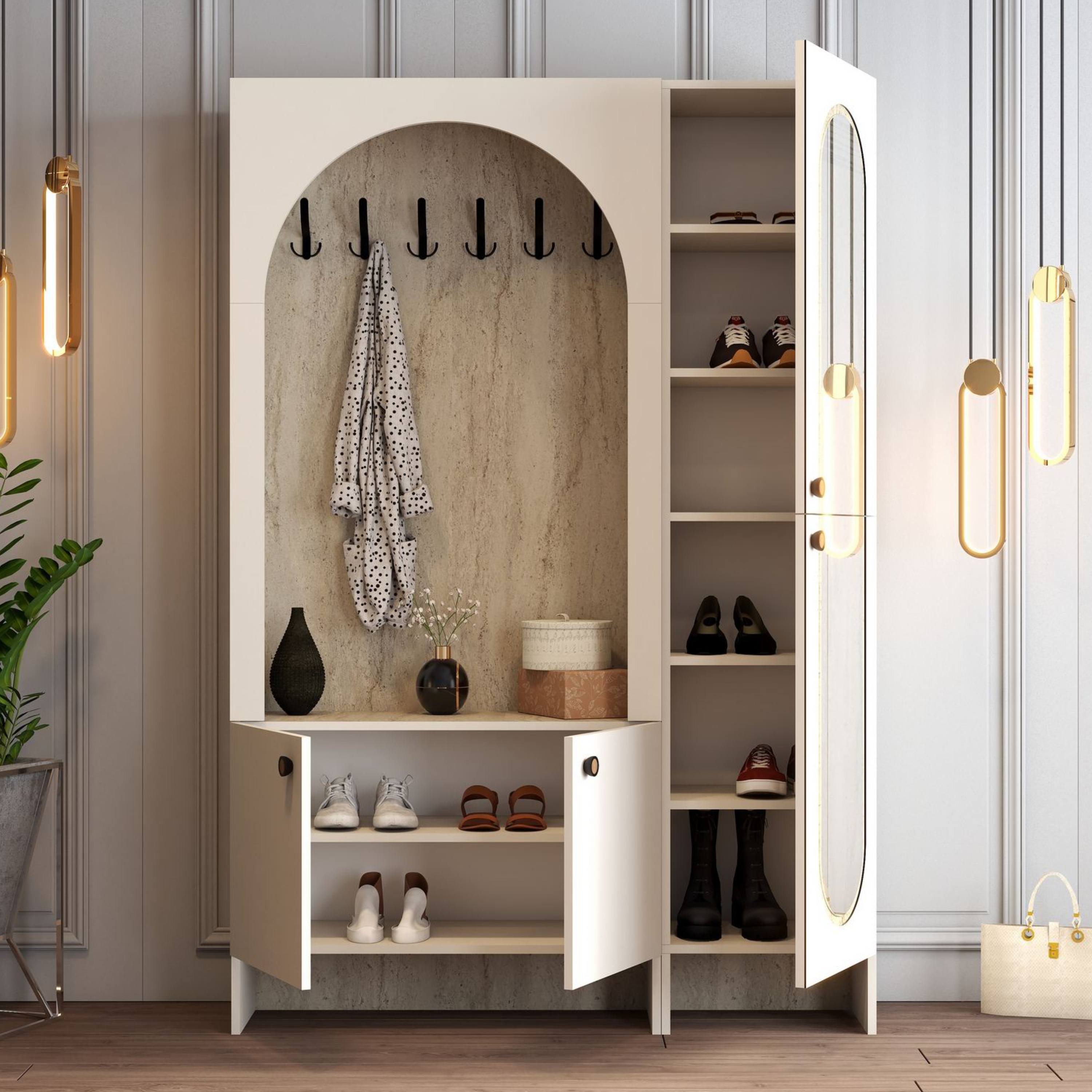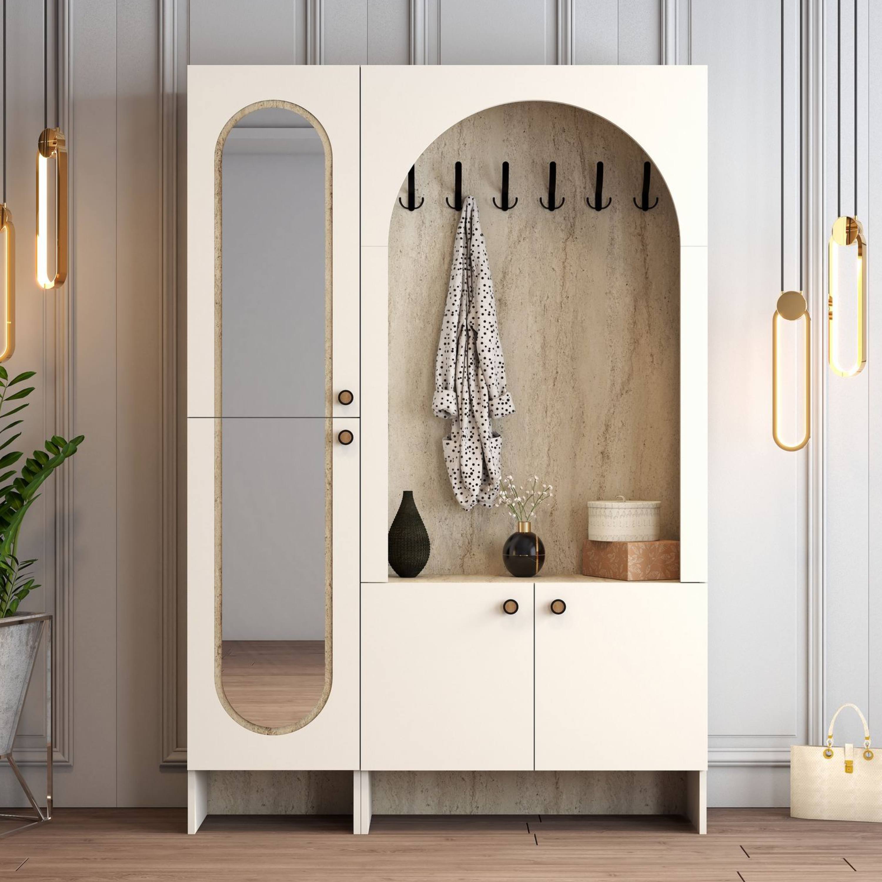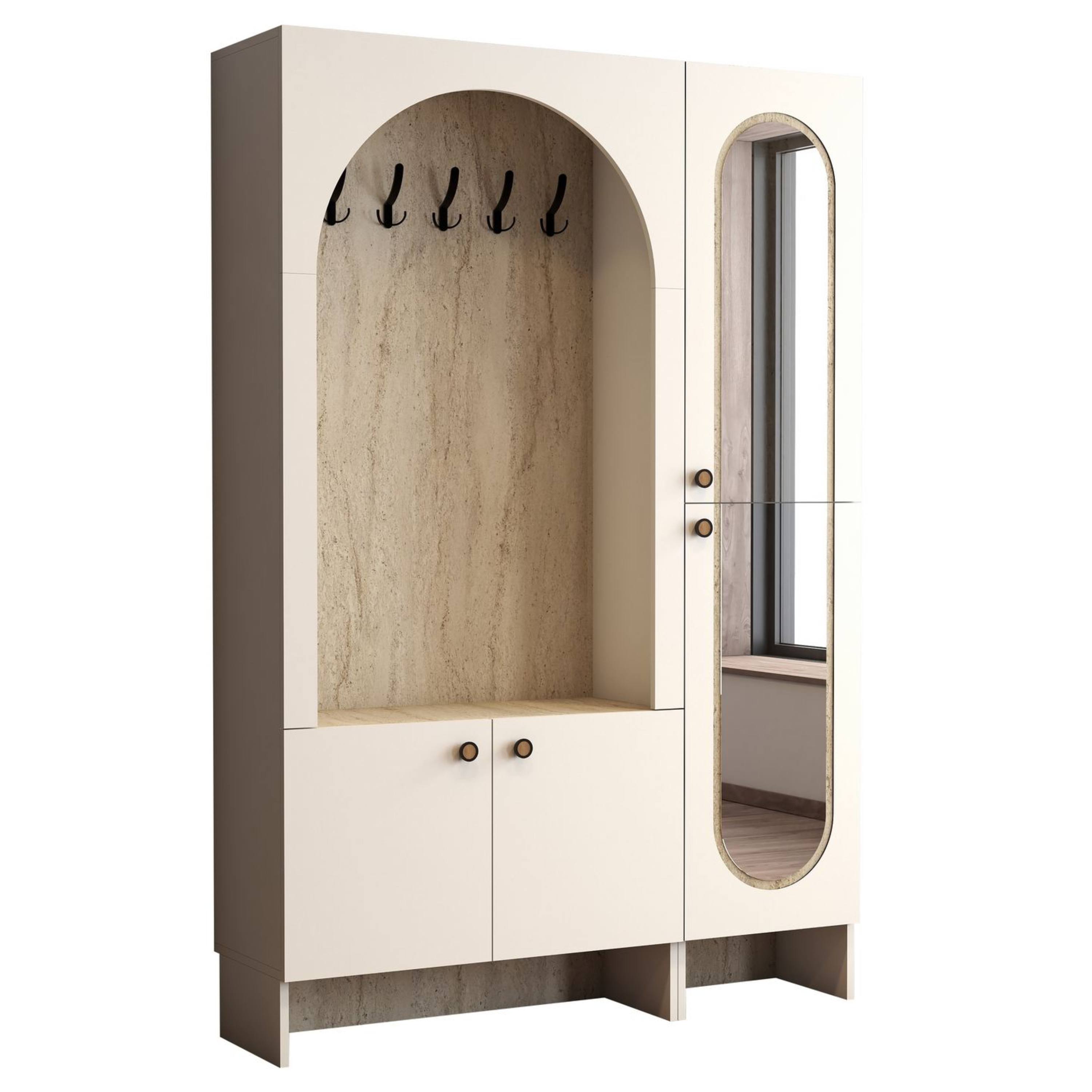 Sestava nabízí otevřený prostor s kontrastním atraktivním dekorem, ve kterém je umístěno 6 dvojitých háčků pro přehledné zavěšení kabátů, bund či doplňků. Nechybí ani odkládací plocha pro drobnosti, které chcete mít vždy po ruce. Ve spodní části se nachází uzavíratelný úložný prostor s otočnými dveřmi a praktickými úchyty. Vnitřní prostor je vybaven vloženou policí, která umožňuje přehledné uspořádání obuvi a dalších předmětů. Uzavíratelná policová část na pravé straně je potom vybavena zrcadlovými otočnými dveřmi.