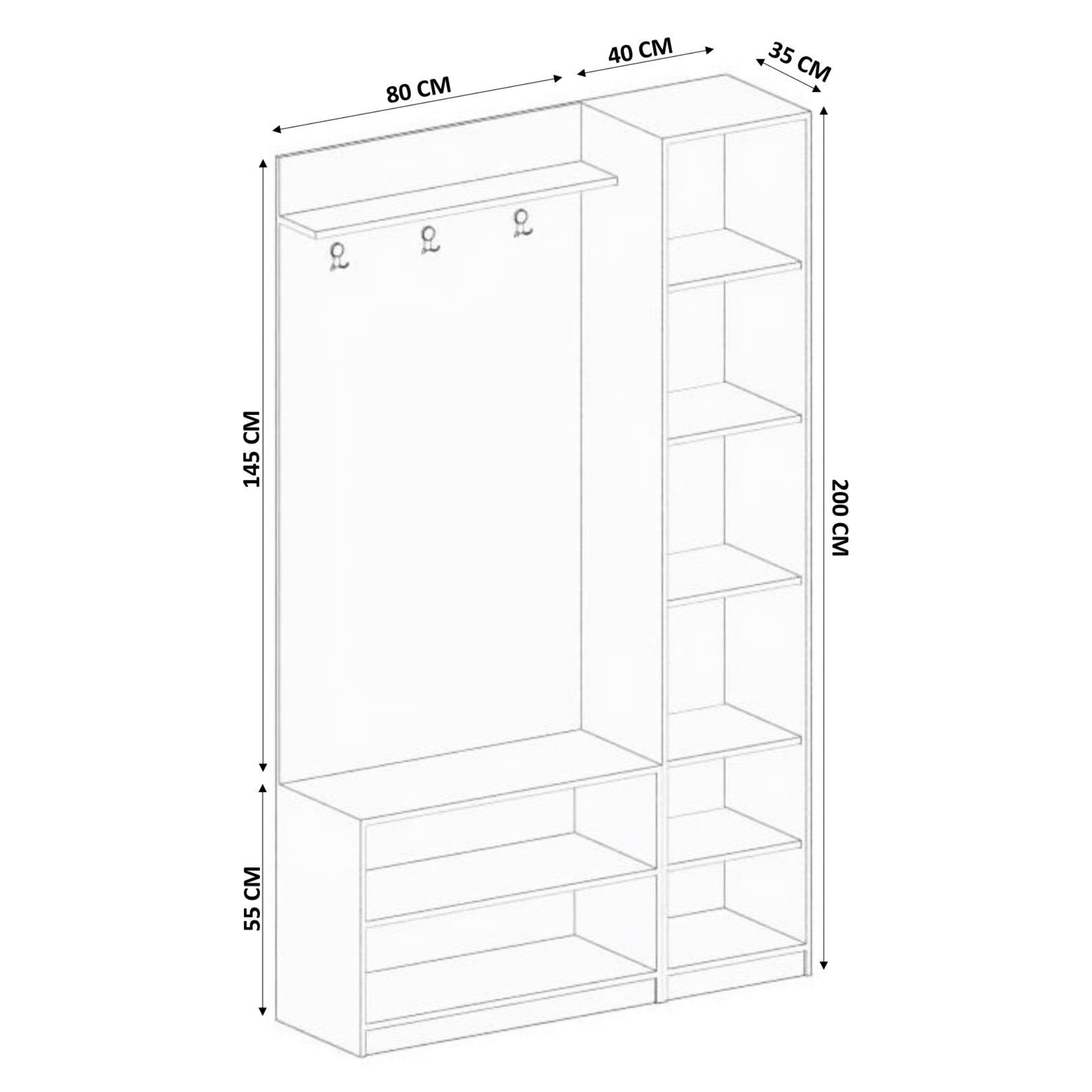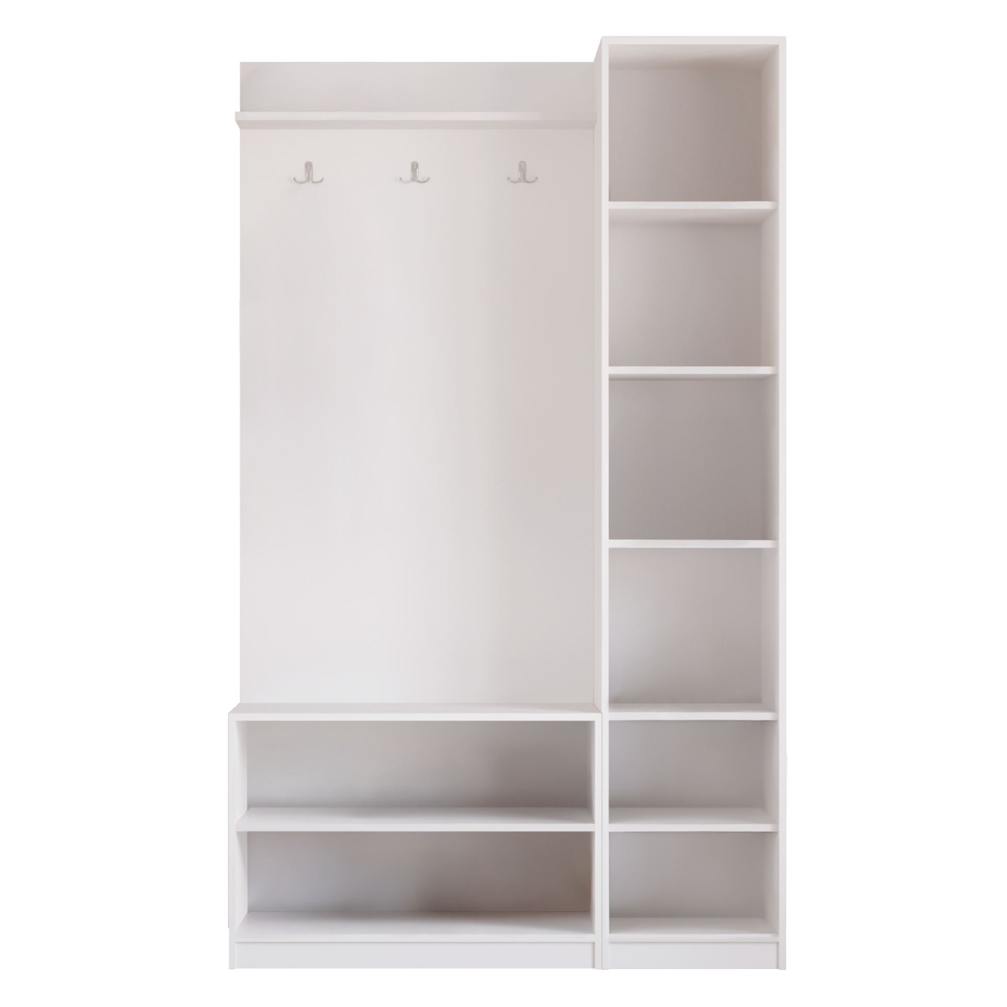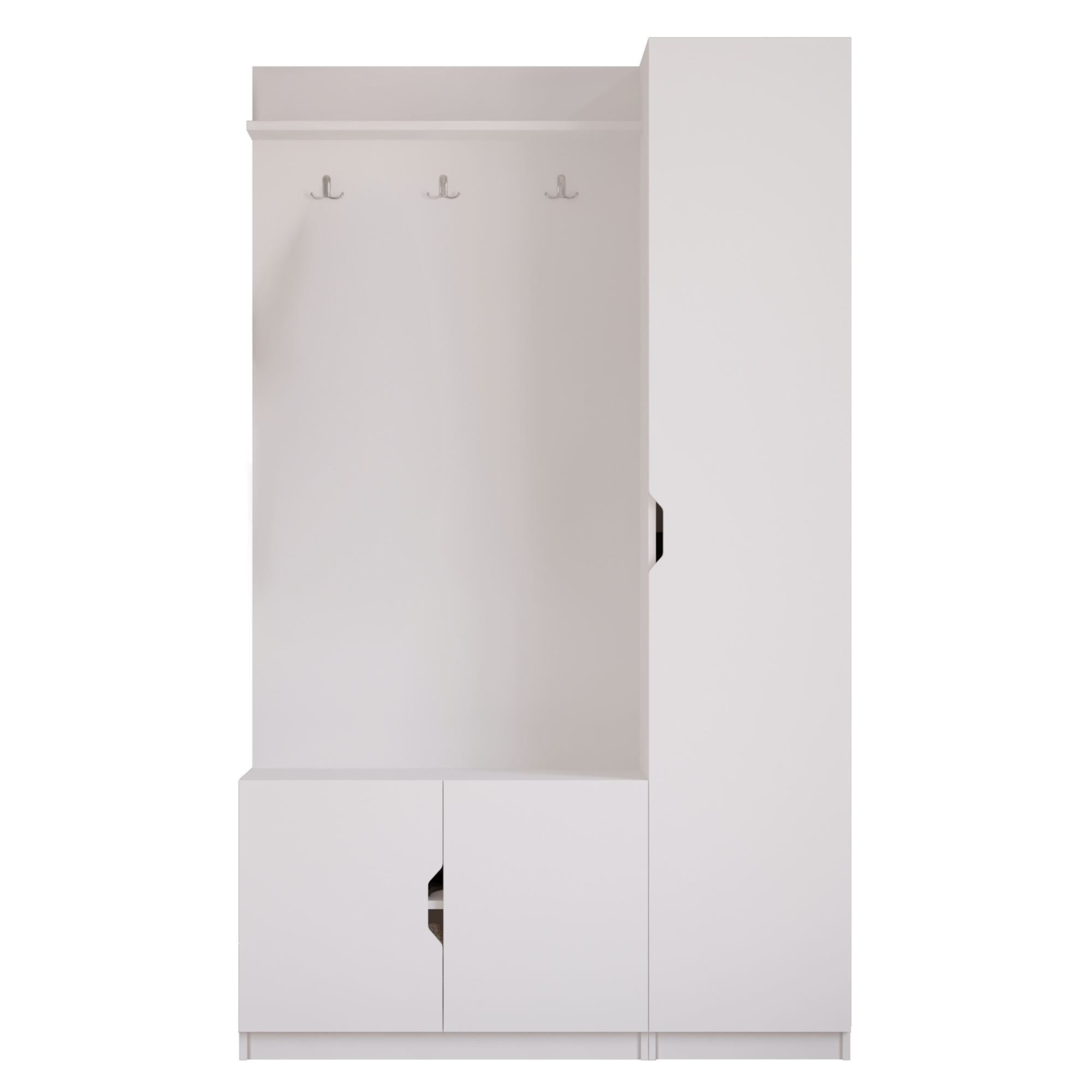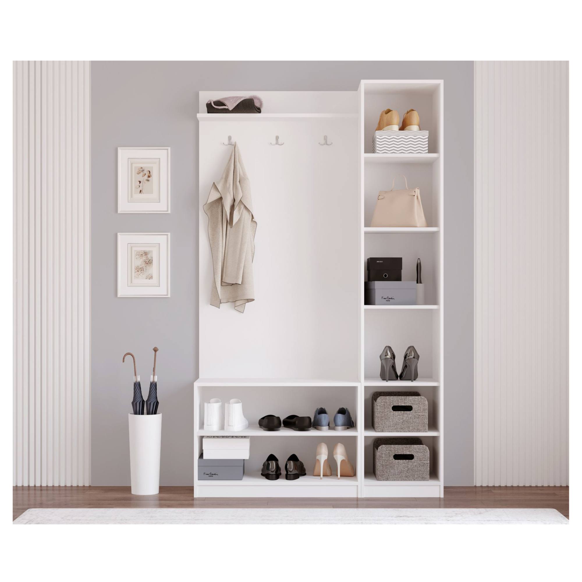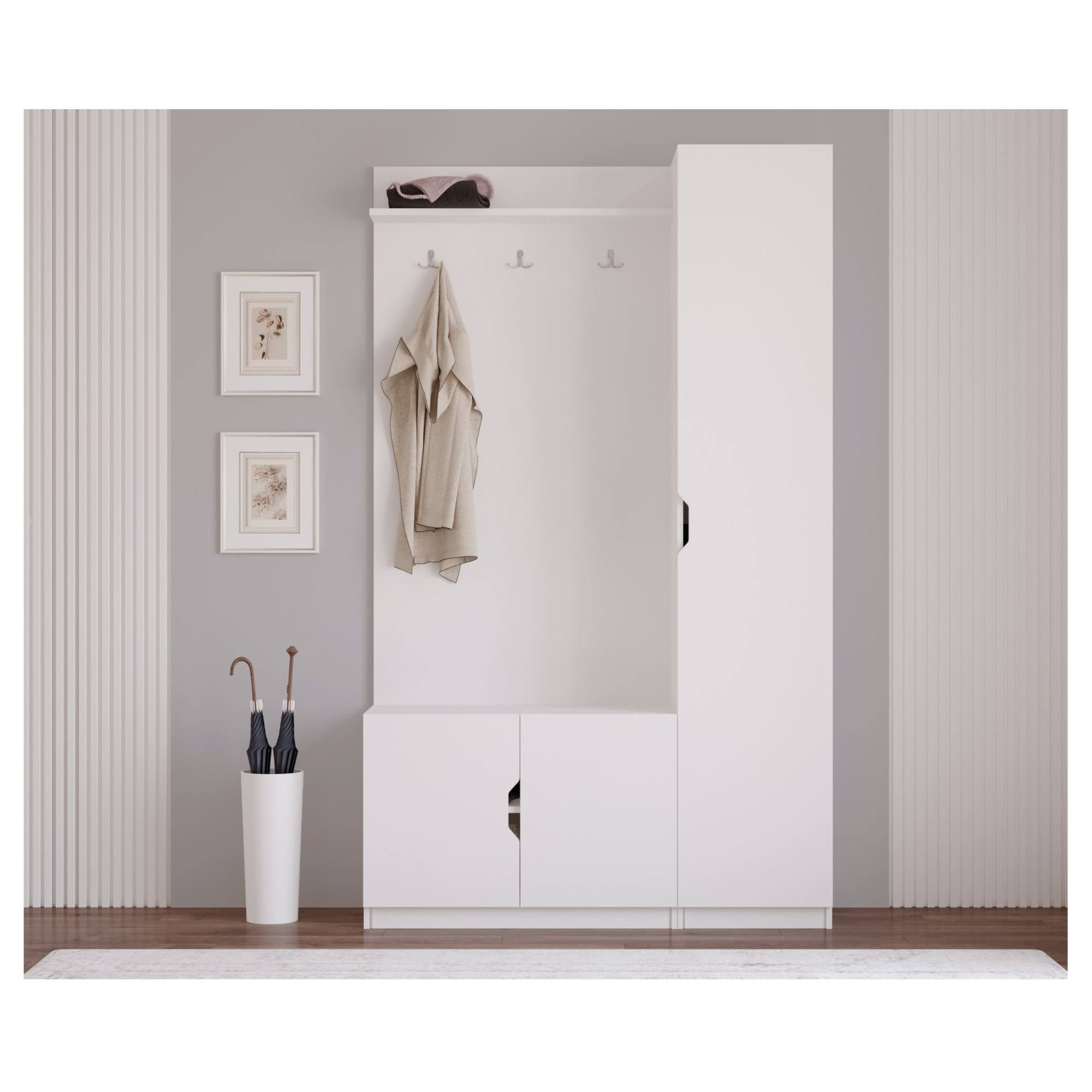 Její součástí je nejen 7 vložených polic, z nichž 6 je umístěno za dvířky, ale i **3 dvojité háčky. Na ty si můžete pověsit kabáty, bundy i módní doplňky.