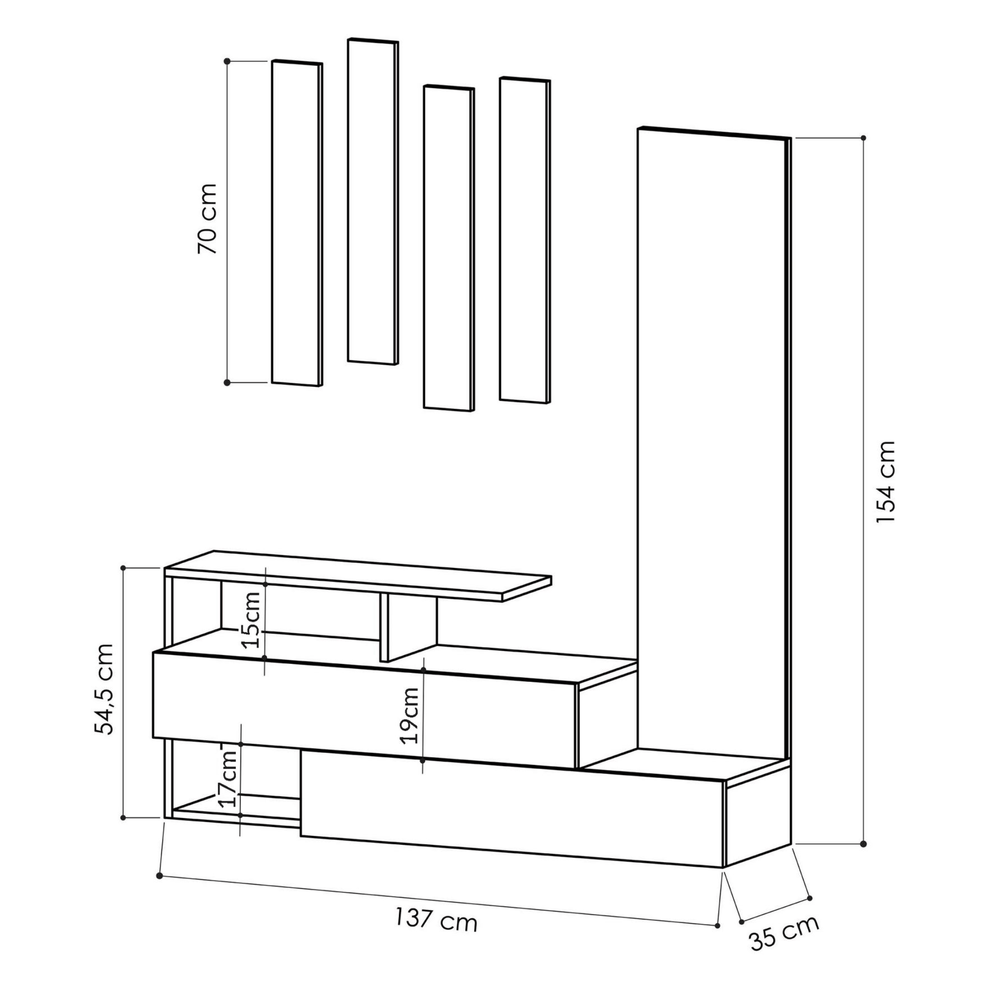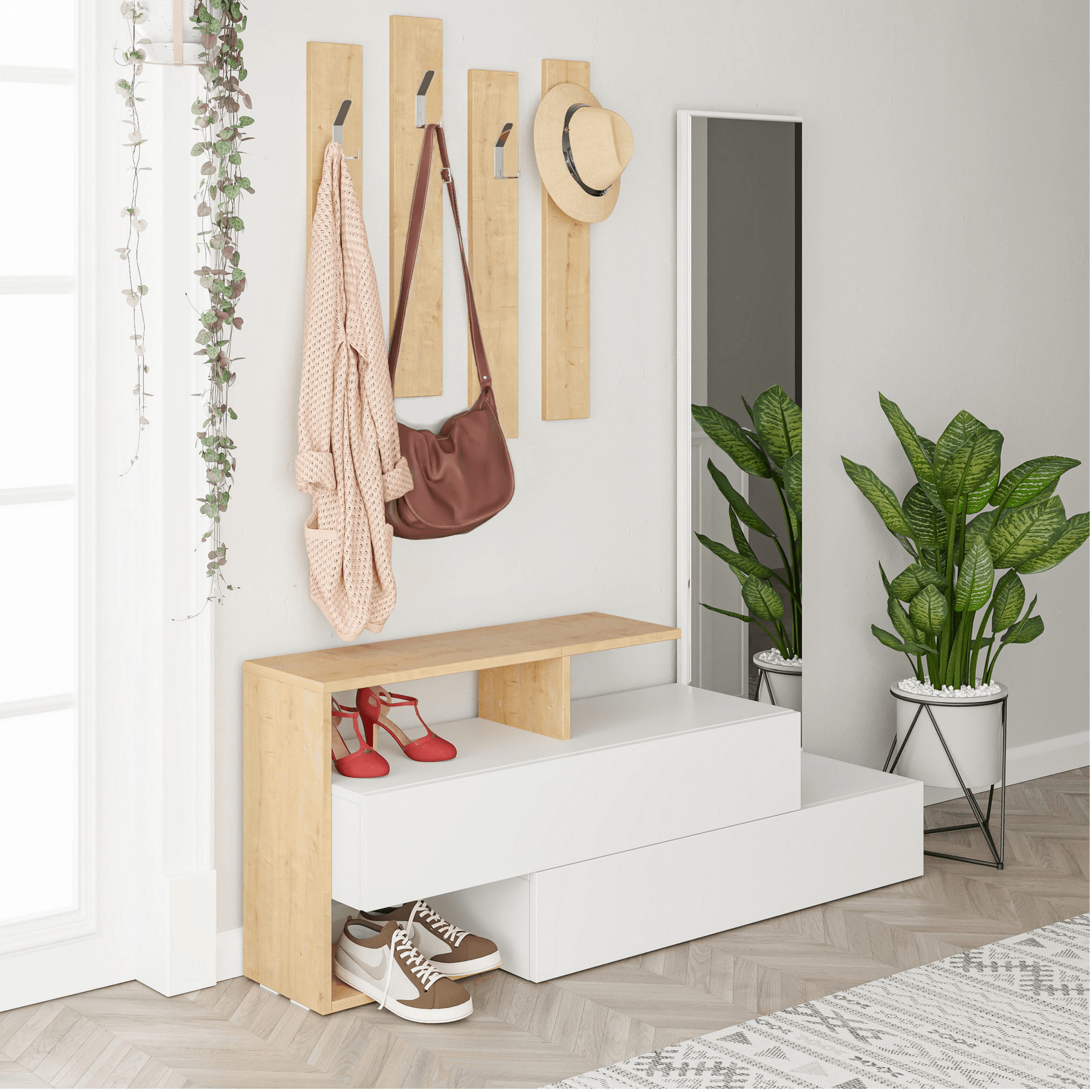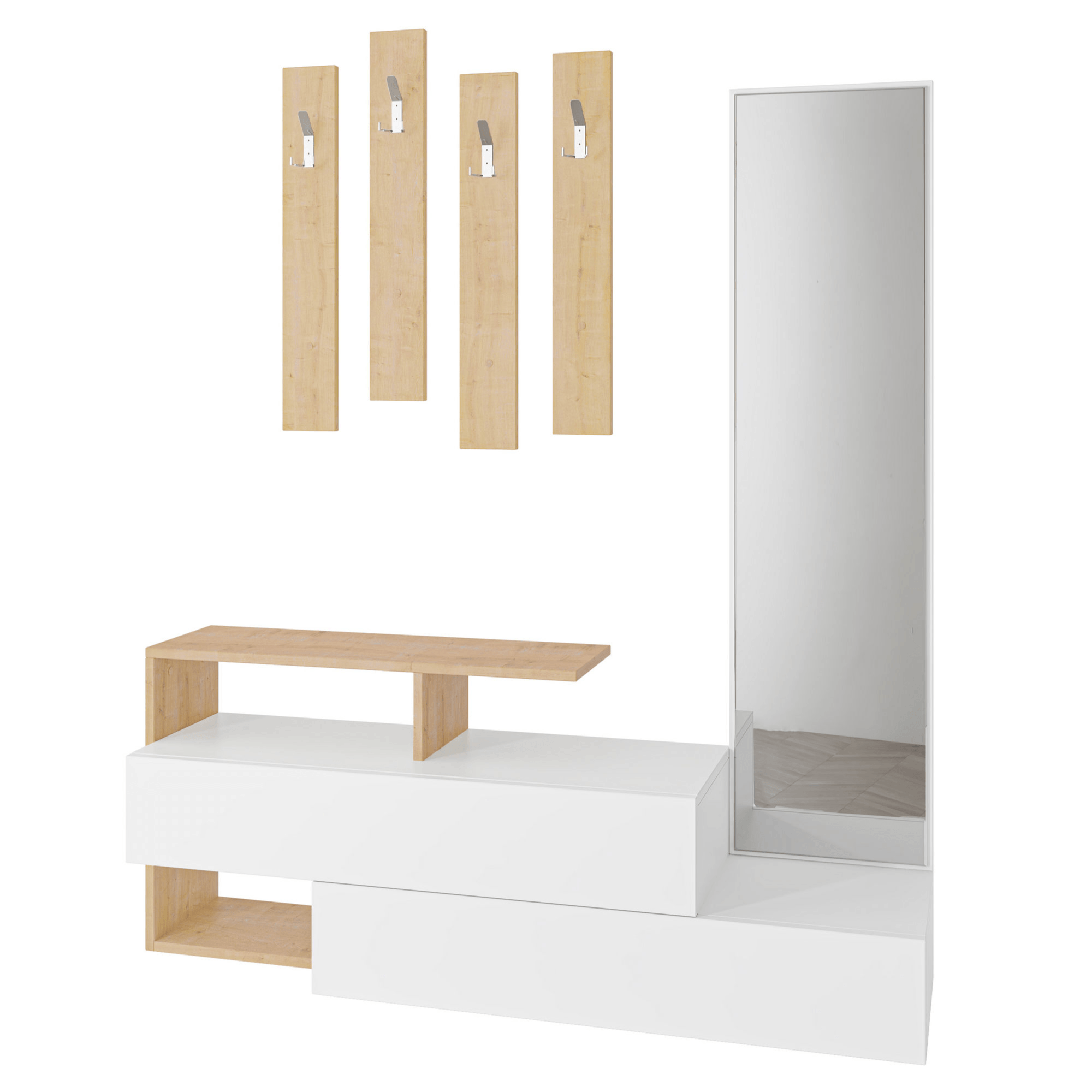 Sestava se skládá ze čtyřčlenného věšákového panelu, botníkové skříňky a zrcadla. Společným jmenovatelem je zhotovení z laminovaného dřevěného materiálu, který se vyznačuje snadnou udržovatelností i dlouhou životností. Dostatečný odkládací prostor na boty a doplňky pak zajišťuje botníková skříňka kombinující otevřený prostor s uzavřeným. Zrcadlo pak vypomůže opticky zvětšit prostor a stane se upřímným odrazem vzhledu a outfitu.