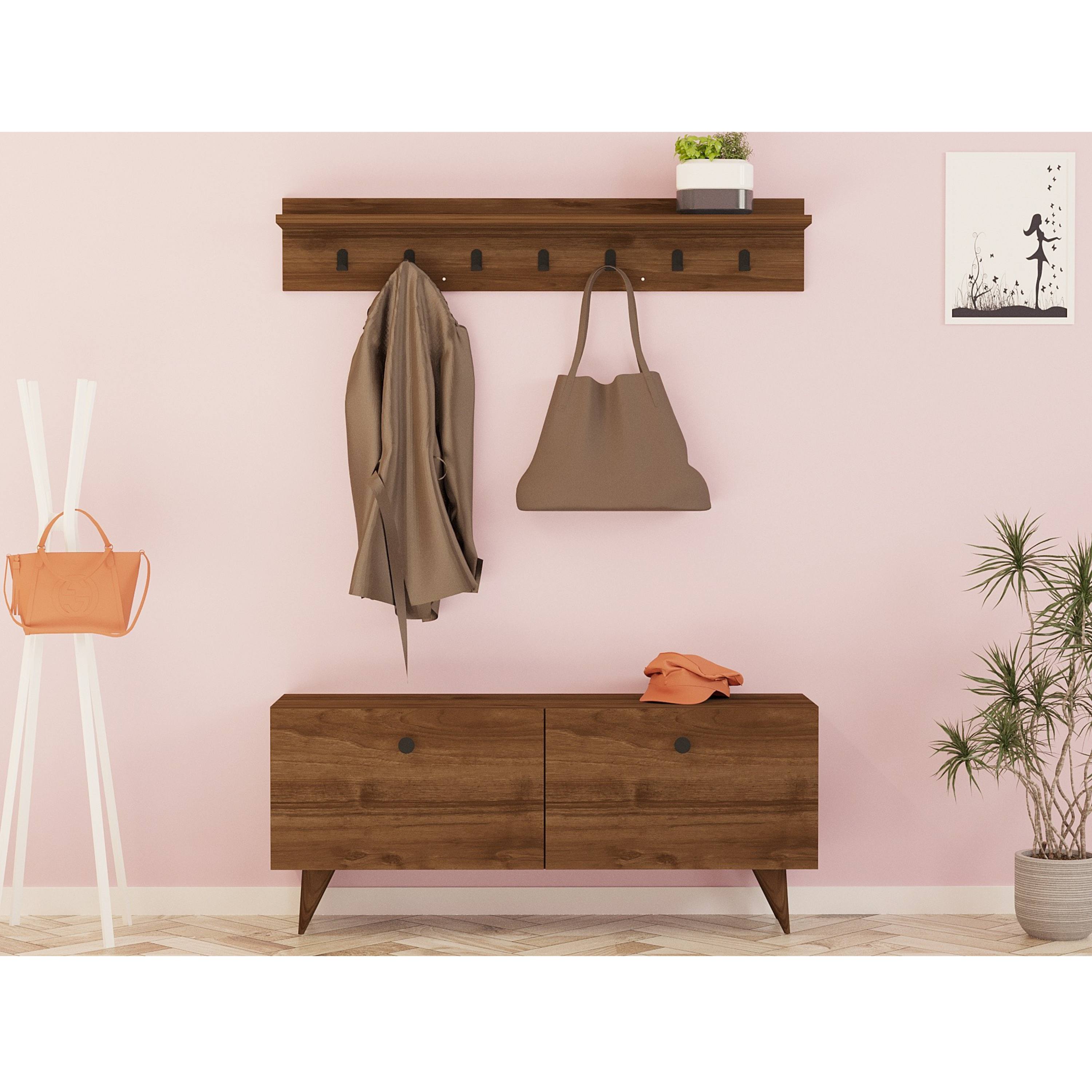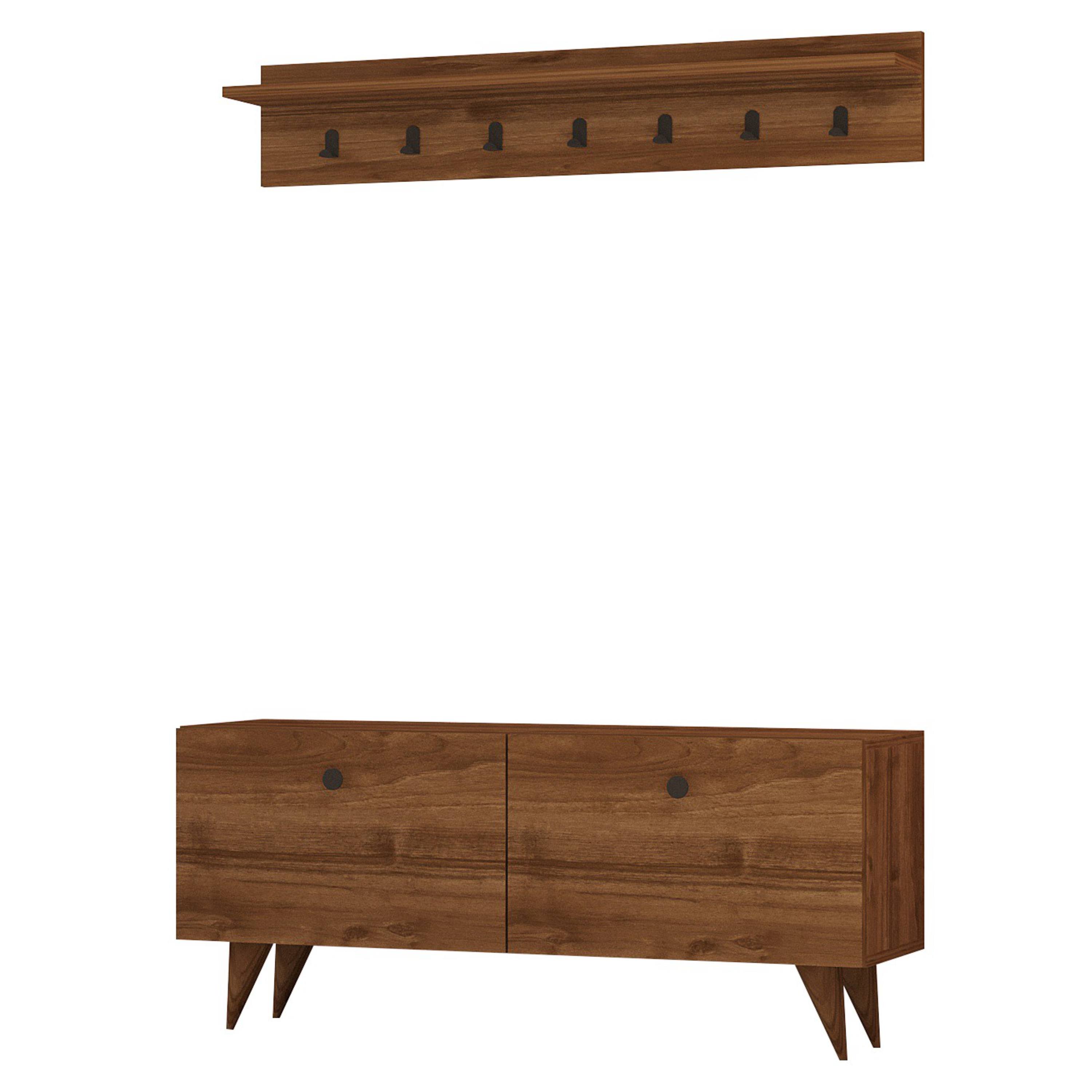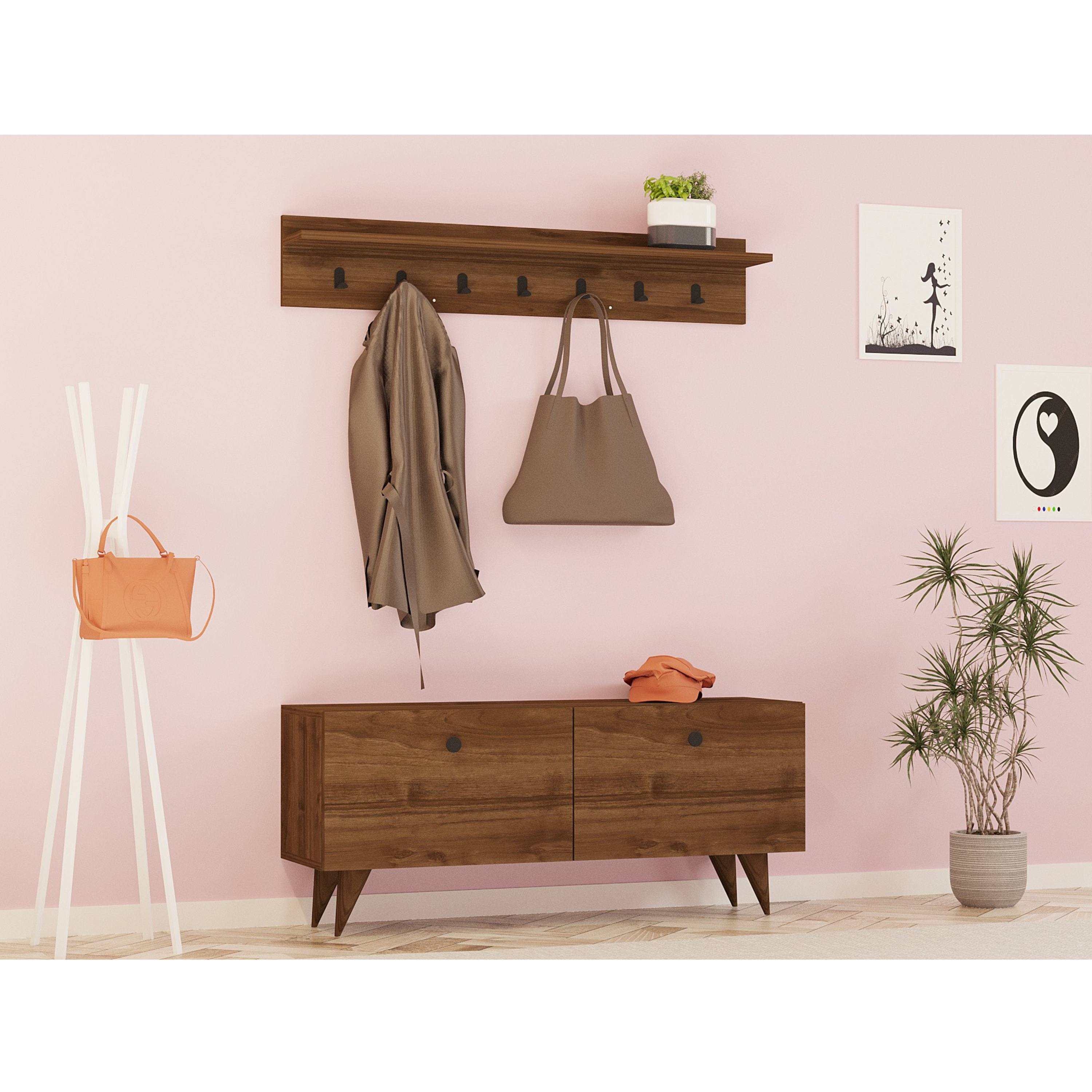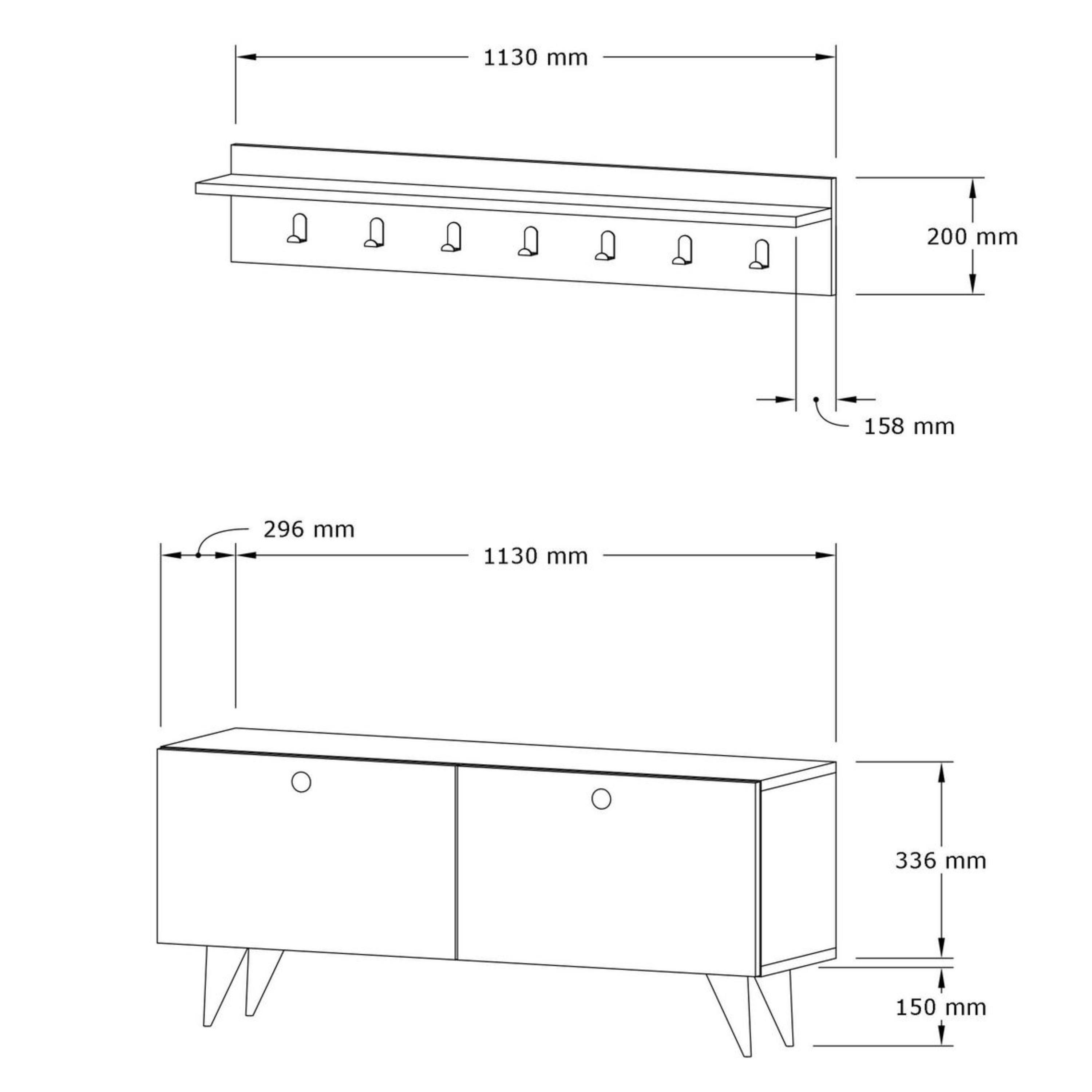 Věšák se 7 odkládacími háčky poskytuje dostatek místa pro zavěšení kabátů, bund i doplňků, zatímco horní police poslouží pro odložení doplňků či vystavení dekorací. Botník s výklopnými dveřmi nabízí krytý úložný prostor pro skladování obuvi, takže předsíň zůstává uklizená a přehledná. Sestava je vyrobena z laminovaného dřevěného materiálu s povrchem nenáročným na údržbu, který se snadno čistí a je vhodný pro každodenní používání.