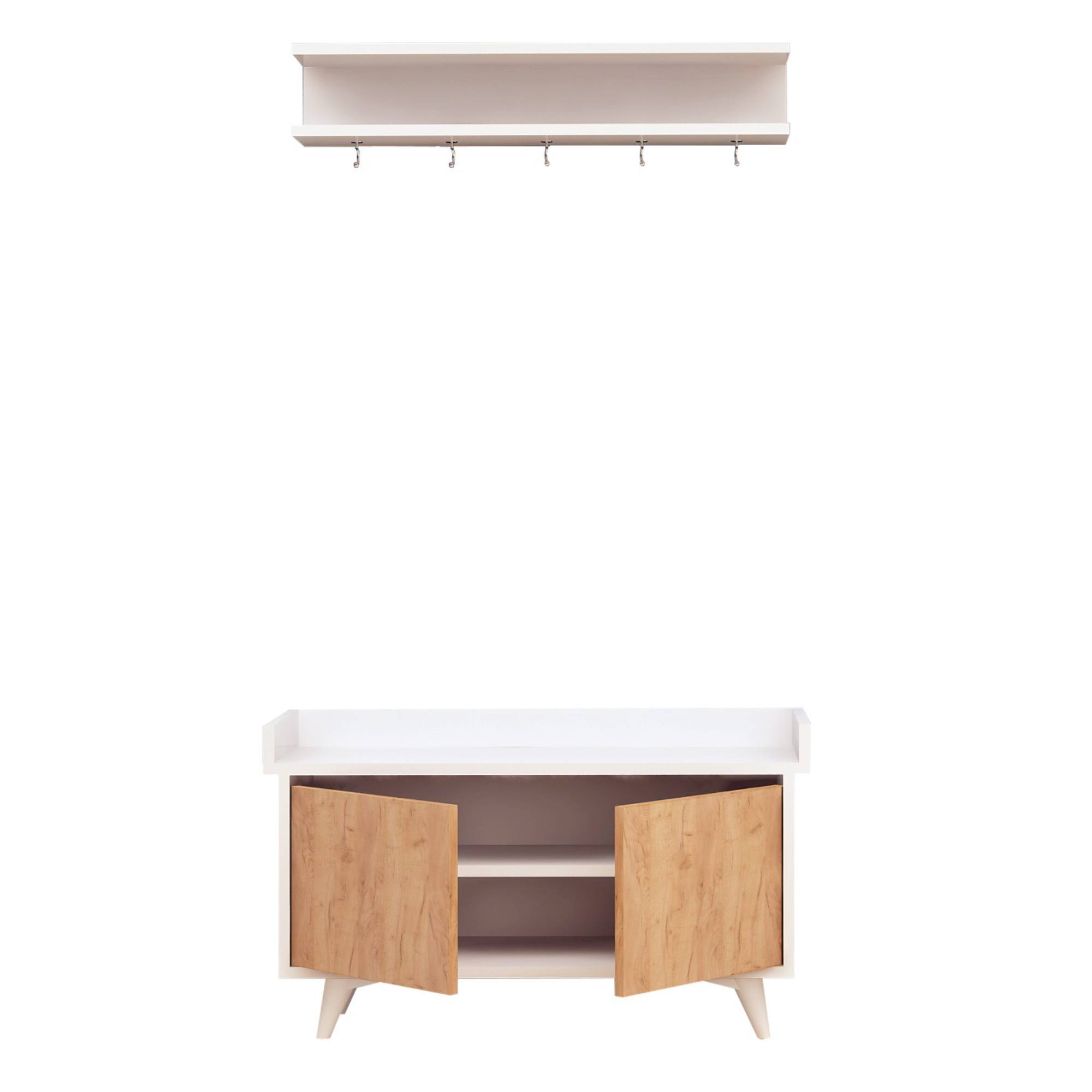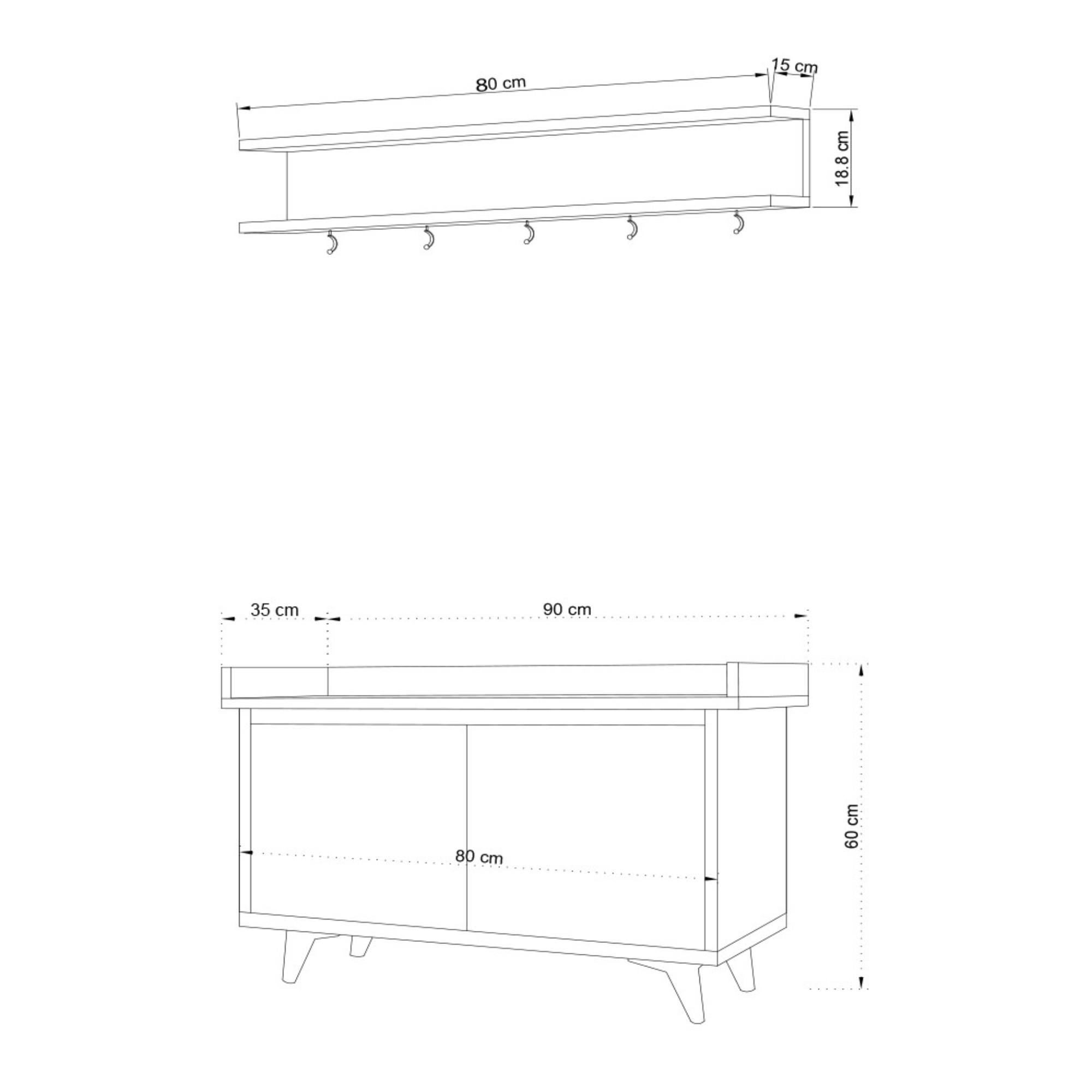 - Sestava složena z botníku a nástěnné police s 5 háčky