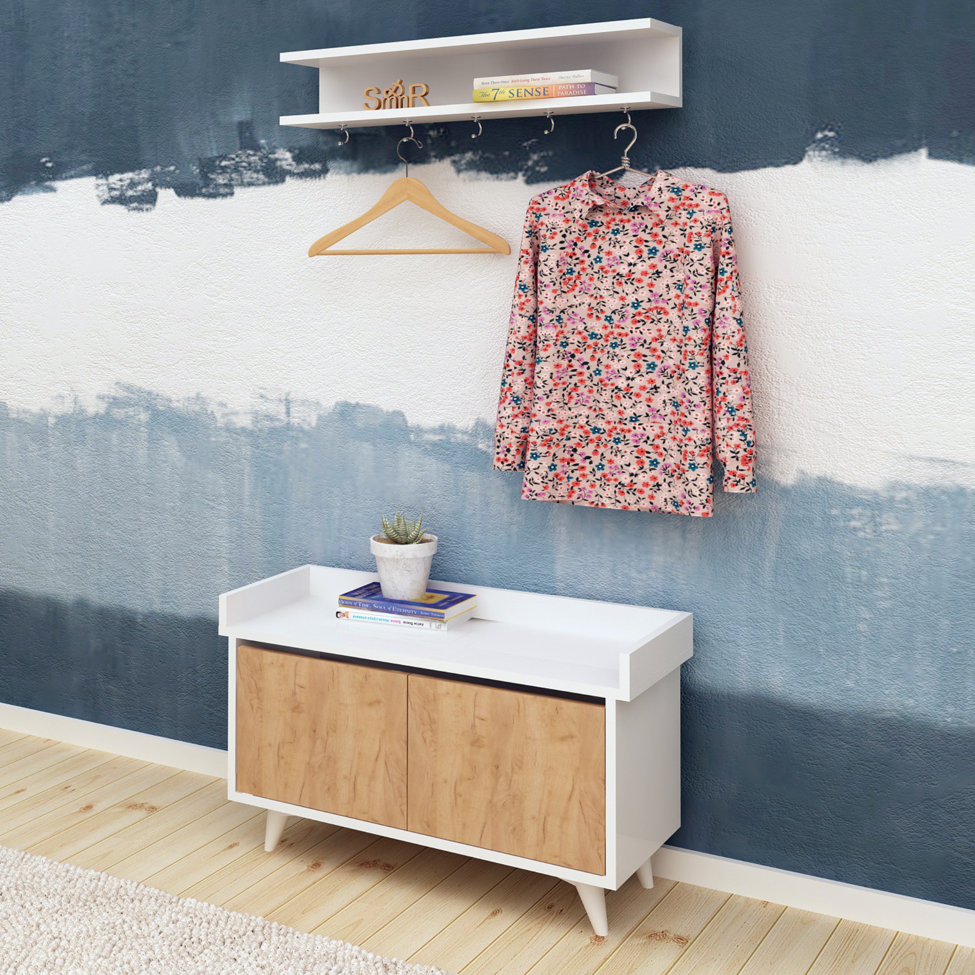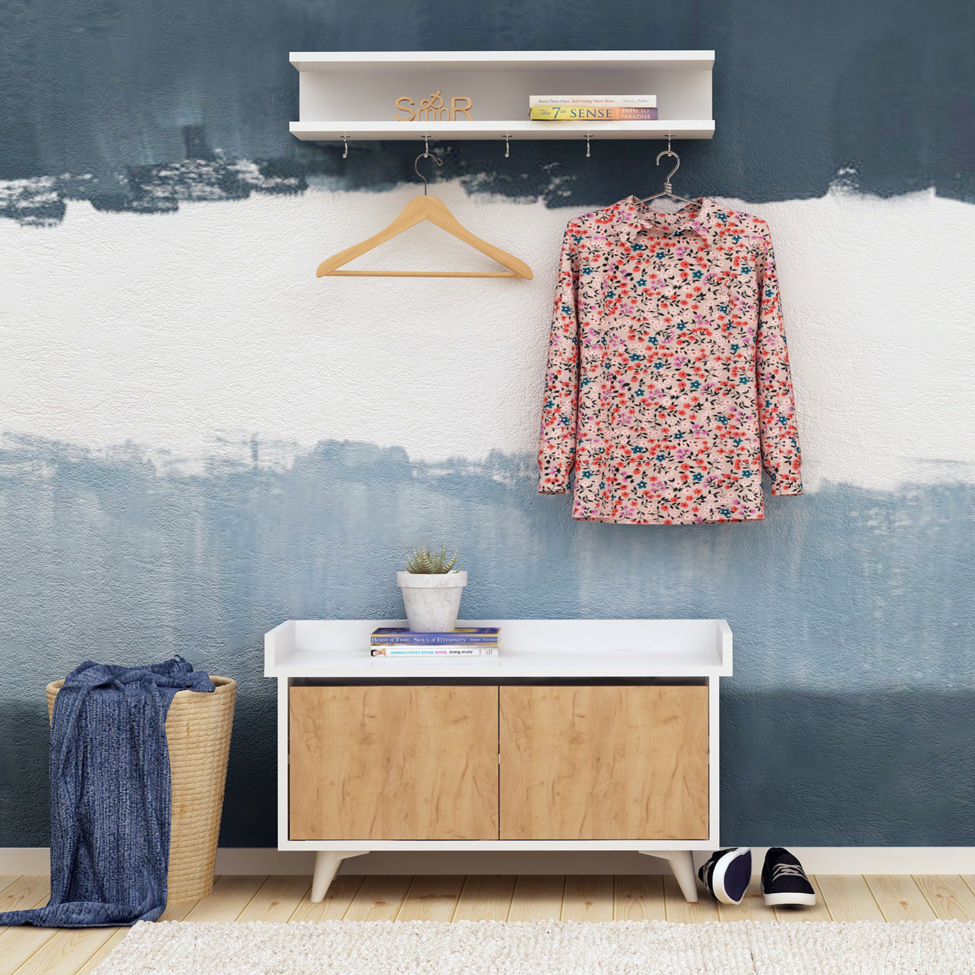 Botník stojí na vysokých nohách, které usnadňují úklid pod ním. Za jeho stylovými bezúchytovými dvířky se nachází 1 vložená police. Nástěnná police je vybavena 5 háčky, na které si můžete pověsit kabáty, bundy i různé módní doplňky.