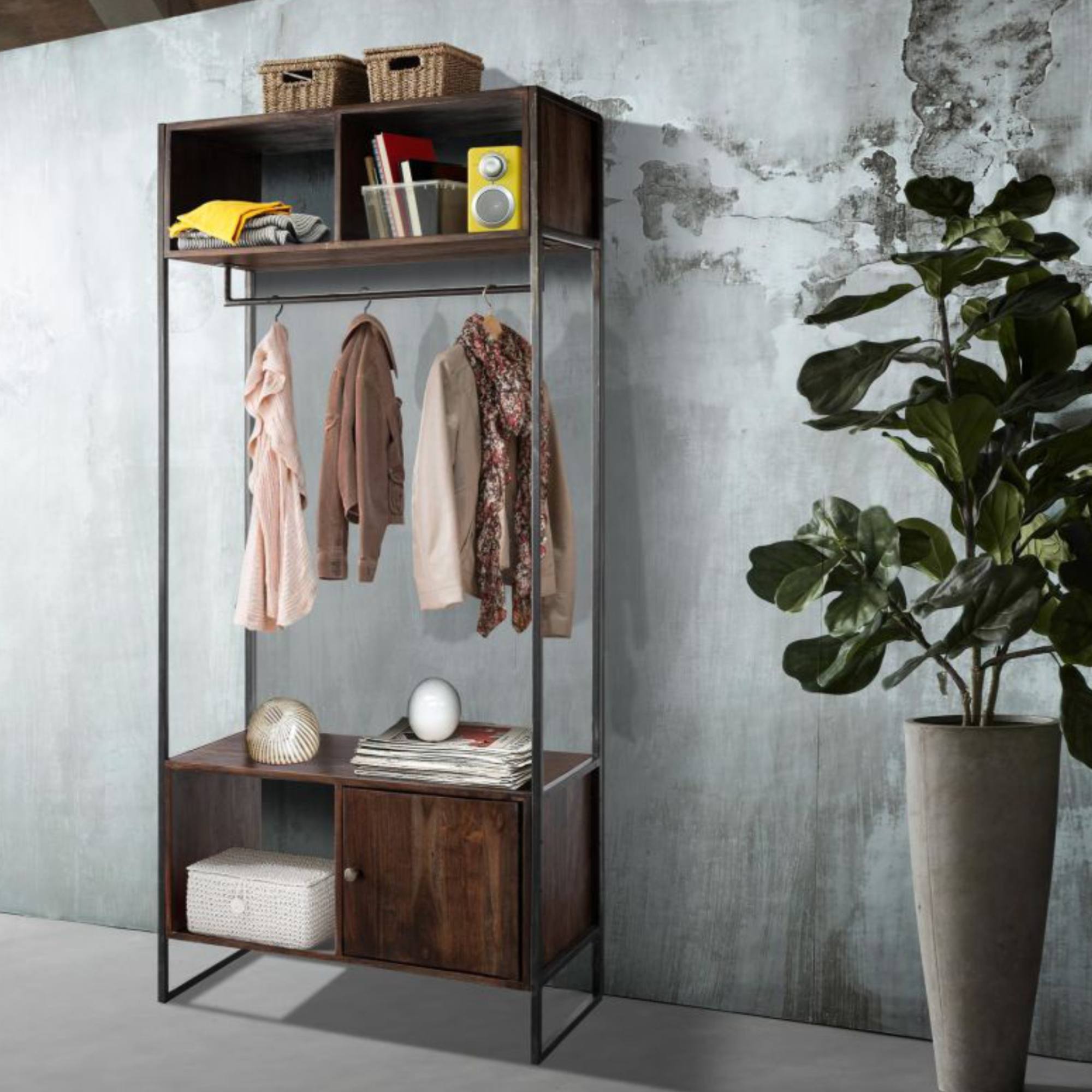 Přemýšlíte kam umístit všechny ty boty, kabáty a bundy a jak vrátit předsíni její reprezentativní vzhled? Řešení nabízí předsíňová sestava TUCSON. Pevná kovová konstrukce zajistí stabilitu a díky kombinaci s exotickým dřevem získá vaše předsíň unikátní atmosféru. Typické pro tento druh nábytku jsou přiznané vady dřeva a ruční, hrubé zpracování, které dodává každému kusu naprosto unikátní vzhled. Týká se to i kovových konstrukcí, které jsou opatřeny patinou a nakonec přelakovány. To vše ve výsledku dodává nábytku jedinečnost, kdy se provedení každého kusu může mírně lišit od produktové fotografie. Regál TUCSON zajistí, že budete mít vše vždy po ruce, ale zároveň bude vaše předsíň vypadat stále uspořádaně a bude vždy připravena vítat hosty.