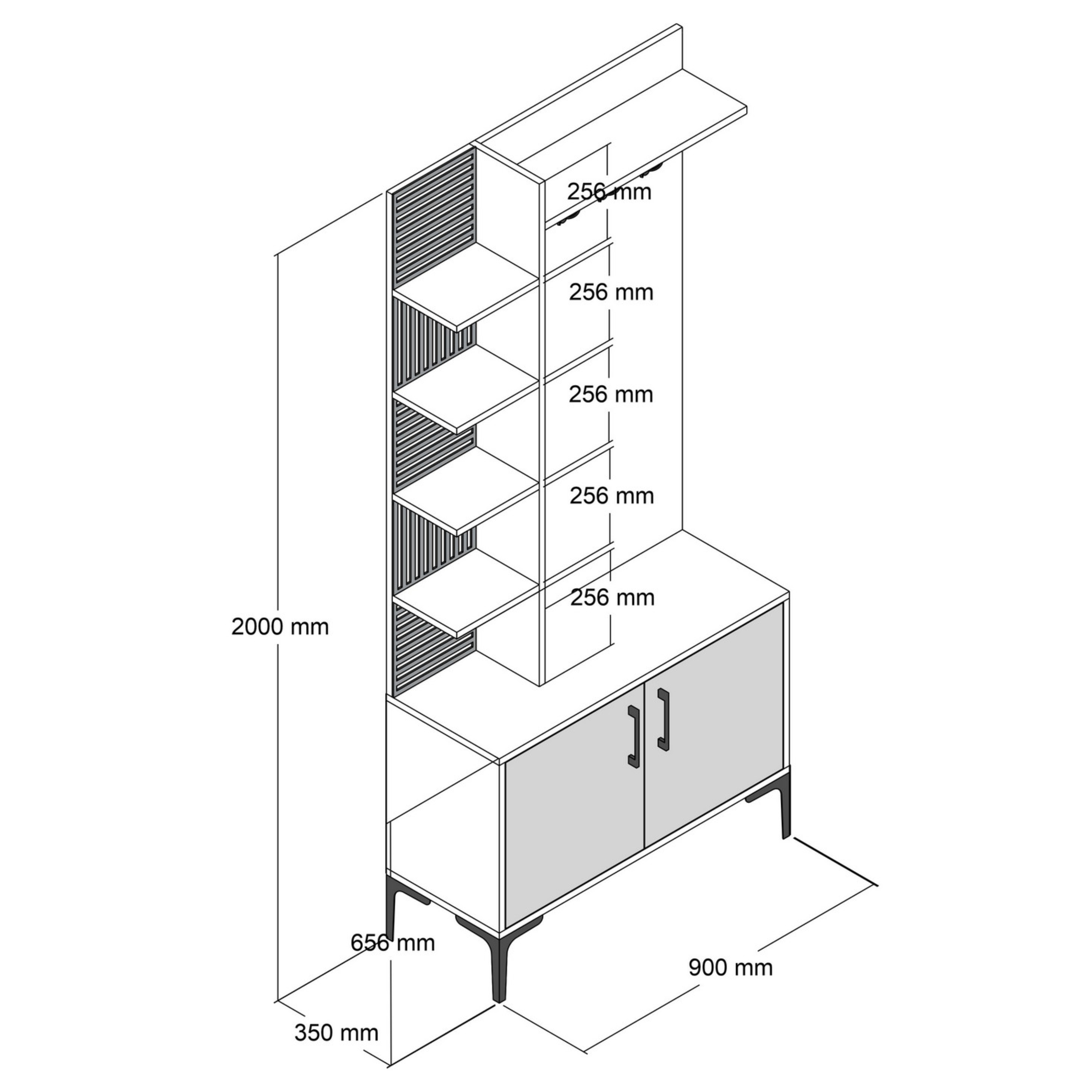 Sestava nabízí dostatek úložného prostoru v podobě 7 polic, z nichž 2 jsou ukryty za otočnými dveřmi, které jsou pro snadnou manipulaci vybaveny kovovými úchyty. Nechybí ani 4 kovové dvojité háčky, na které si můžete pověsit nejen často nošené kabáty či bundy, ale i různé módní doplňky.