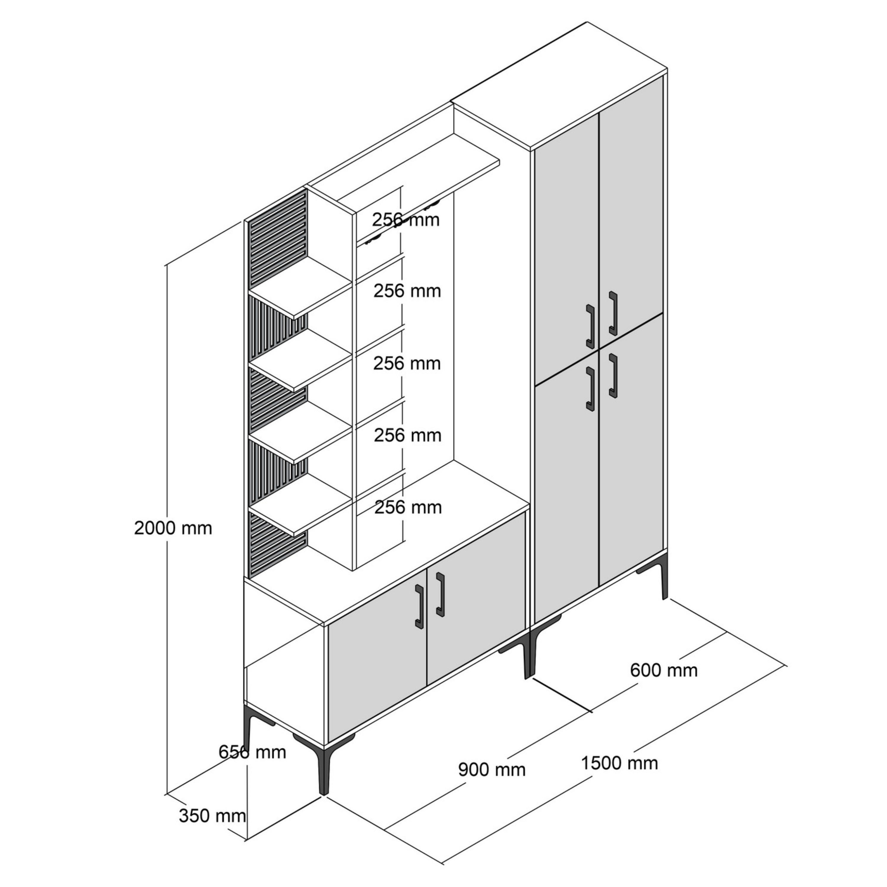 Sestava nabízí velké množství úložného prostoru v podobě 12 polic, z nichž 7 je kryto otočnými dveřmi, které jsou pro snadnou manipulaci osazeny kovovými úchyty. Nechybí ani 4 kovové dvojité háčky, na které si můžete pověsit nejen často nošené kabáty či bundy, ale i různé módní doplňky.
