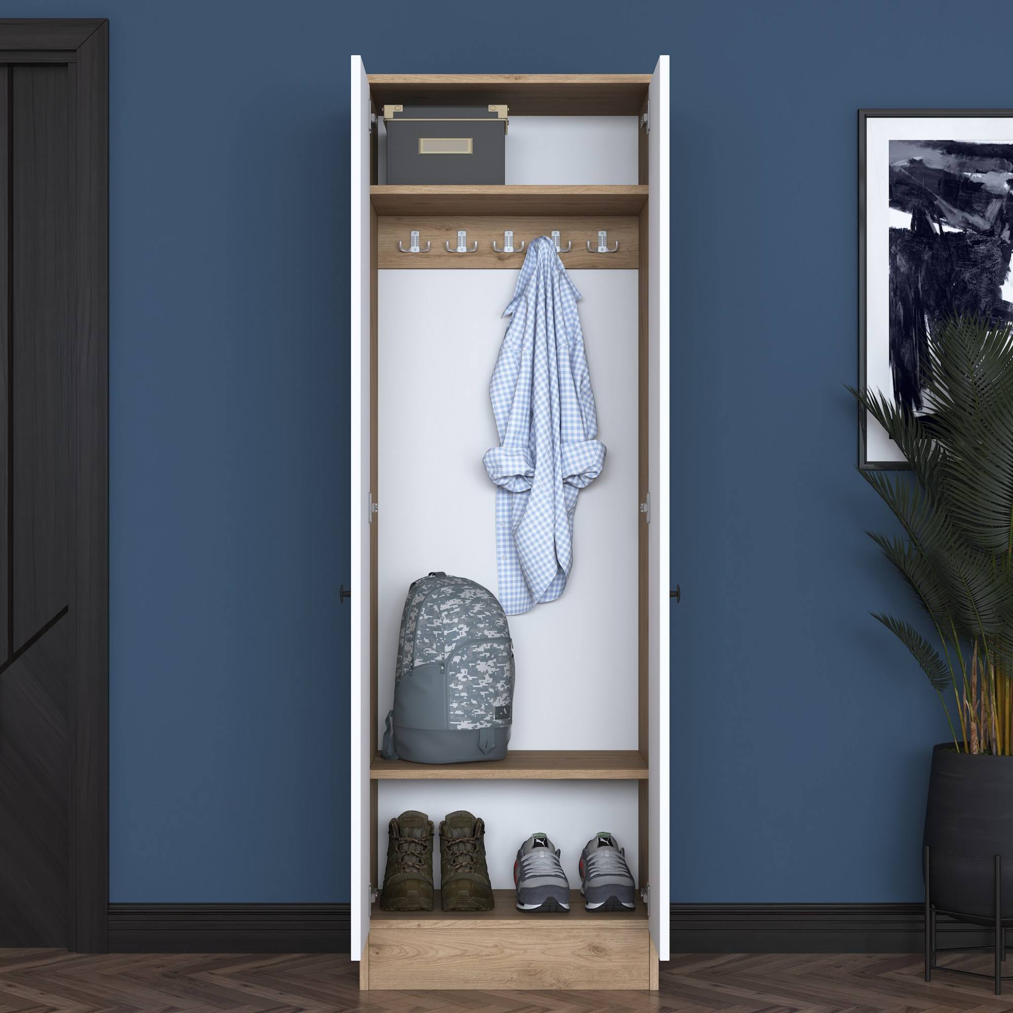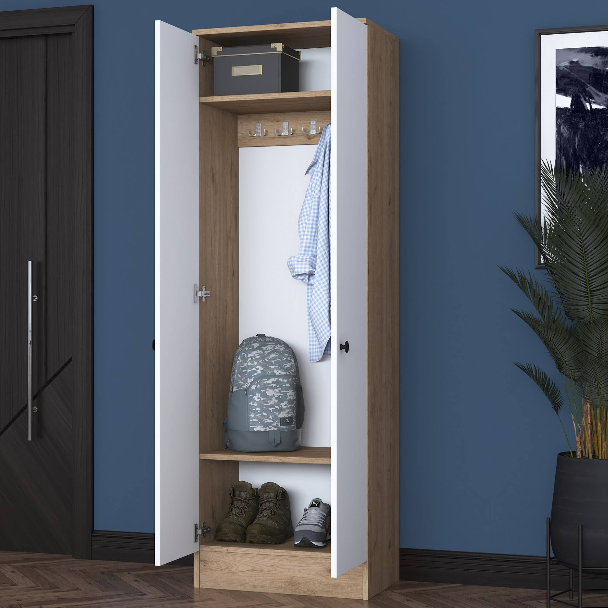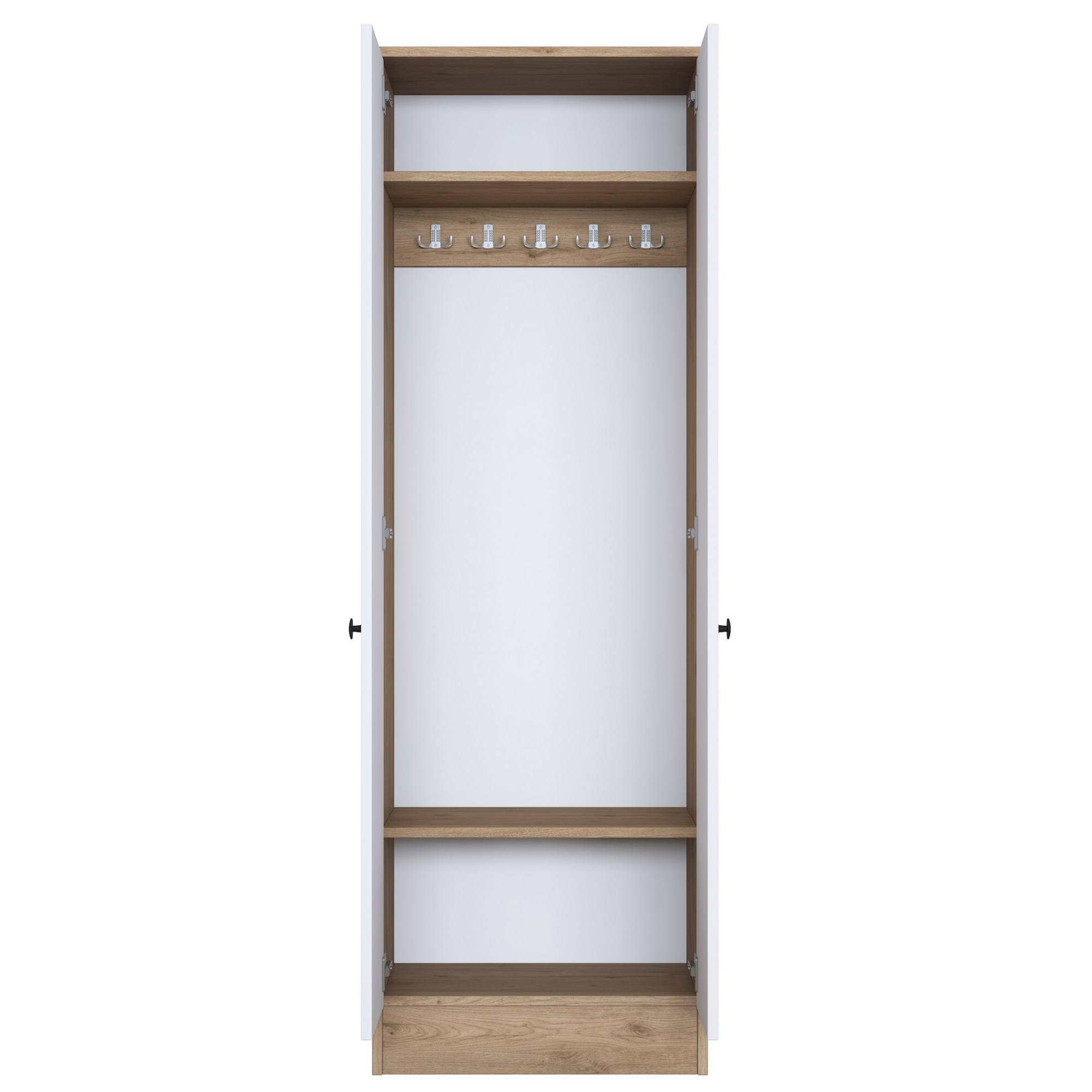 Skříň nabízí dostatek úložného prostoru. Za jejími dveřmi, které jsou pro lepší manipulaci vybaveny úchyty, se nacházejí nejen 2 vložené police. Nechybí ani 5 dvojitých háčků, na které si můžete pověsit bundy, kabáty i módní doplňky.